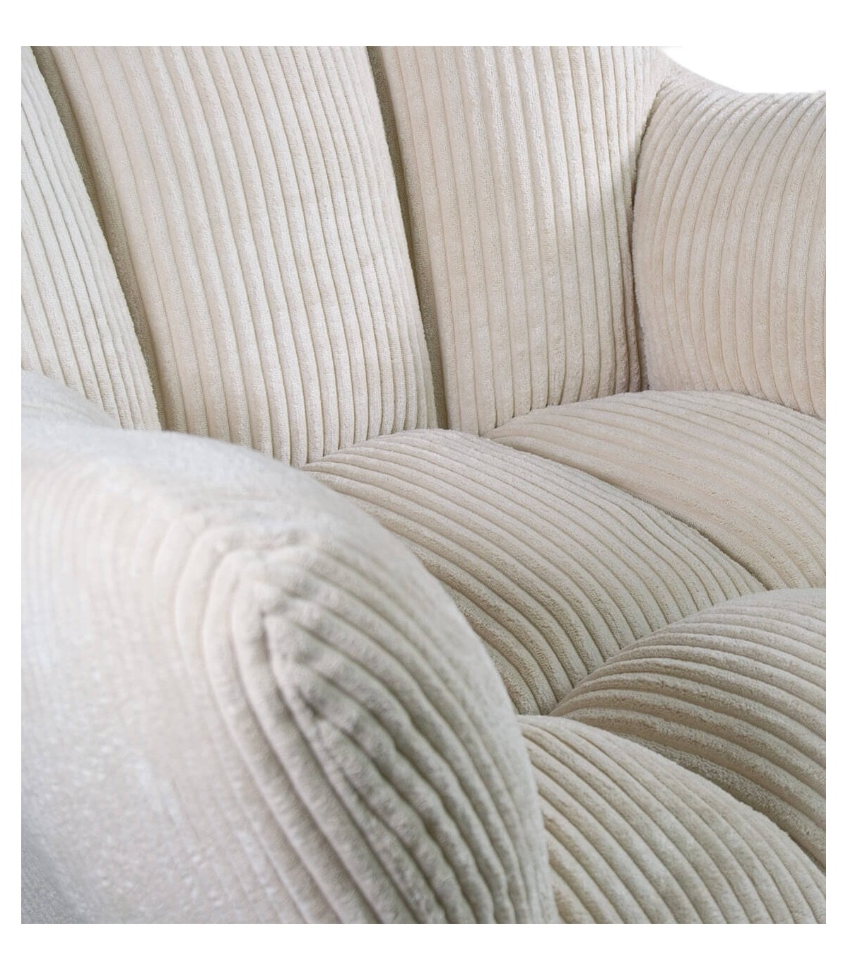 Acabado, madera de haya en color natural, metal negro, textil pana de tacto suave color beige.