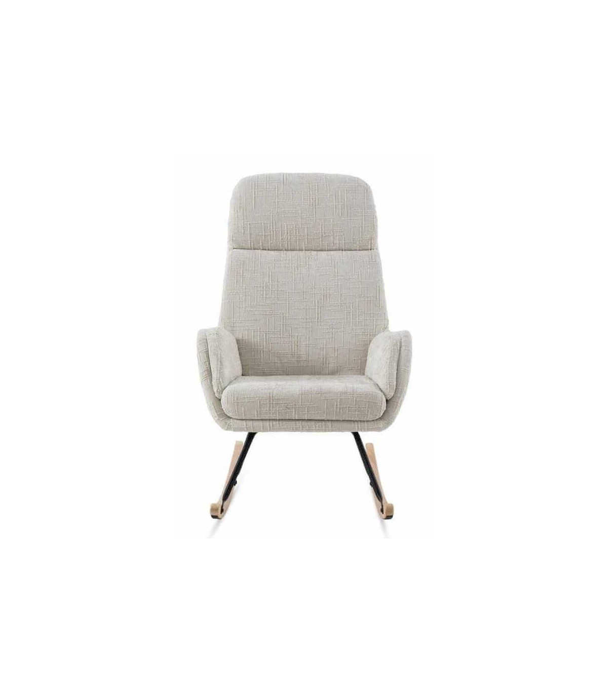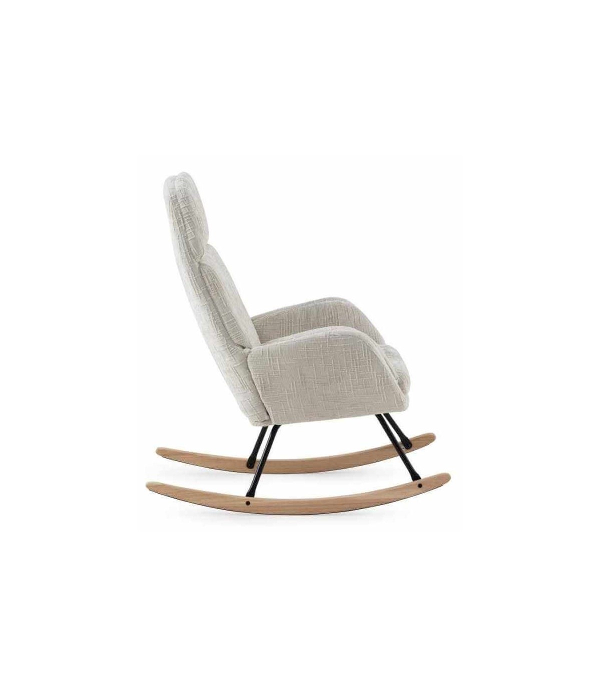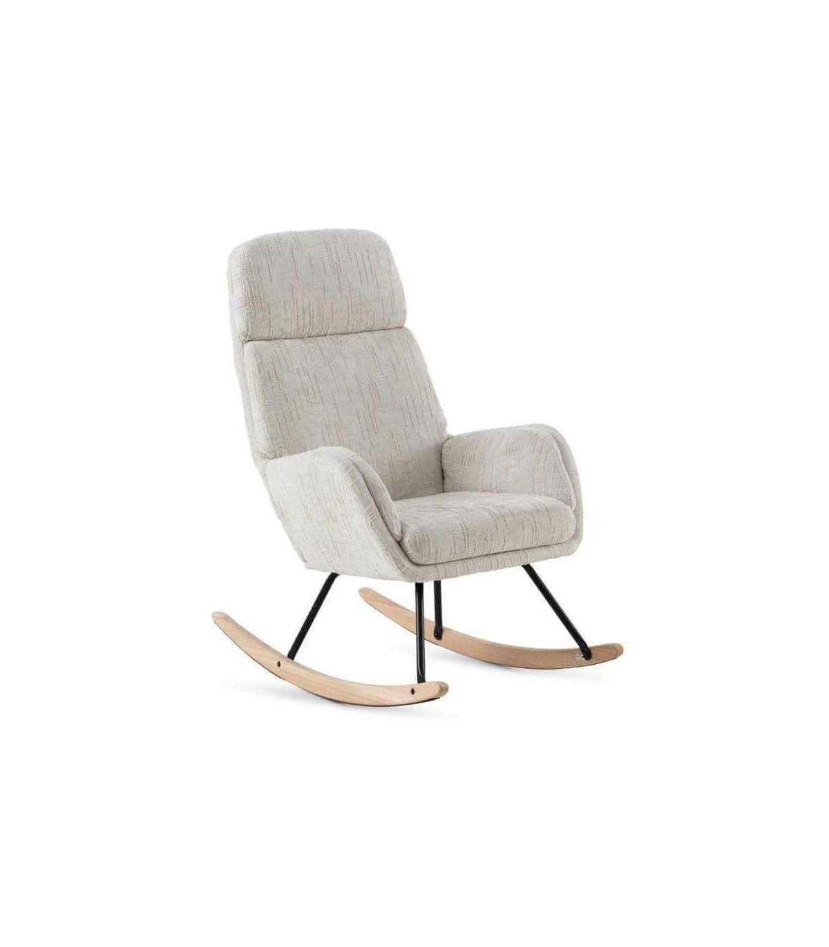 Las patas metálicas con base de madera curvada garantizan un balanceo estable y silencioso. Ideal para momentos de descanso o lactancia, su diseño nórdico combina líneas limpias y materiales cálidos. Aporta serenidad y elegancia natural a cualquier rincón del hogar, creando una atmósfera íntima y acogedora.