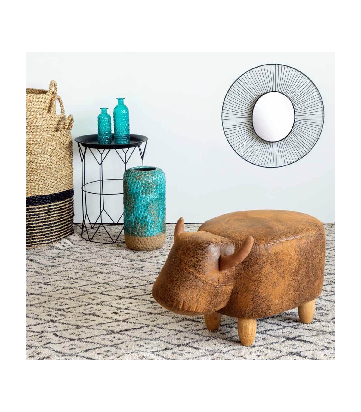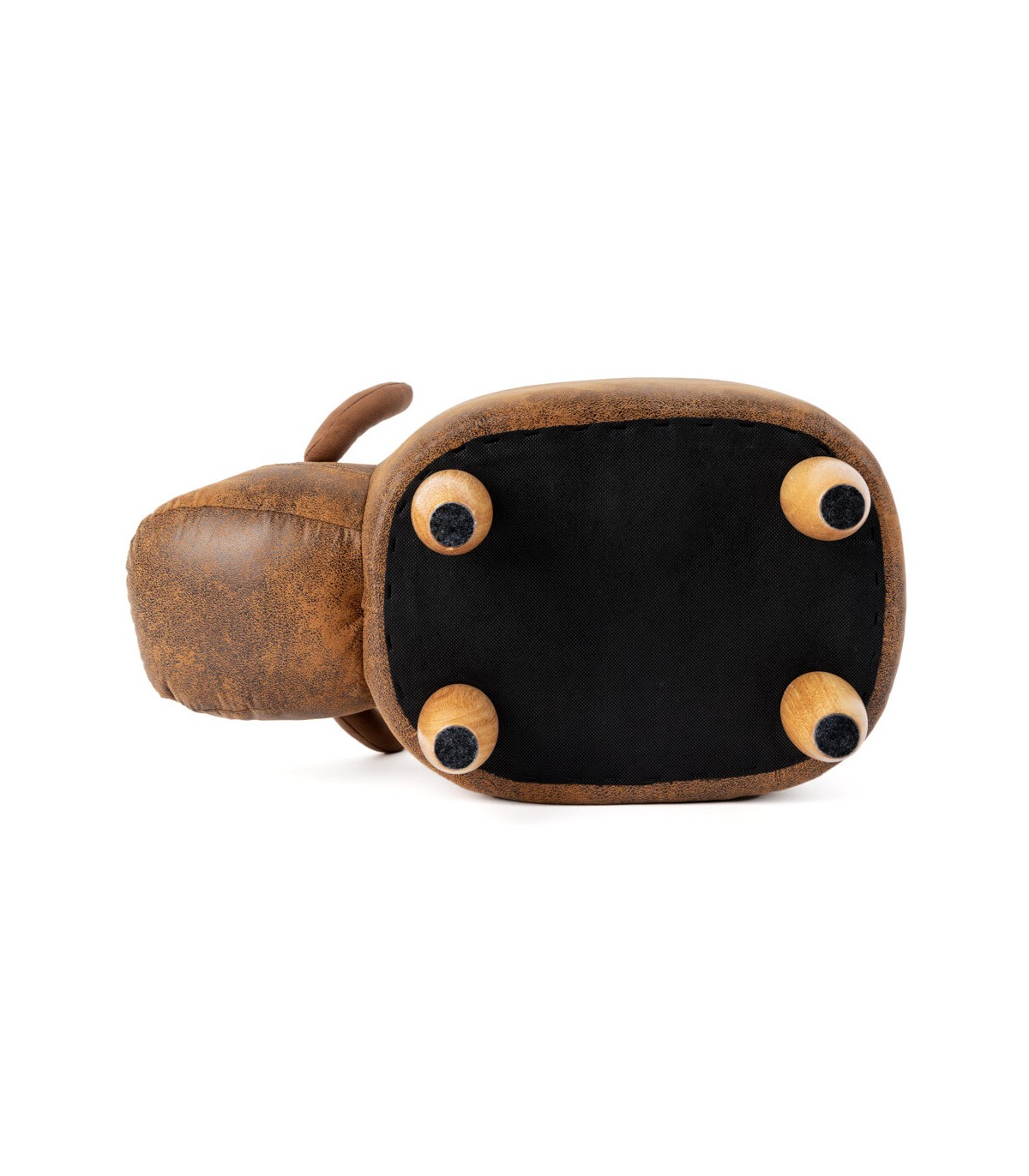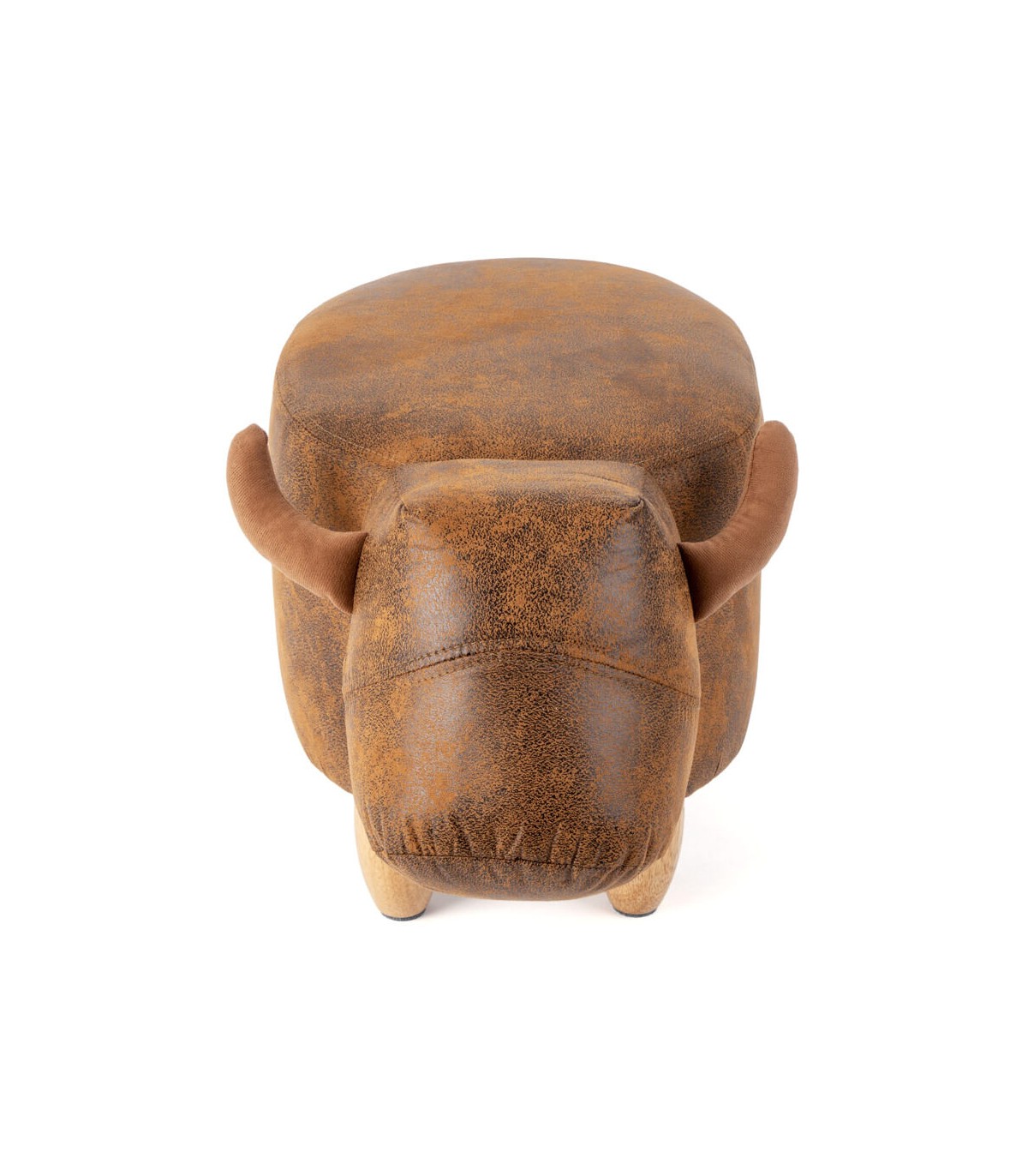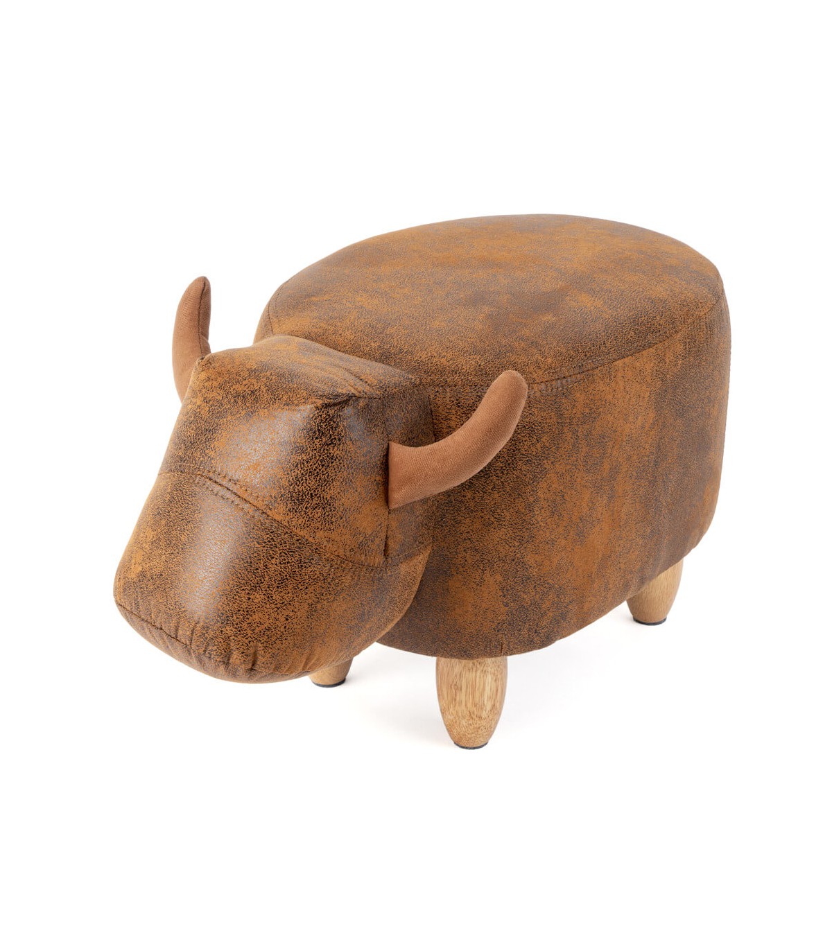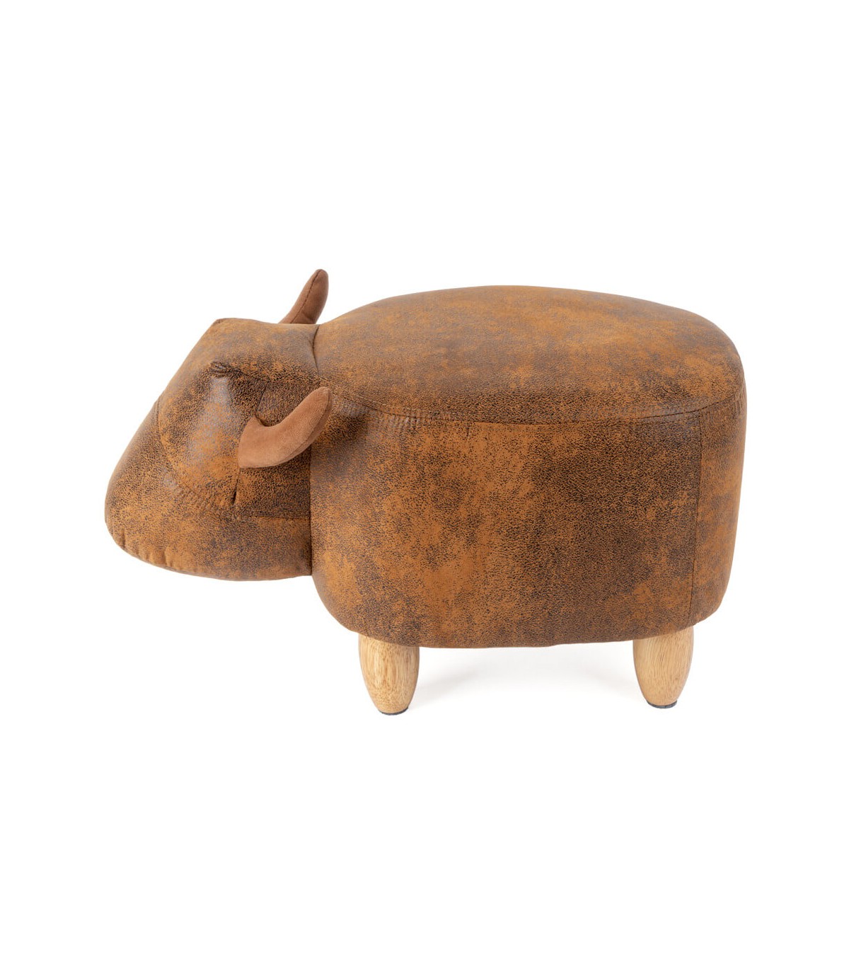 Puf reposapiés estilo vintage, con forma de vaca, realizado en polipiel marrón con las patas en madera natural, perfecta para utilizar como asiento o reposapiés, un puf muy original perfecto para decorar tu casa.