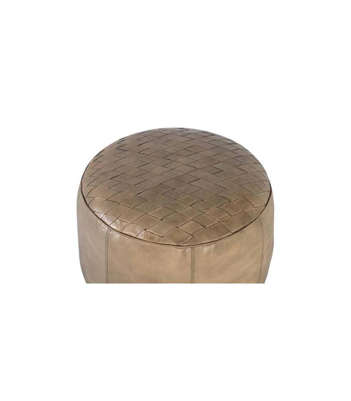 Este puf redondo de diseño sencillo y elegante está tapizado en auténtica piel de bovino en tono marrón claro, aportando textura, suavidad y un toque de calidez natural. Su superficie superior presenta un atractivo detalle trenzado que añade valor artesanal al conjunto.