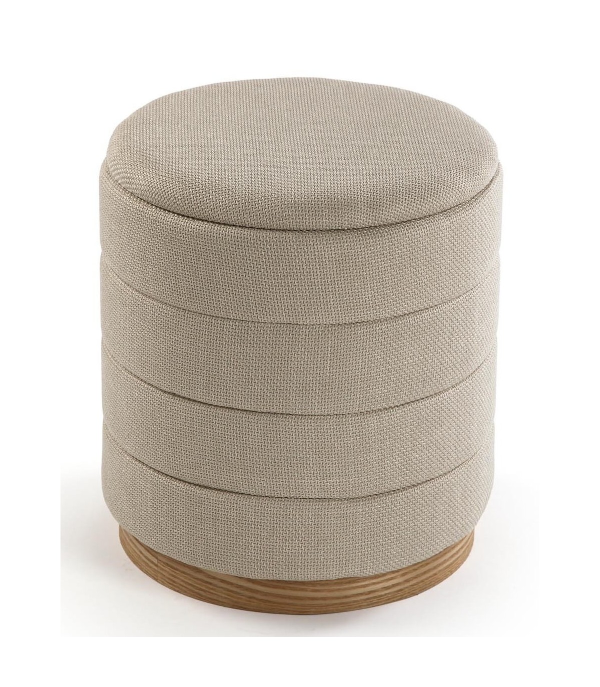 Tapizado en tela chenilla beige y con base en madera natural, aporta calidez y textura a cualquier rincón del salón o dormitorio. Su forma compacta y elegante lo hace ideal como asiento auxiliar, reposapiés o complemento decorativo versátil.