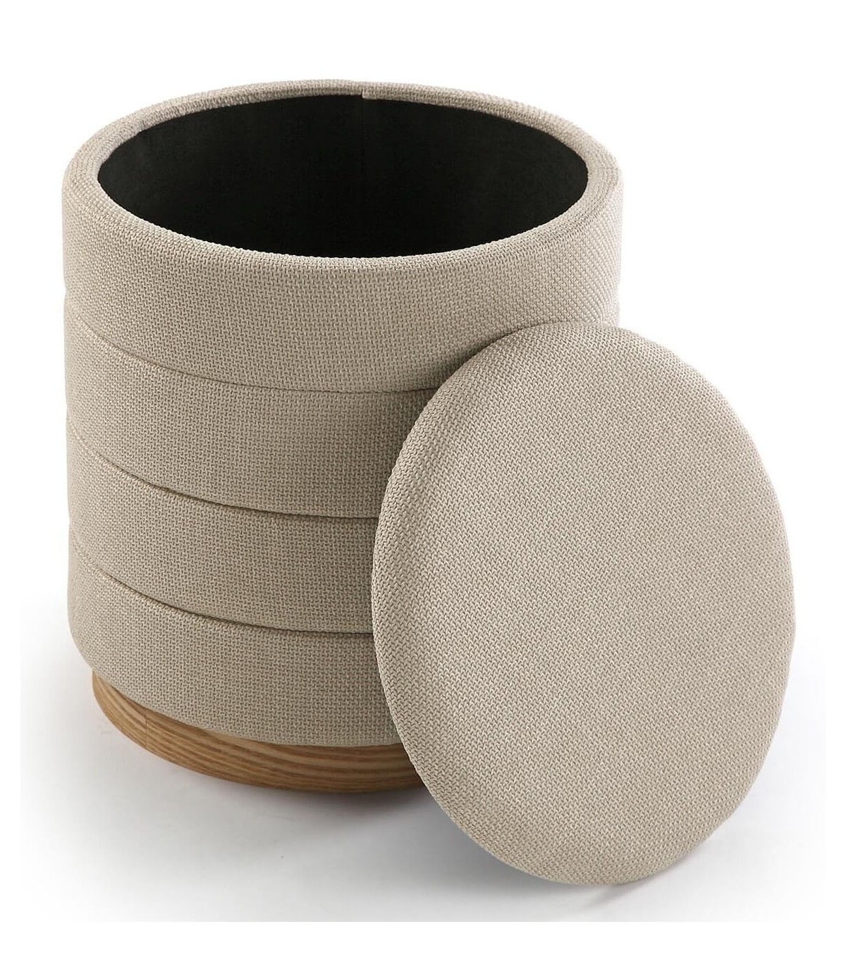 🪑 Puf Redondo con Almacenaje – Tela Chenilla Beige. Este puf redondo de estilo contemporáneo se convierte en un práctico espacio de almacenaje gracias a su interior oculto bajo una tapa acolchada.