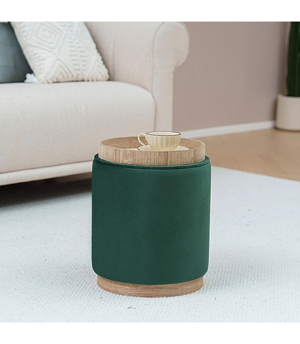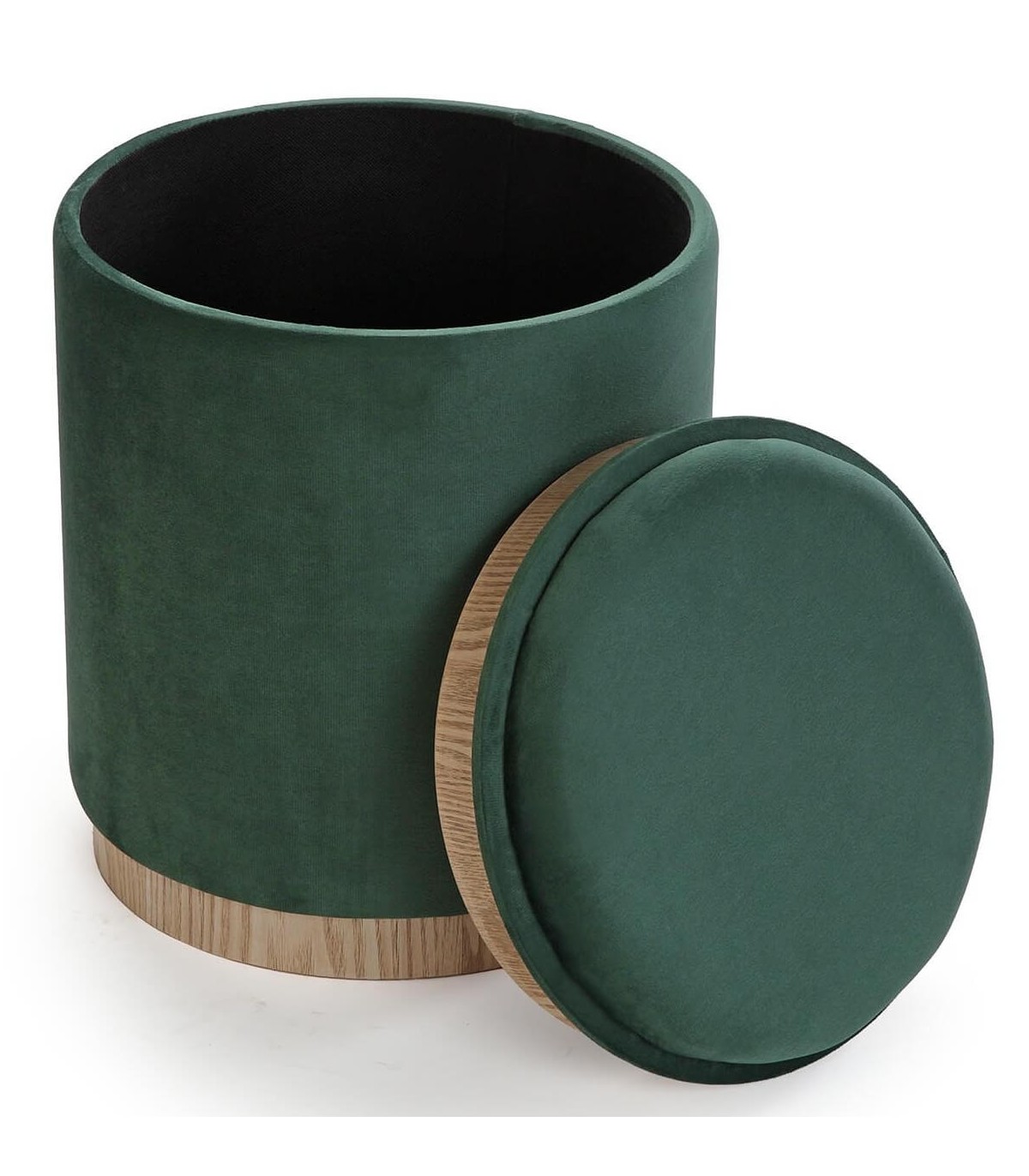 Este puf redondo une diseño contemporáneo y funcionalidad en una pieza versátil que encaja en cualquier rincón de la casa. El tapizado en terciopelo verde añade un punto de color elegante y suave al tacto, mientras la base de madera natural aporta equilibrio y calidez.