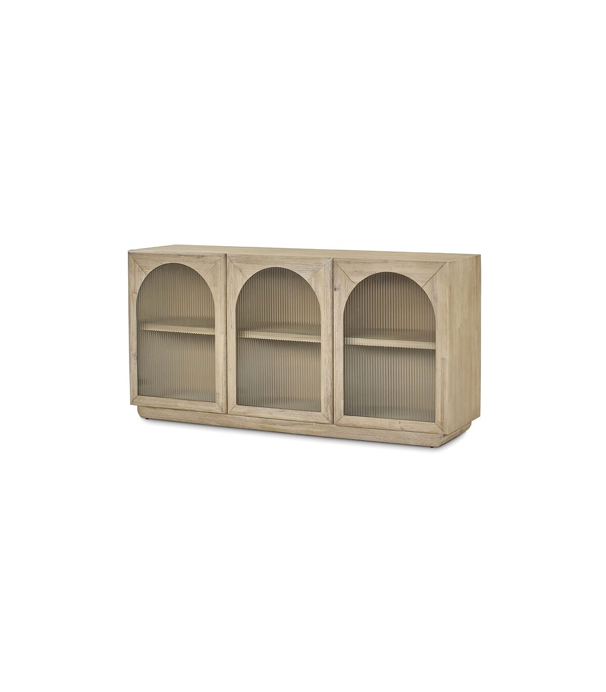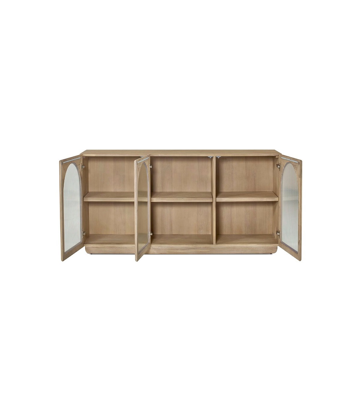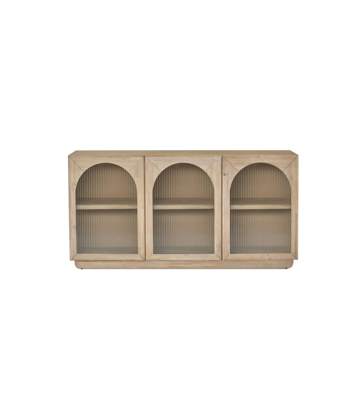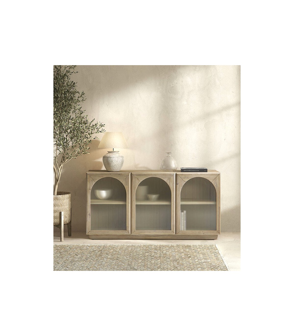 Aparador con 3 puertas de cristal corrugado, realizado en madera de mango acabado natural, un aparador de gran capacidad ligero visualmente, un aparador muy decorativo que puede encajar en muchos estilos de decoración.