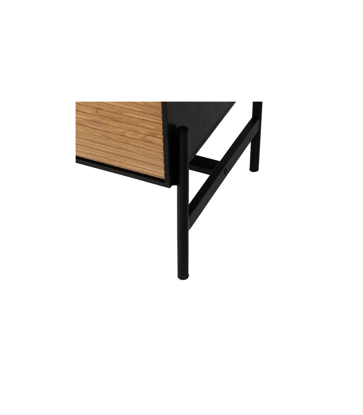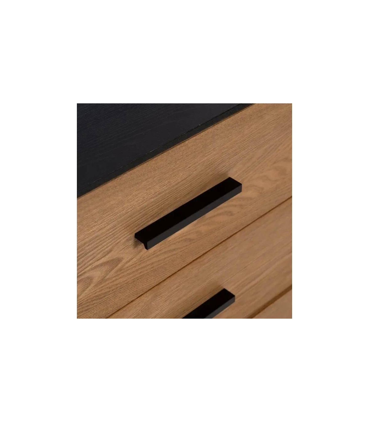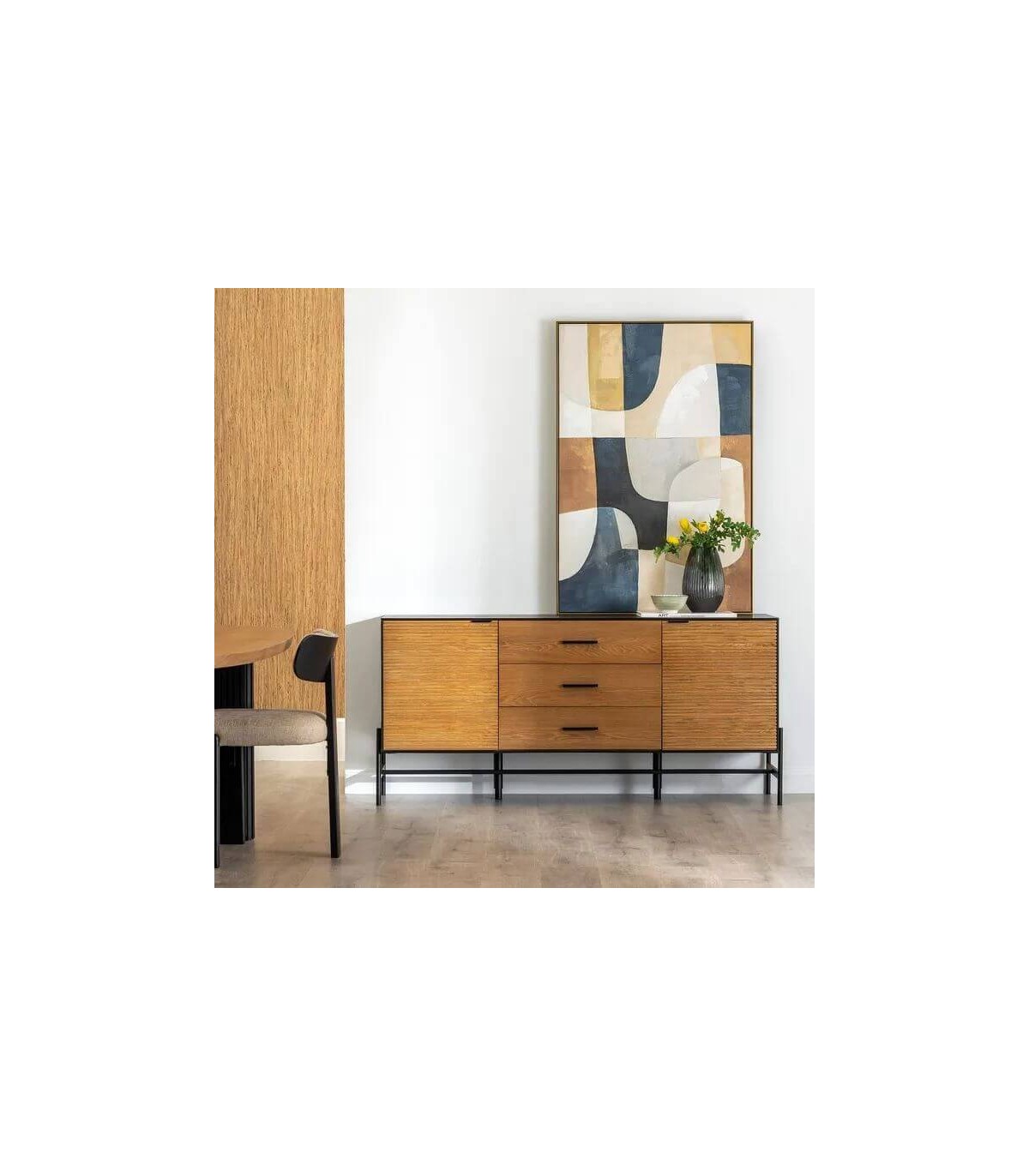 Aparador, realizado en dm acabado fresno natural y negro con las patas en metal negro, de estilo industrial. Dispone de 2 puertas y 3 cajones, perfecto para tu salón comedor.