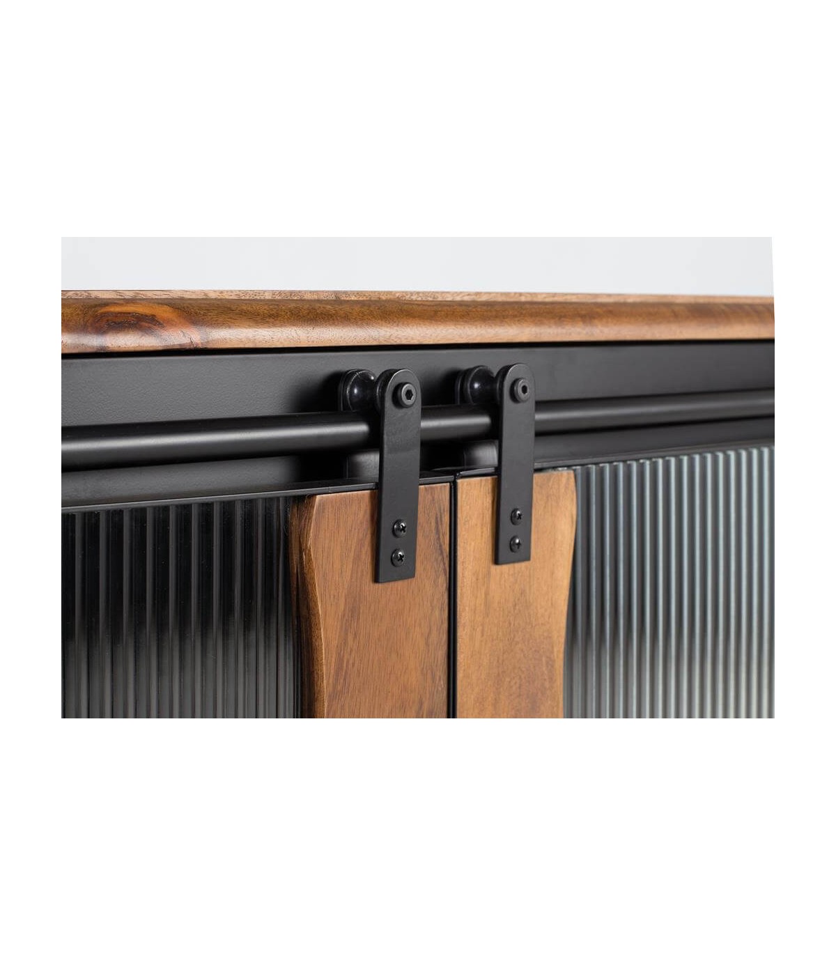 Aparador de nuestra colección de muebles Ulises, una colección puramente industrial, realizada en madera maciza de mango, jugando con los contrastes de la madera y el metal y con esa puerta corredera en cristal corrugado que le da un toque diferente.