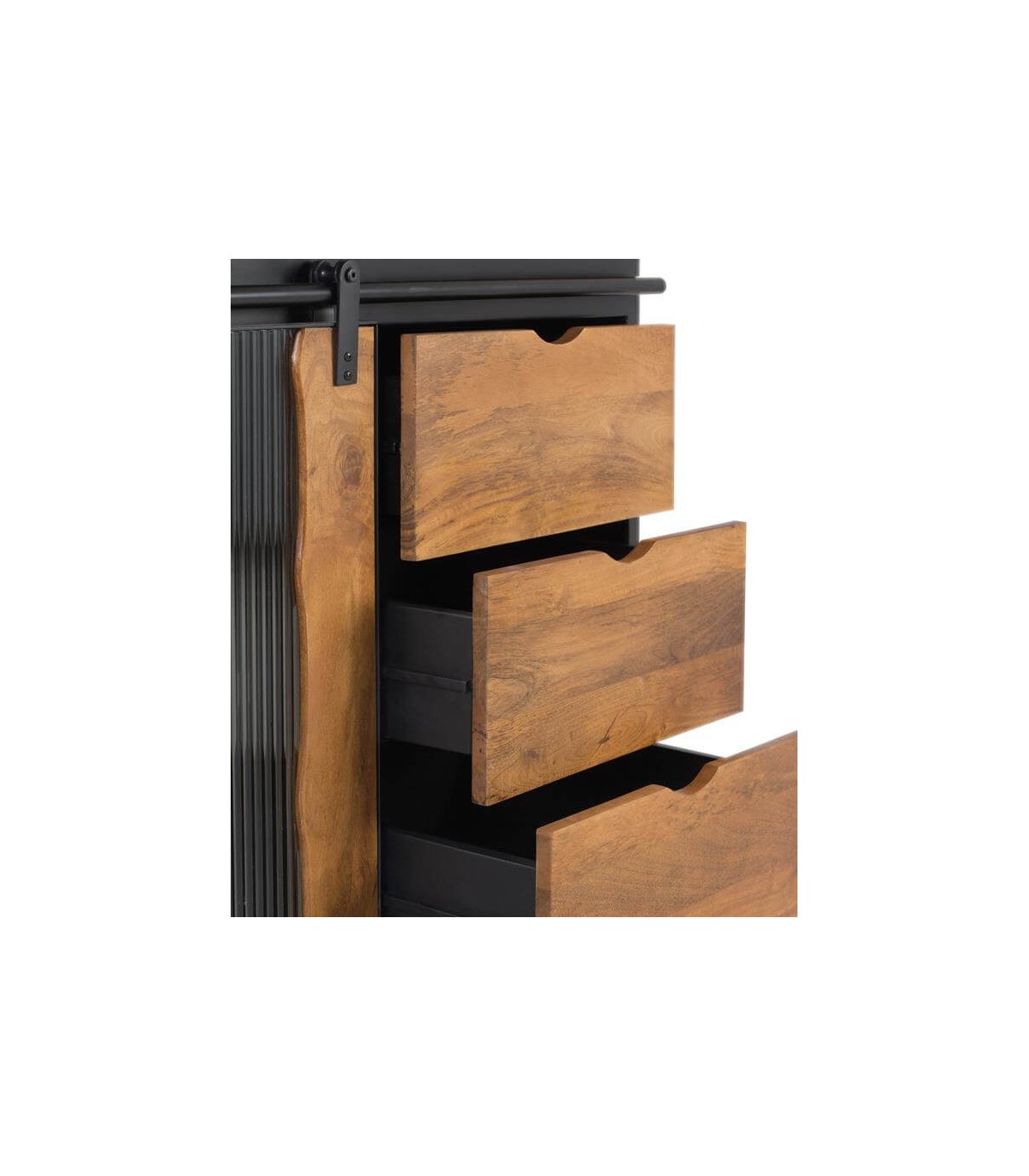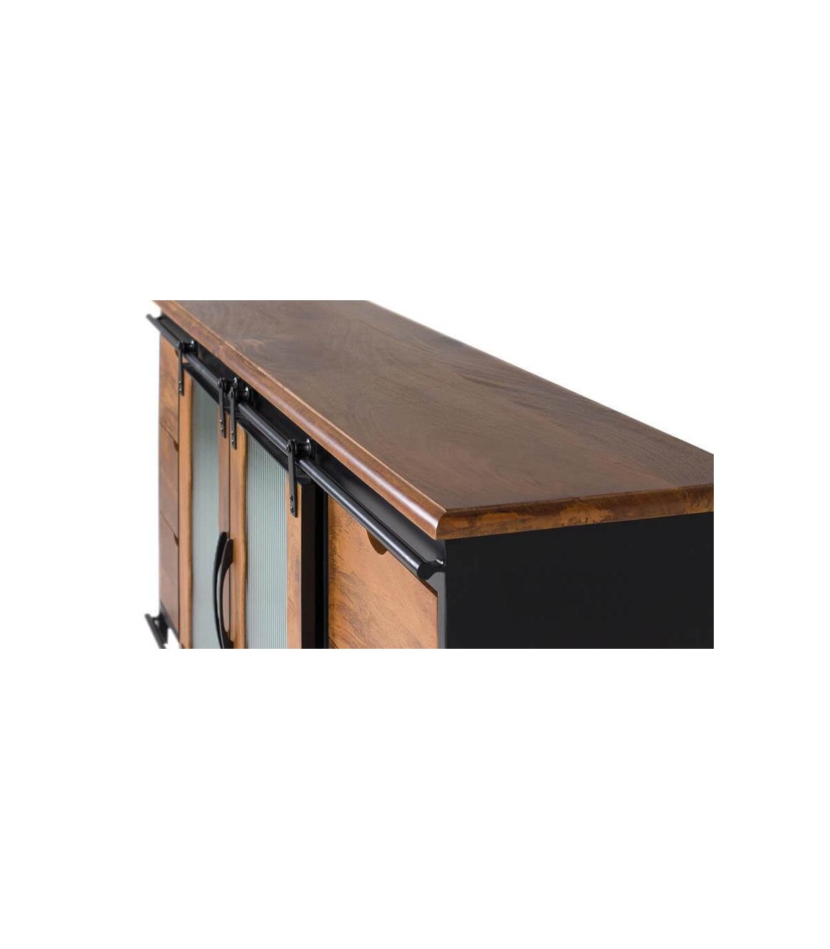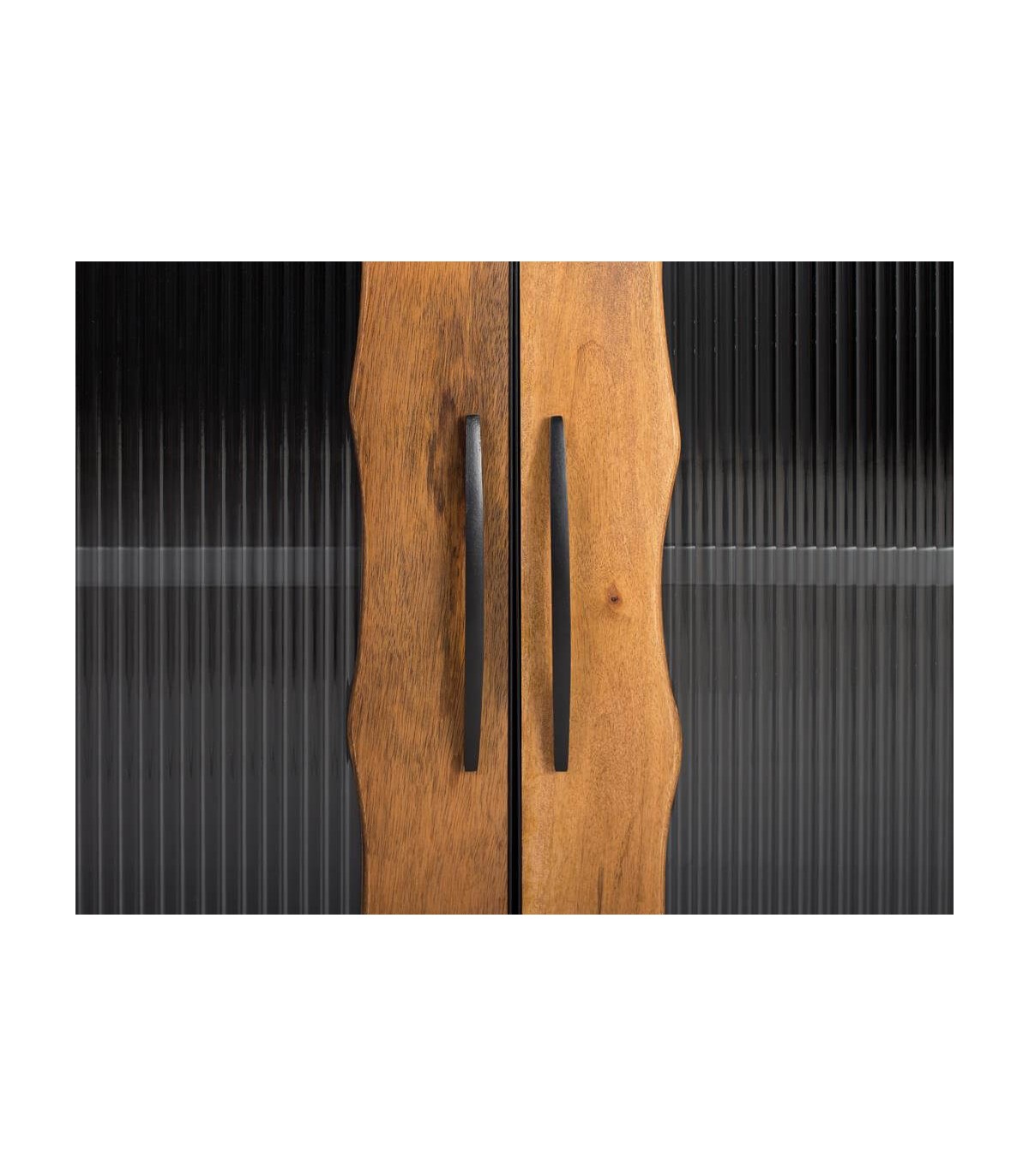 - Acabado, artesanal, estructura en madera maciza de mango acabado natural, puerta, guías y tiradores en metal negro, cristal corrugado.