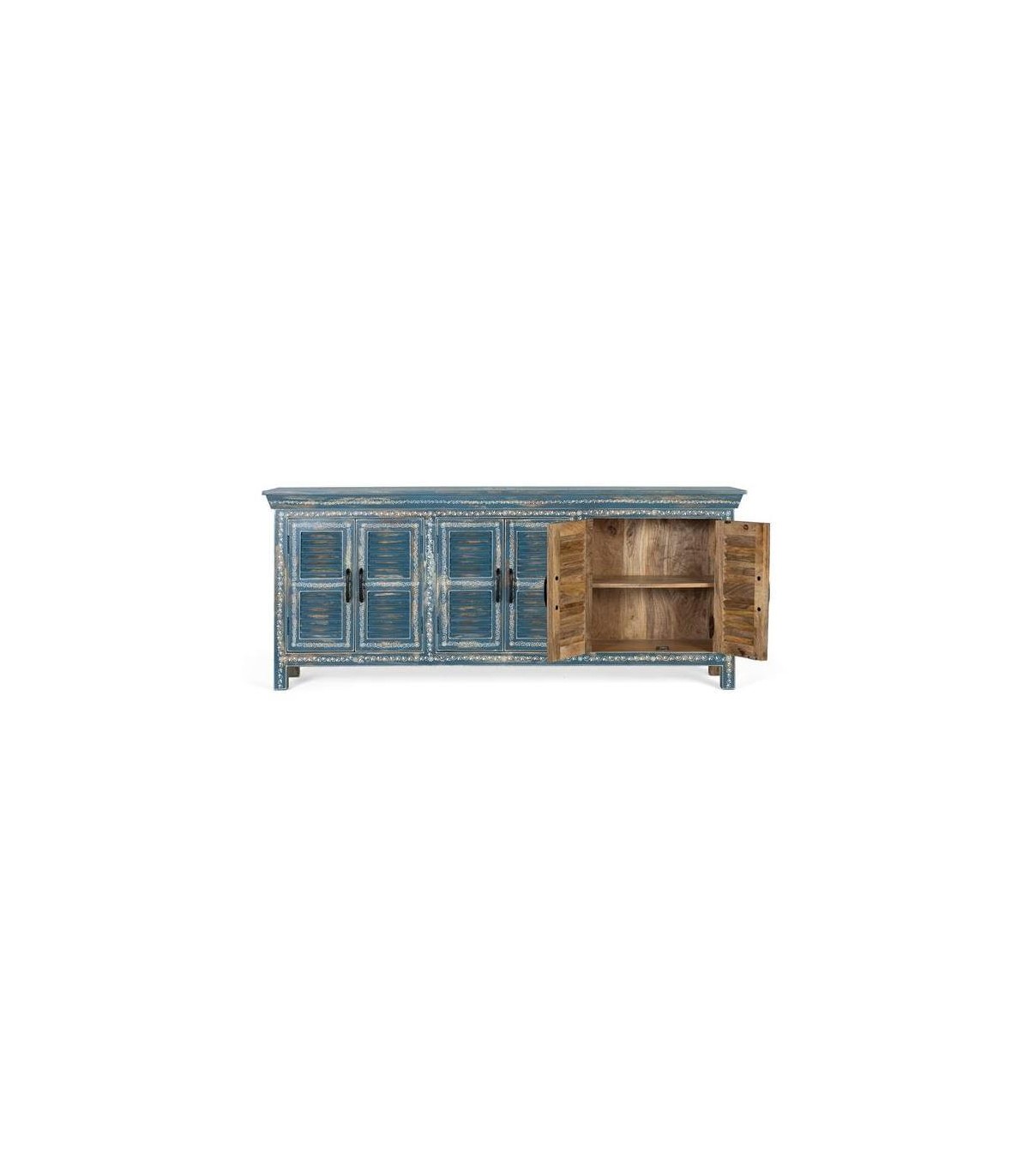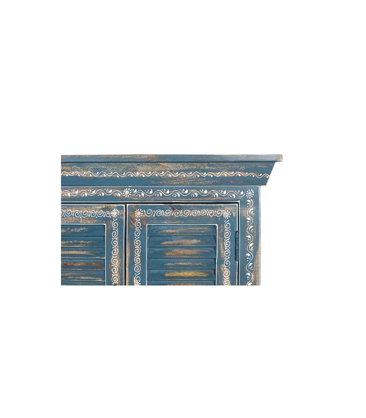 Aparador con 4 puertas realizado en madera decapada en color azul con detalles pintados a mano en color blanco. , una colección de importación realizada en la india, un mueble de buena calidad trabajado en madera maciza y con todos los detalles pintados a mano, una colección perfecta para quien quiere darle un toque étnico a su decoración.
