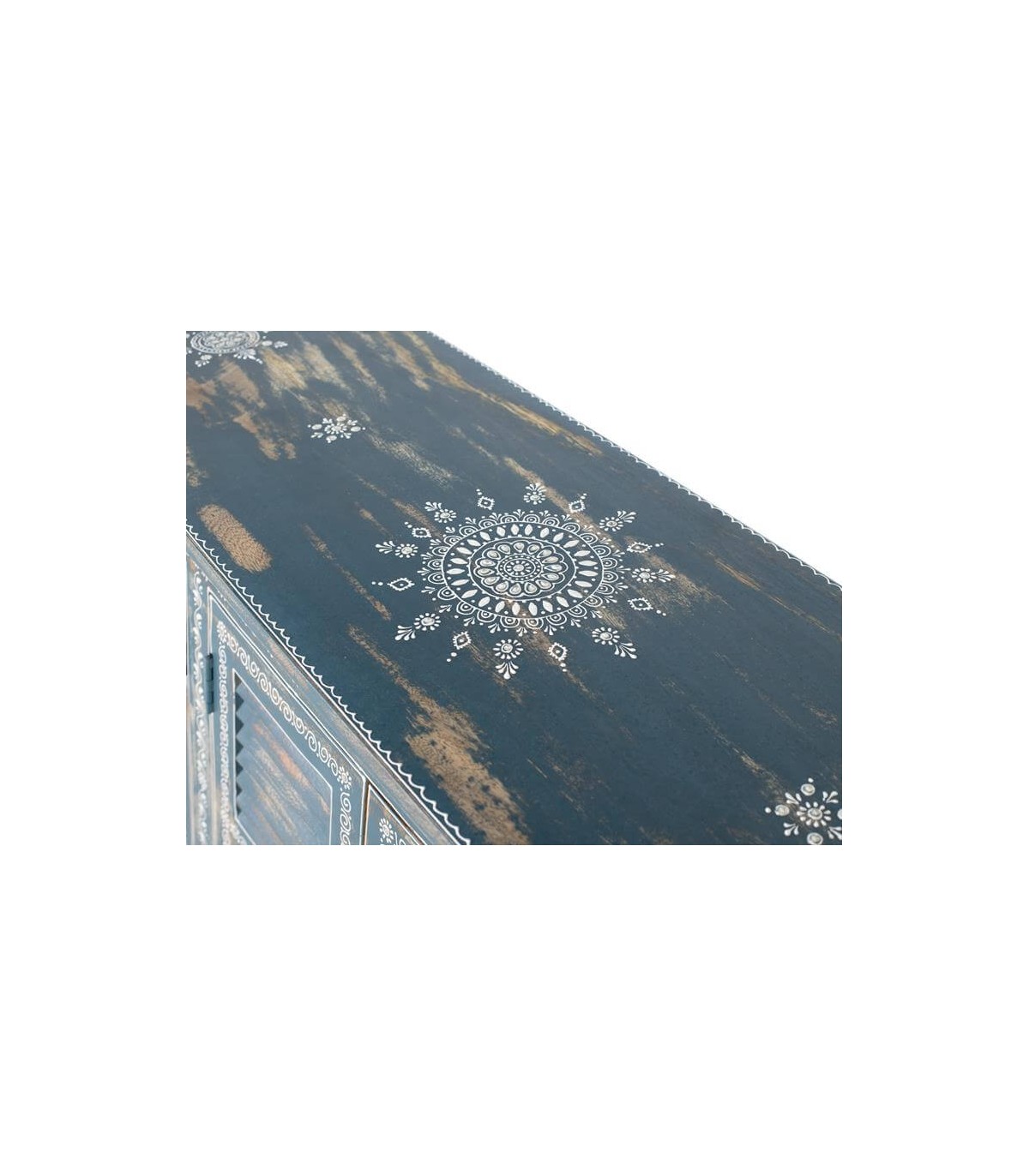 Acabado, madera decapada en color azul con detalles pintados a mano en color blanco. Fabricación artesanal. entendemos las variaciones de tonalidad, tamaño y forma o ciertas imperfecciones (grietas, nudos, marcas) como un valor añadido que la convierten en pieza única.