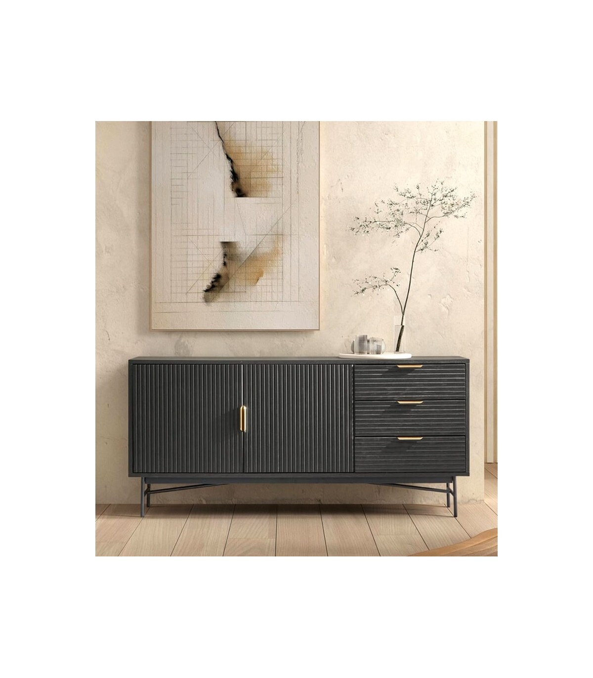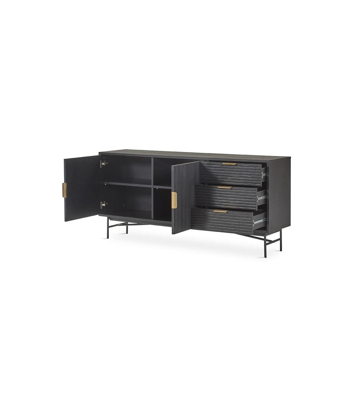 Aparador realizado en madera de roble teñido en color negro con las patas en metal negro y un bonito tirador acabado oro. Un buen mueble de capacidad que encajará perfectamente en tu salón comedor.