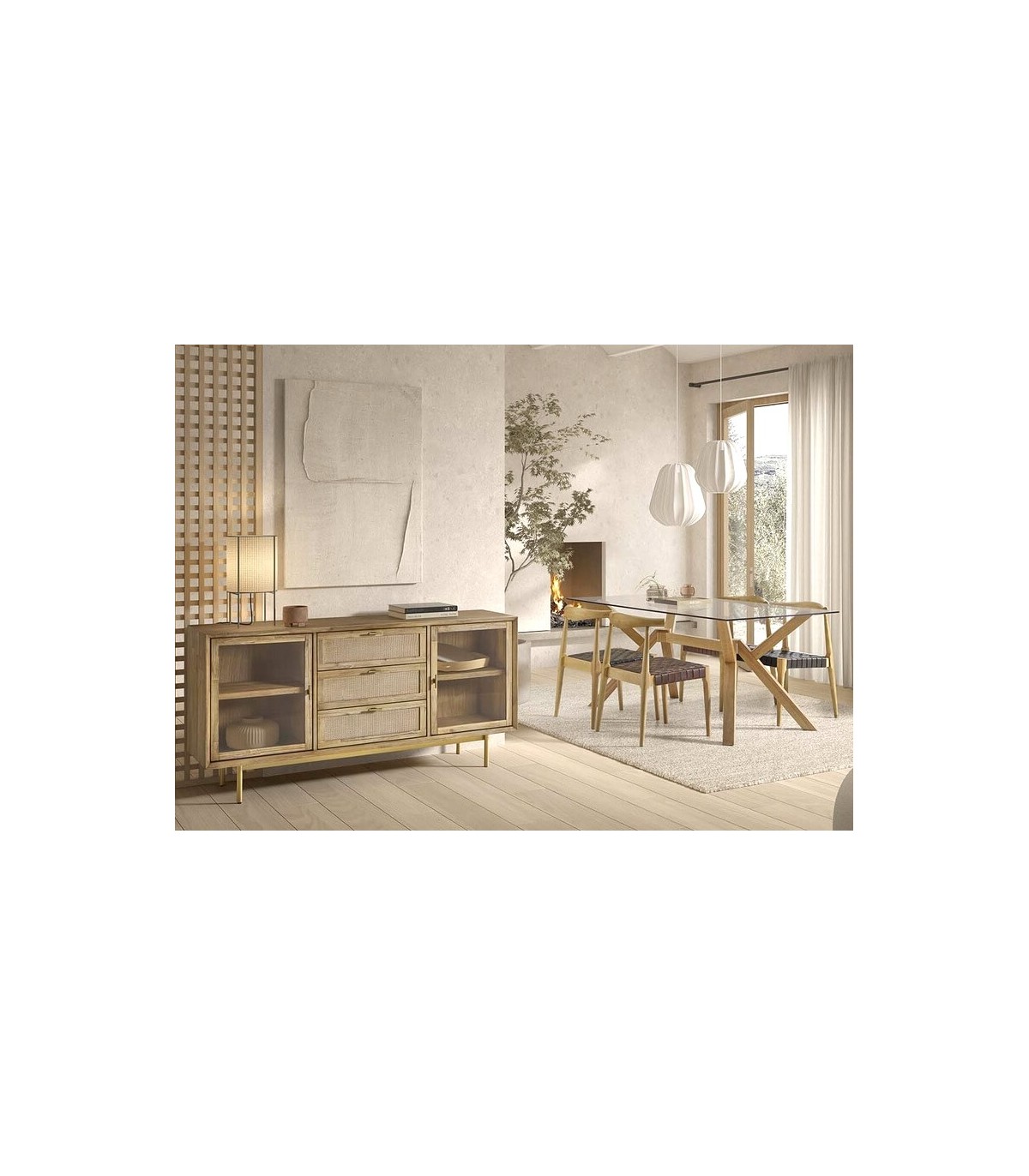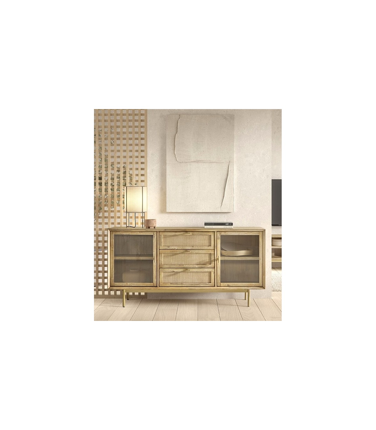 Bonito aparador de estilo colonial, con 2 puertas de cristal y 3 cajones, realizado en madera de mango, ratán naturales y cristal, patas metálicas. Perfecto para tu salón.