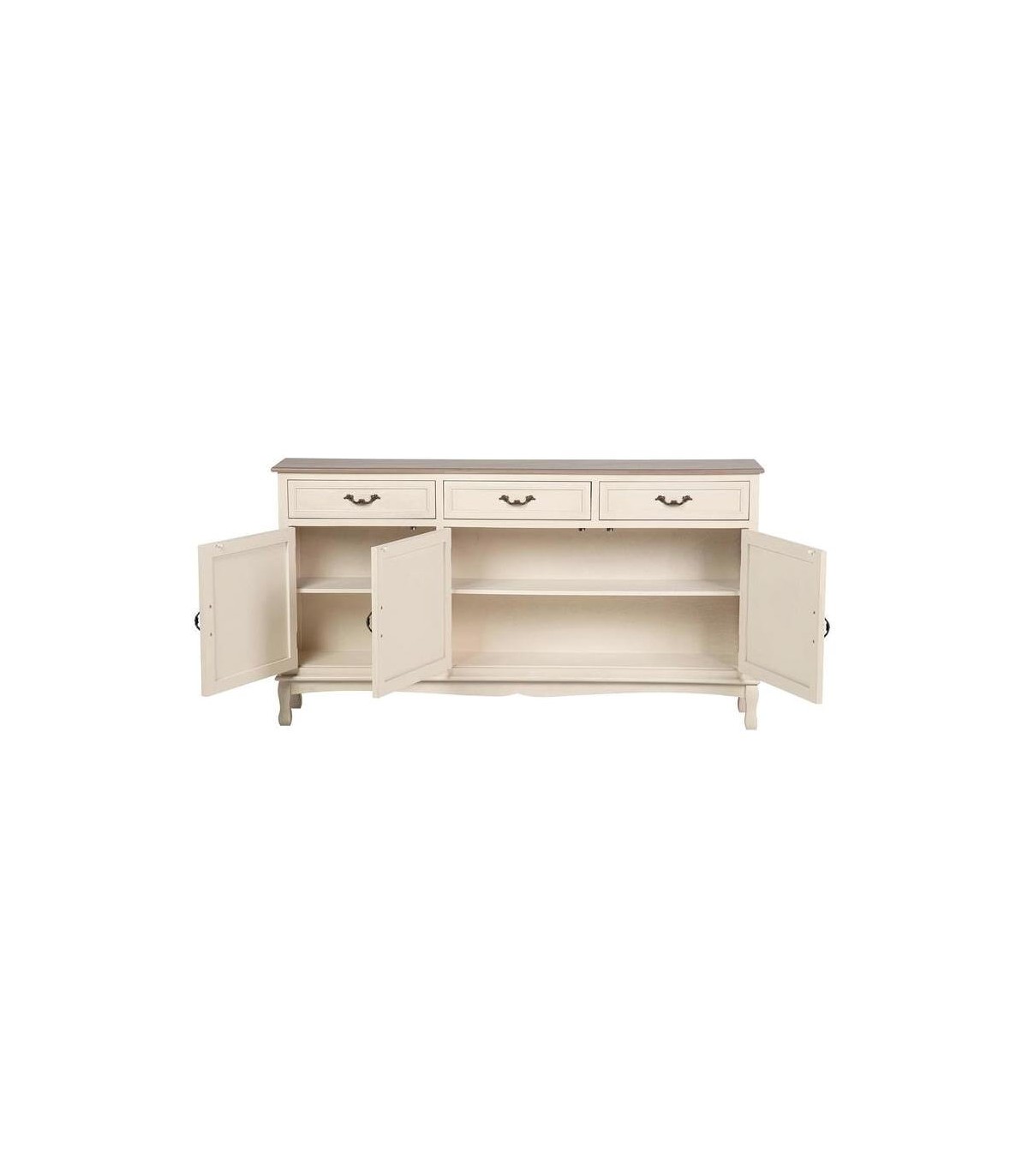 Las tres puertas y los tres cajones facilitan una organización clara y funcional para el día a día. La estructura alargada aporta orden visual manteniendo una presencia ligera y bien proporcionada. La tapa en madera tono nogal introduce contraste y profundidad frente al cuerpo lacado en beige.