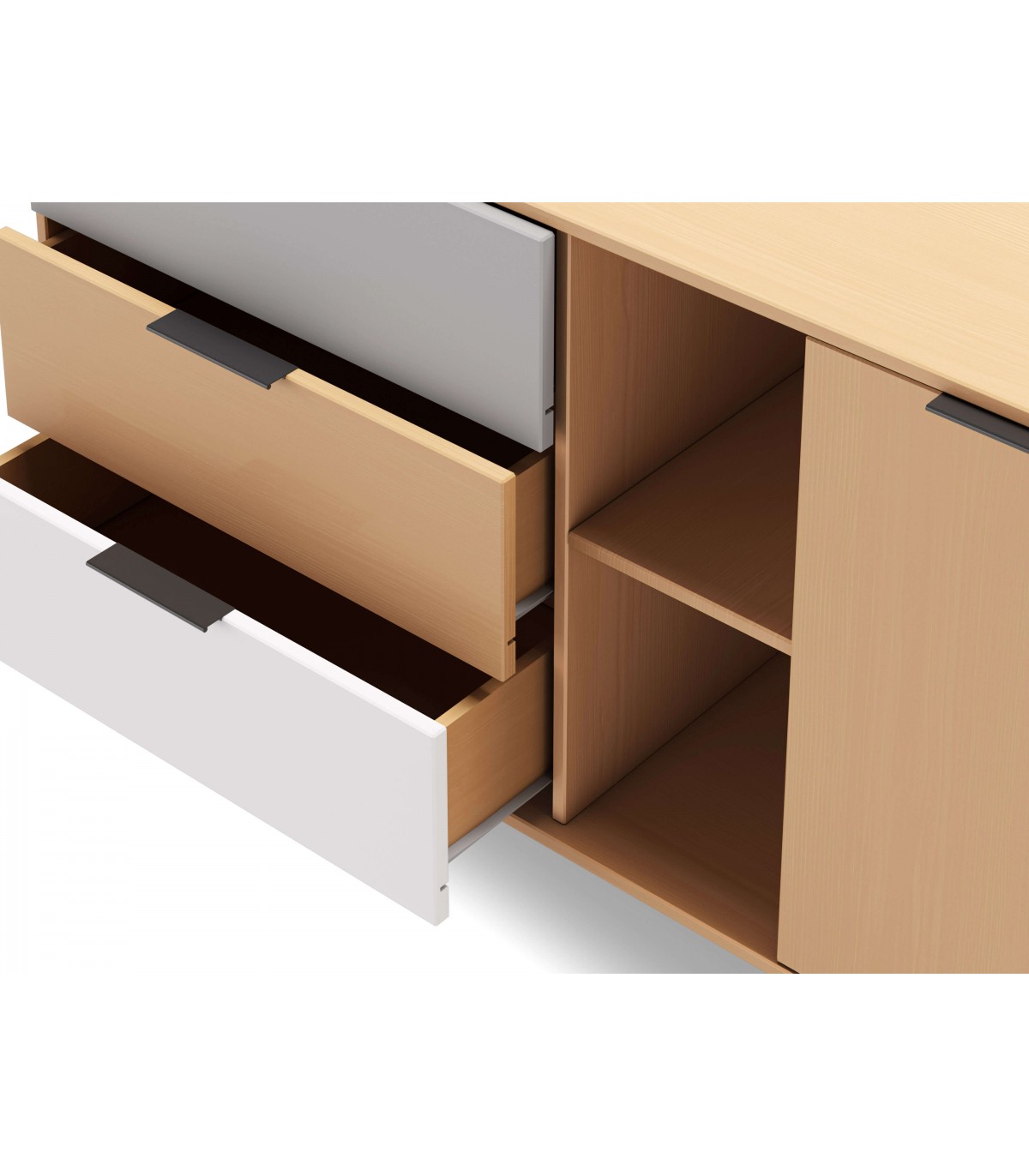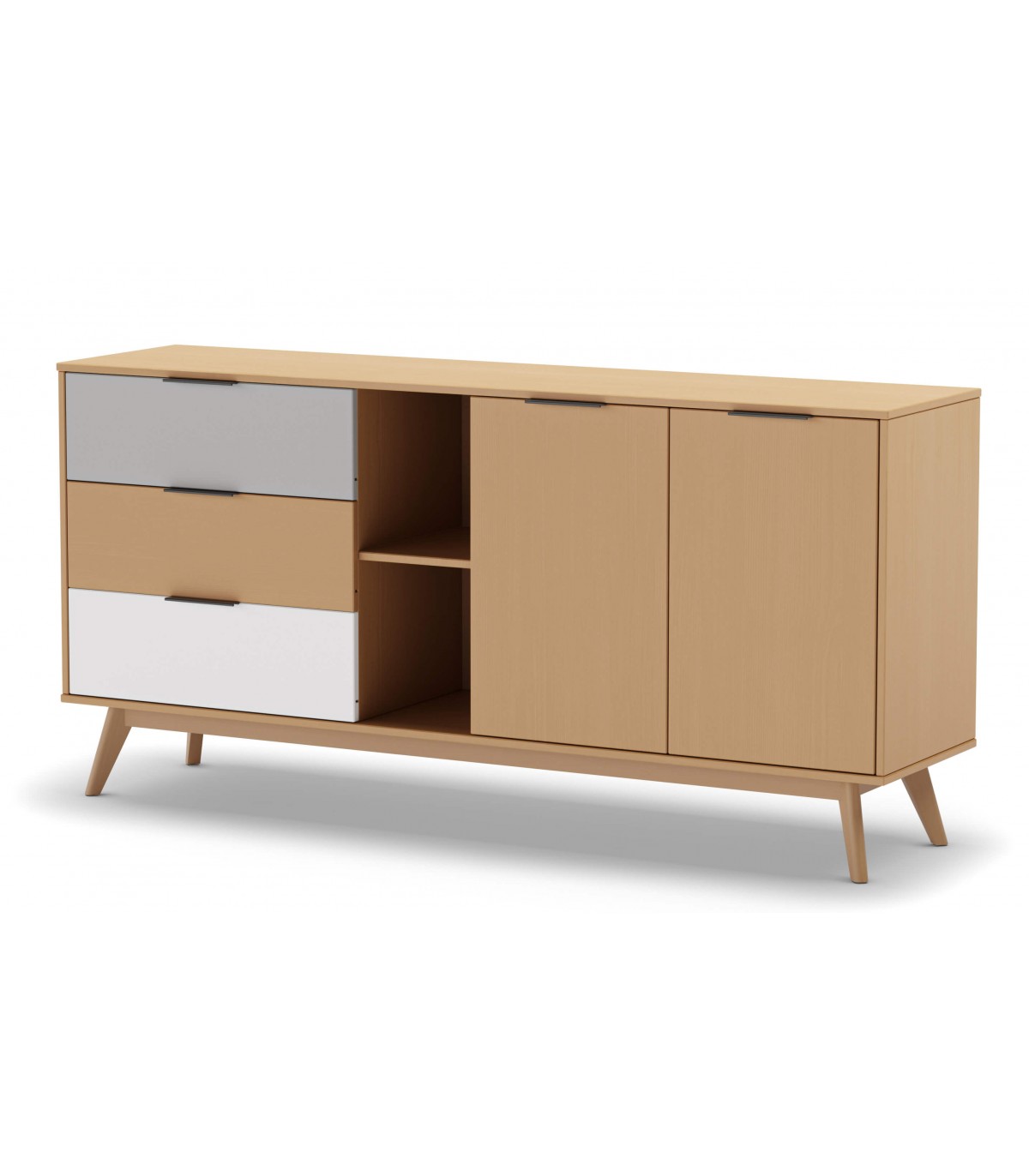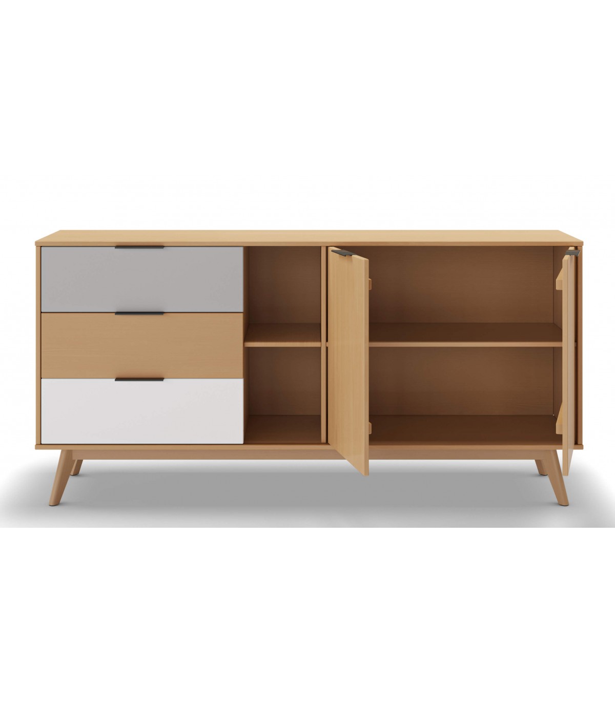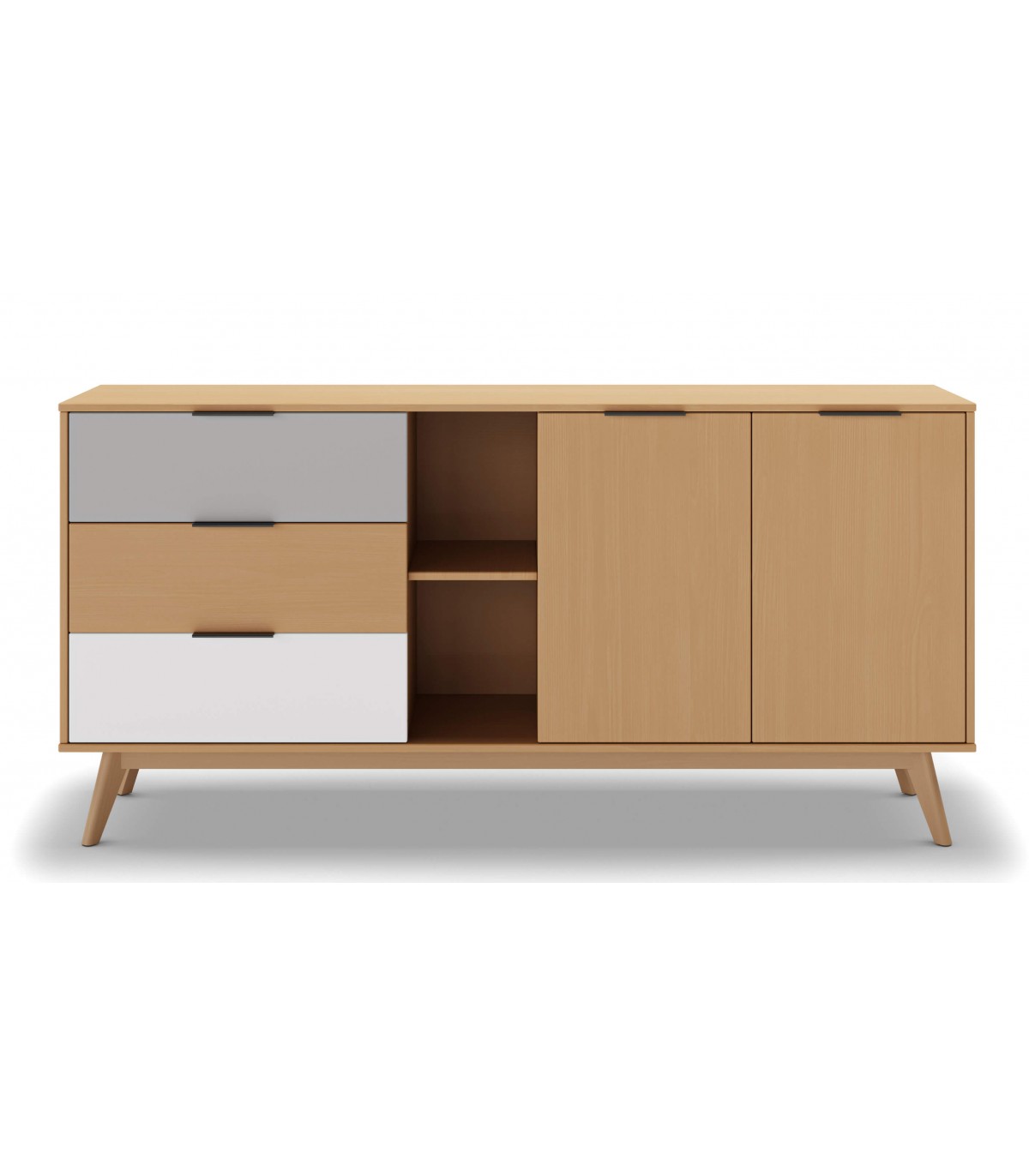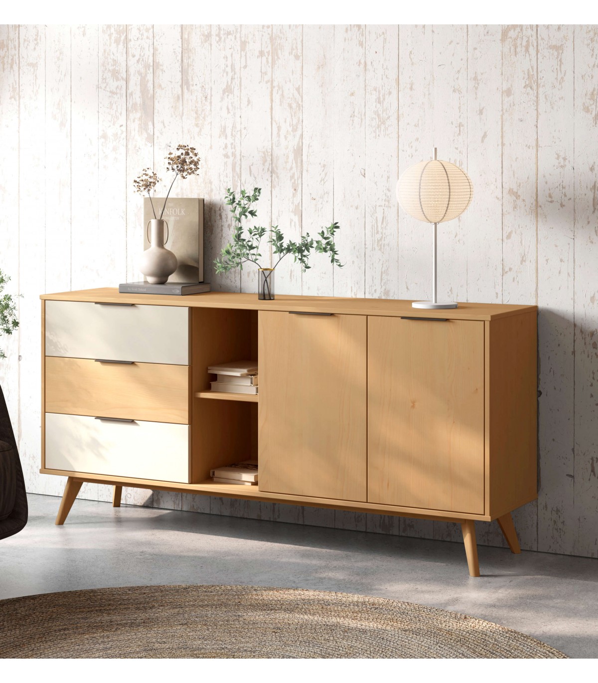 Aparador de línea nórdica madera de pino natural y cajones lacados en color gris, blanco y madera natural con 2 puertas y 3 cajones, de gran presencia y capacidad, los 2 cajones en color y el contraste con la madera natural le da un aspecto muy fresco y actual.