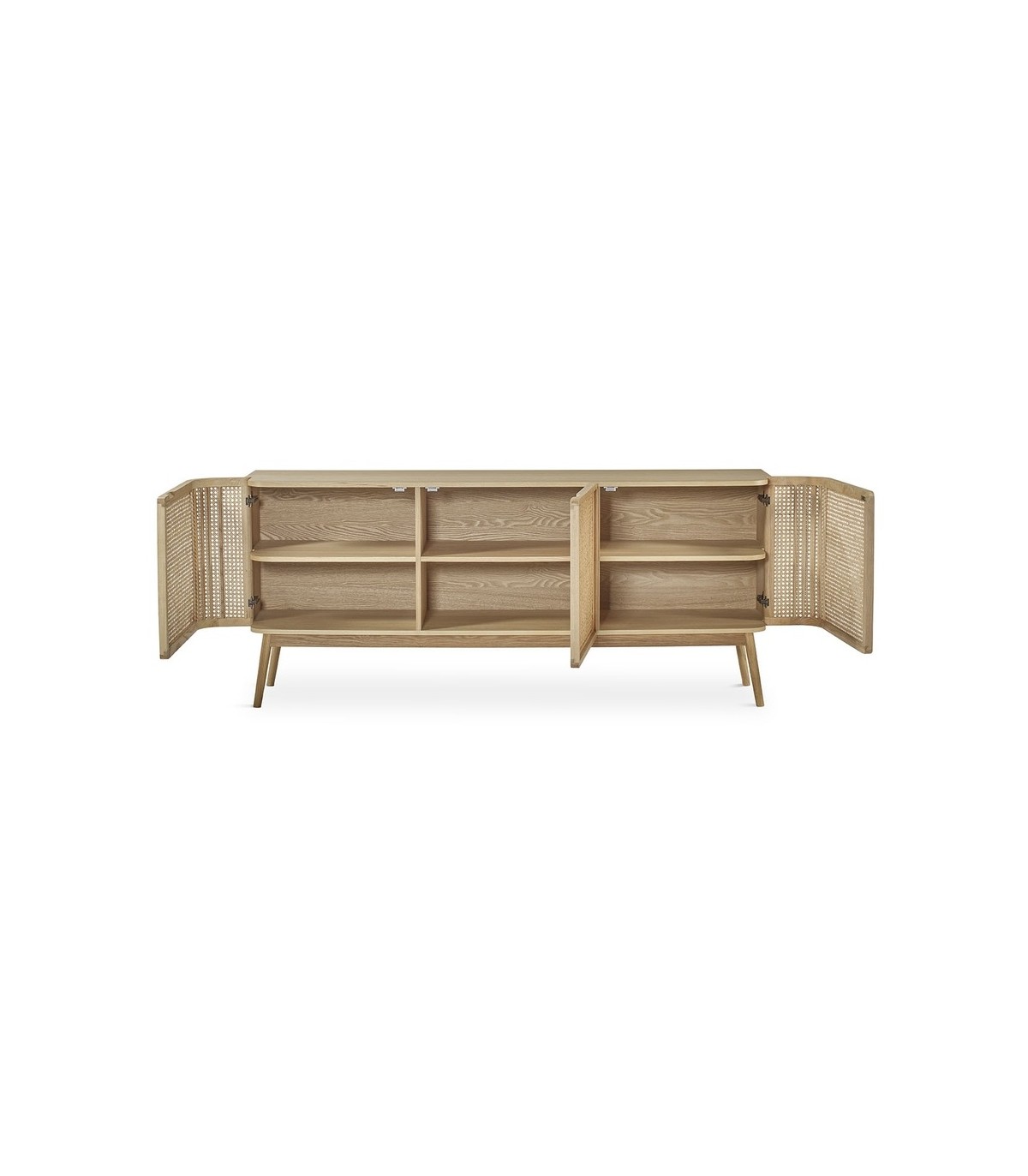 Aparador realizado en madera de roble combinado con ratán acabado natural. Un buen mueble de capacidad que encajará perfectamente en tu decoración en tu salón o una gran cocina.