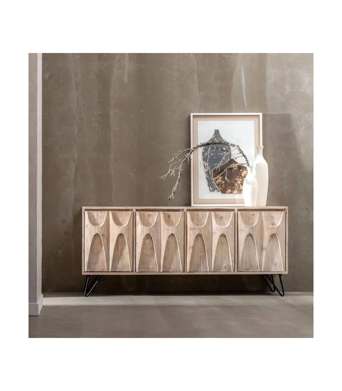 Aparador original con 4 puertas realizado en madera de pino reciclada lavada en blanco, las patas en metal negro, un aparador de gran capacidad perfecto para tu salón comedor.