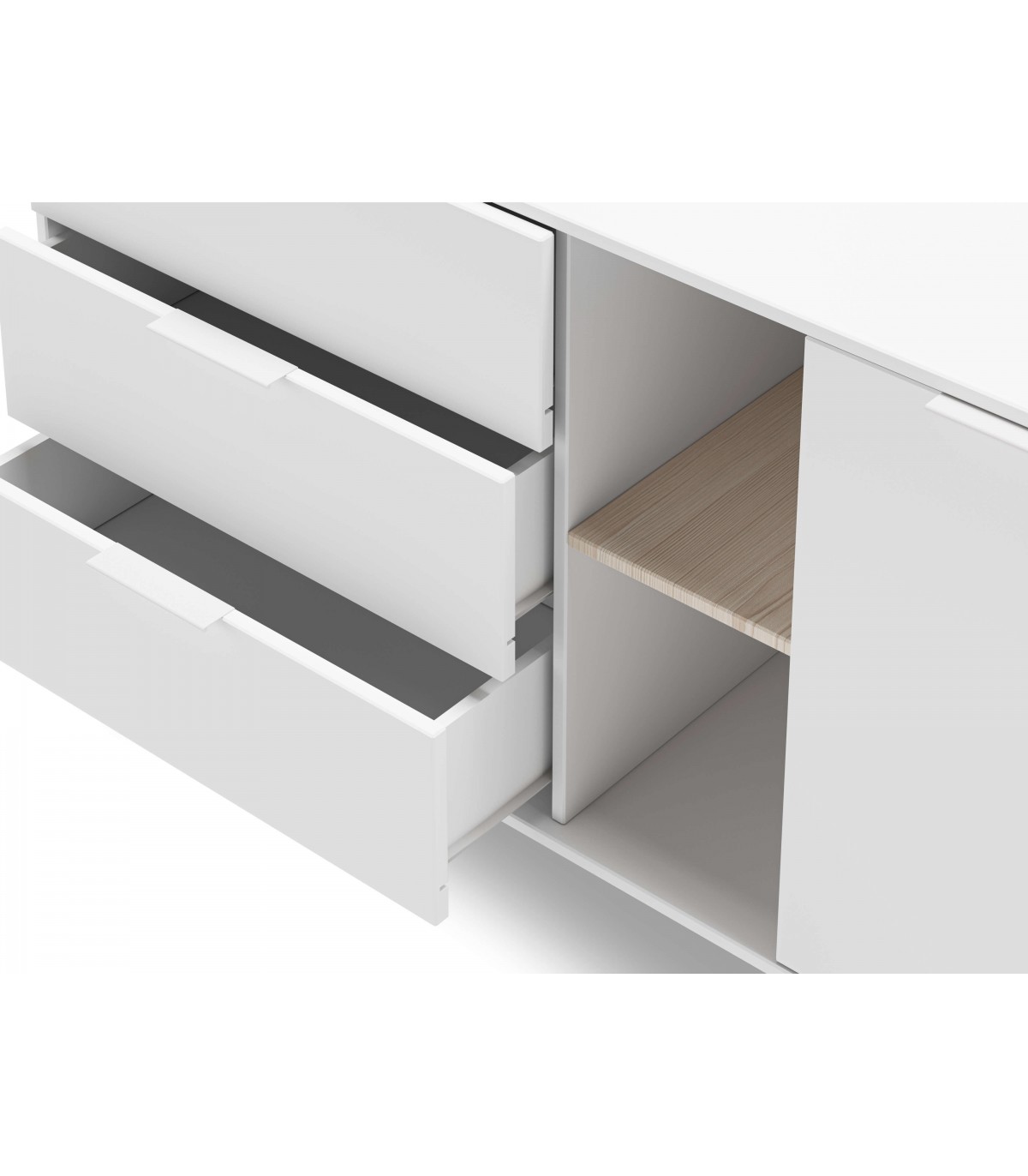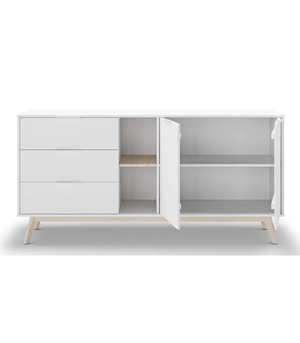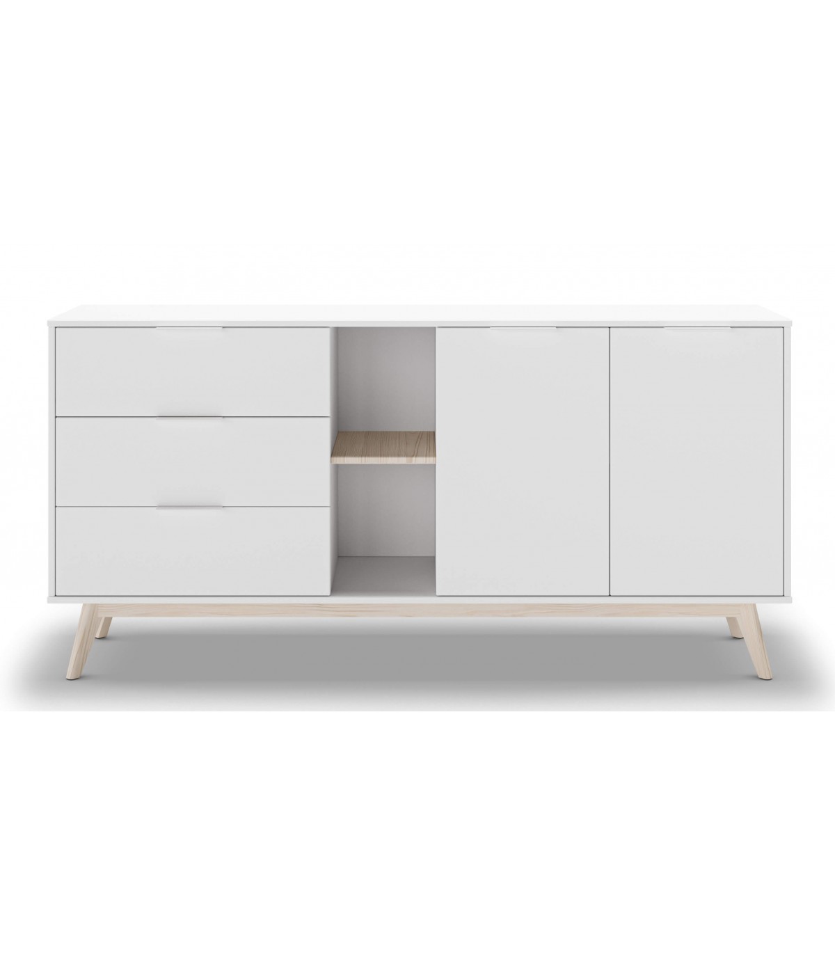 Aparador grande de línea nórdica lacado en color blanco y madera natural con 2 puertas y 3 cajones, de gran presencia y capacidad, el lacado en color blanco y el contraste con la madera natural le da un aspecto muy fresco y actual.