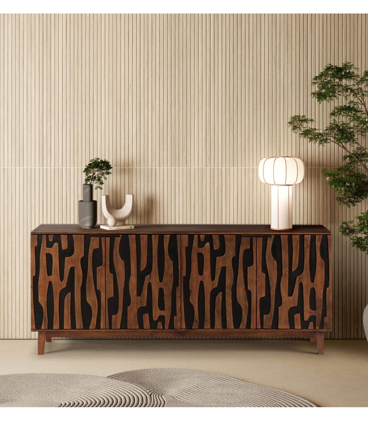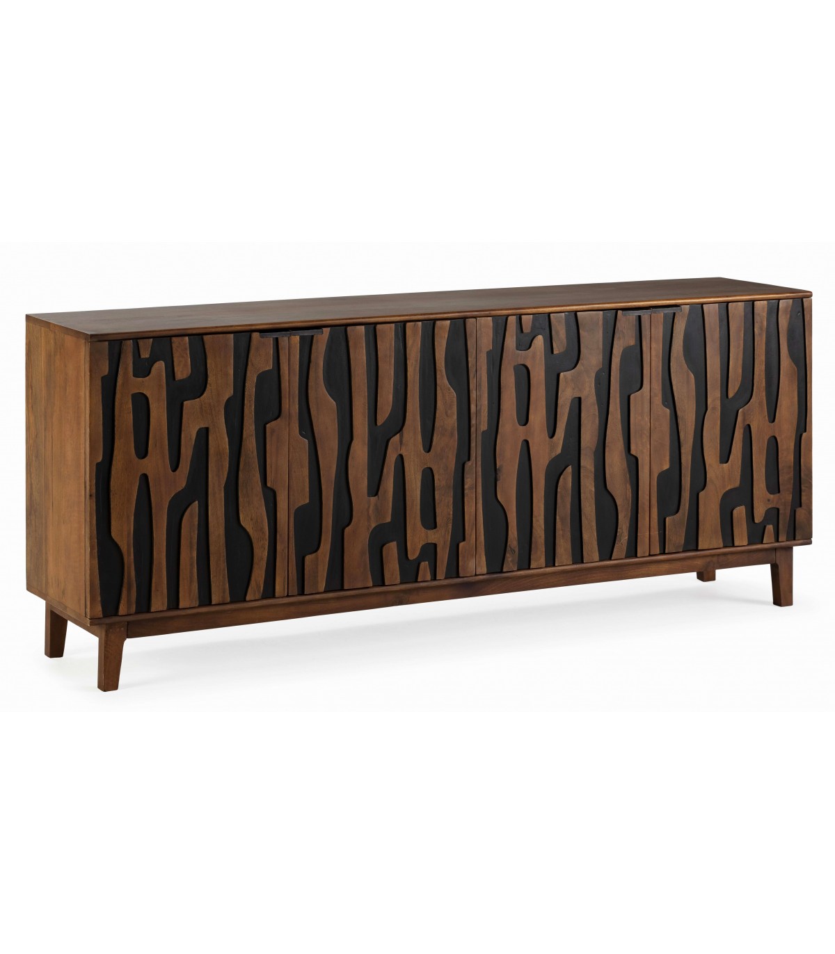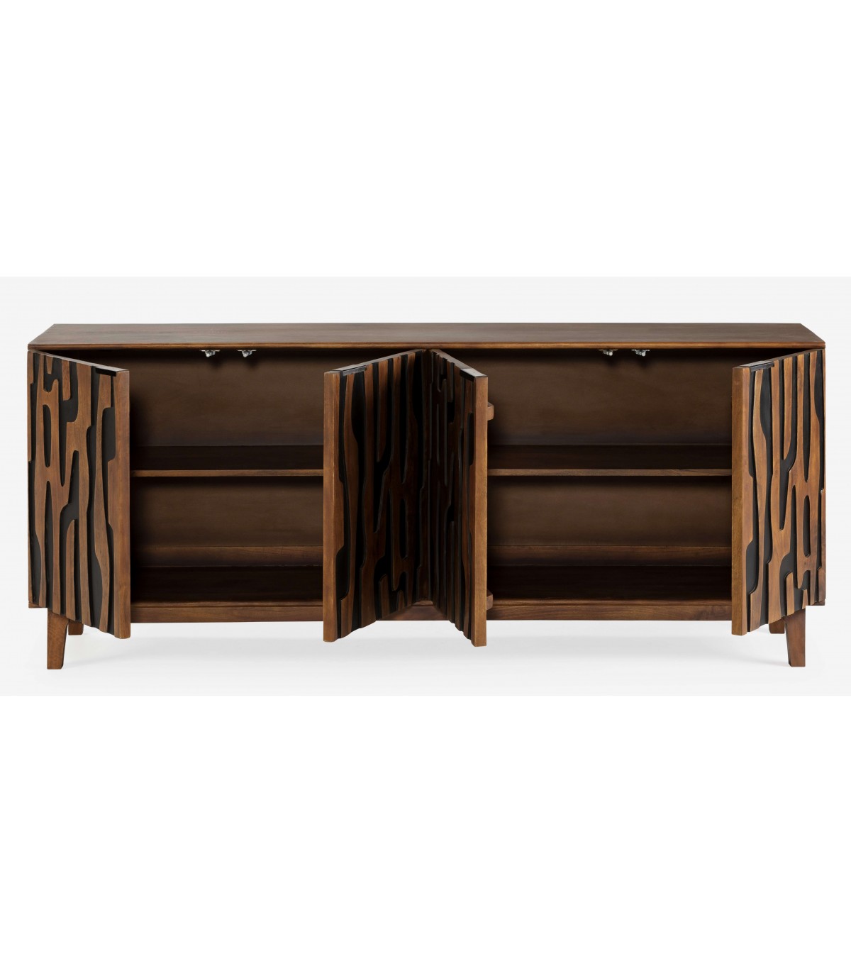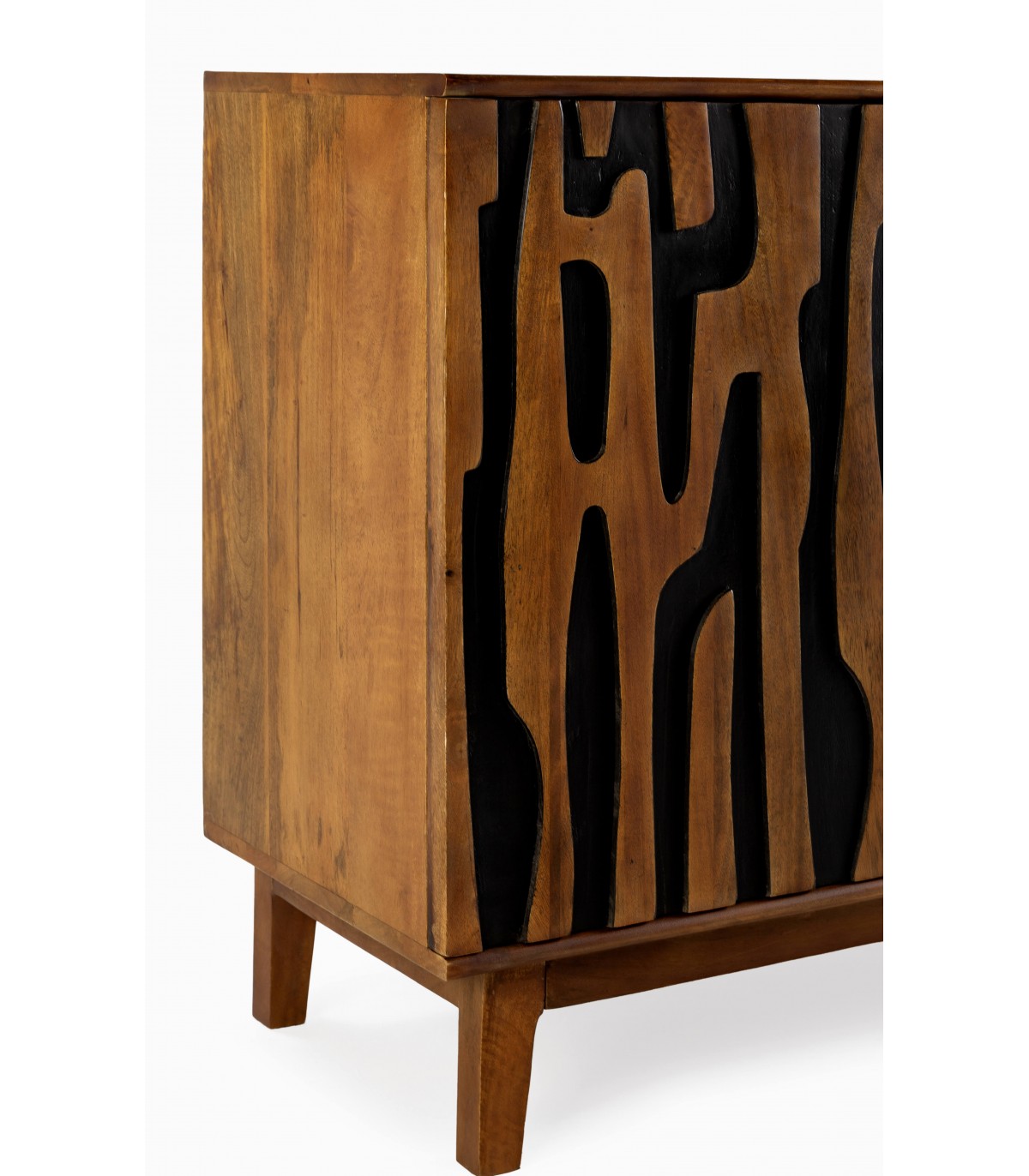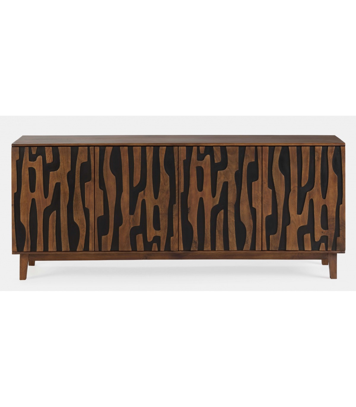 Aparador realizado en madera de mango tallada teñida en nogal y negro, con 4 puertas, los frentes llevan un dibujo tallado a mano que le da mucho movimiento al mueble, aportándole originalidad.