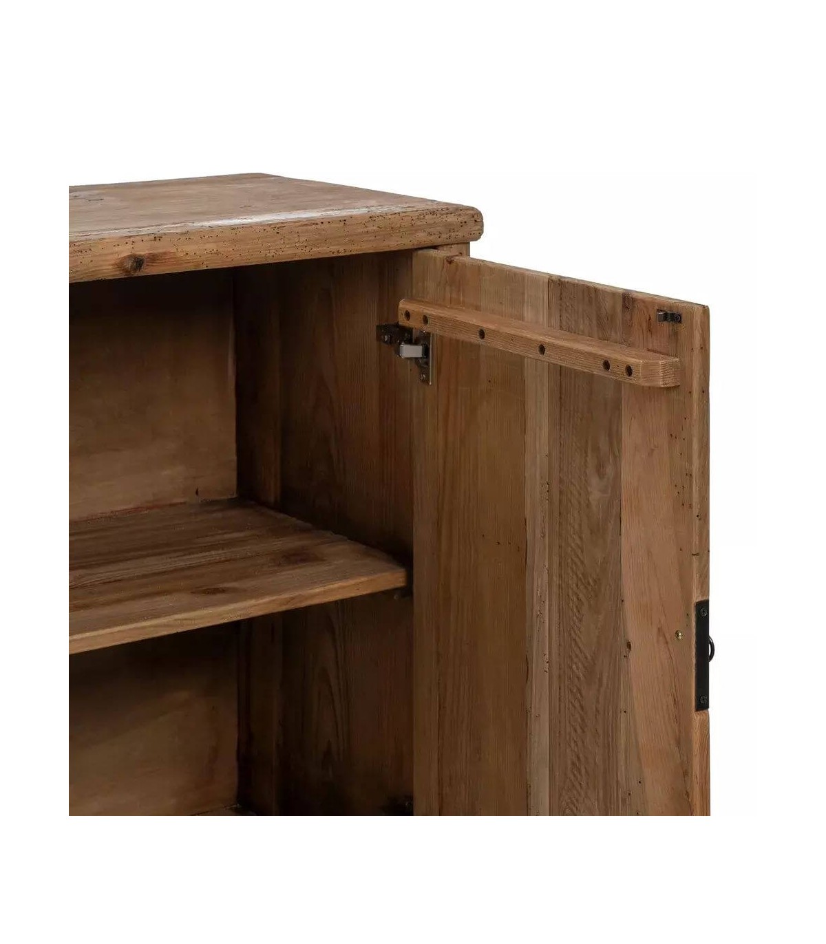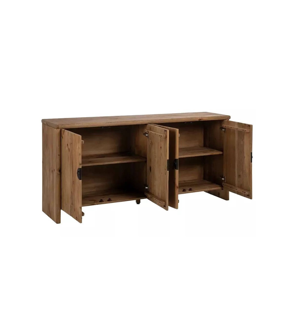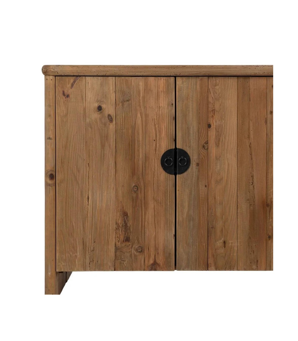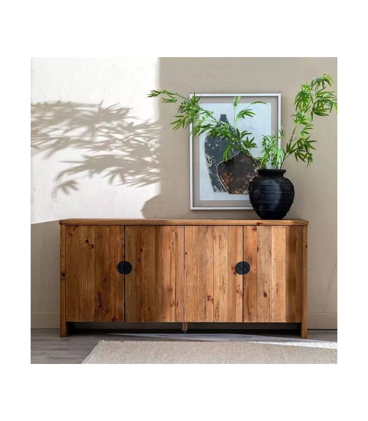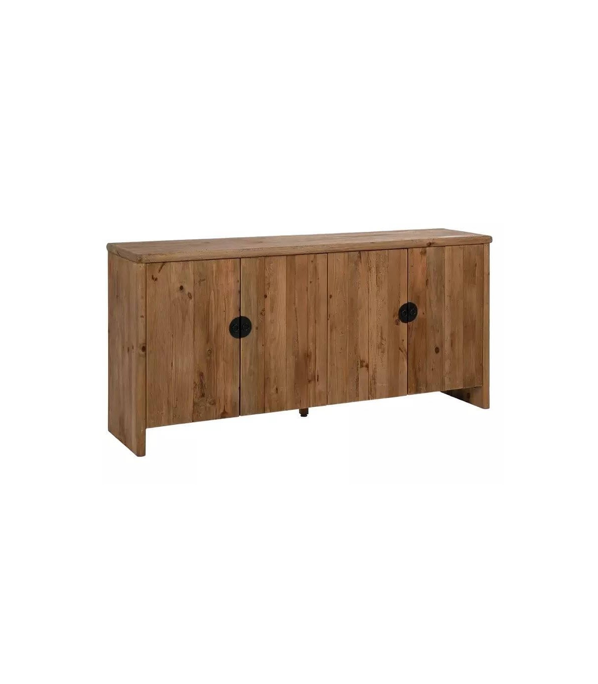 Aparador grande realizado de manera artesanal en madera de pino natural reciclada con 4 puertas y los tiradores en metal negro ta característicos que le dan ese aire oriental.
