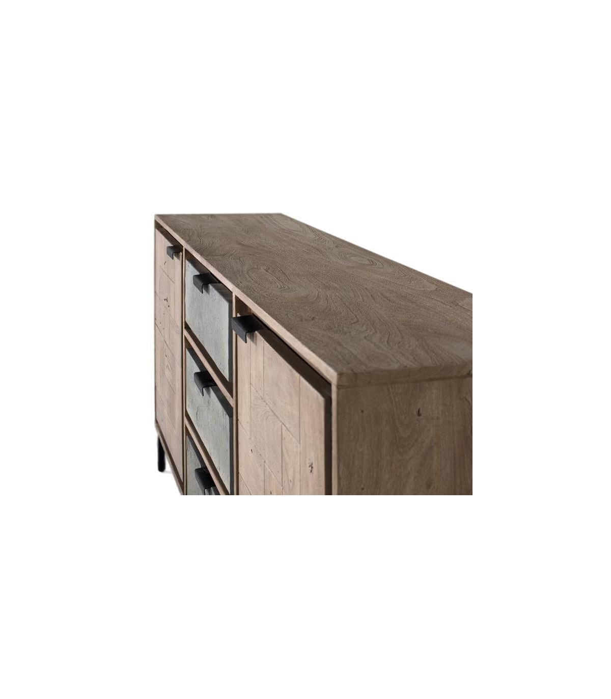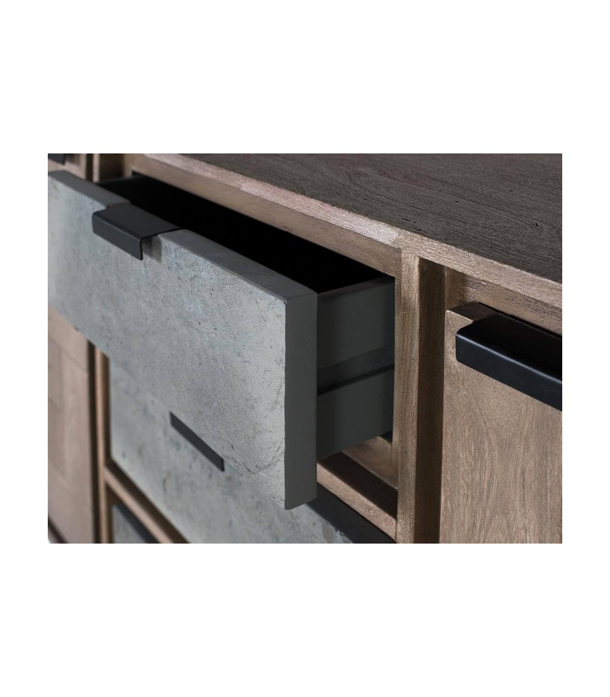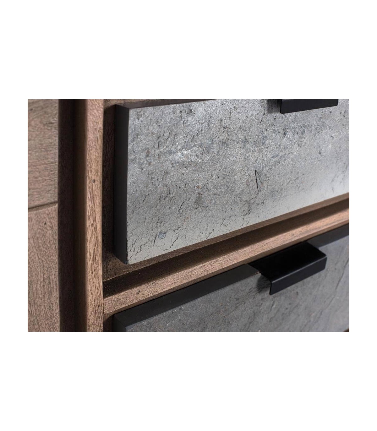Aparador realizado en madera natural, con los cajones imitación piedra texturizada en color gris, patas y tiradores en metal. Presenta dos puertas y tres cajones, ofreciendo un amplio espacio de almacenamiento para diversos artículos. Los frontis de los cajones están adornados con un acabado de chapa de piedra, añadiendo un contraste visual y táctil que resalta su estilo rústico y moderno.
