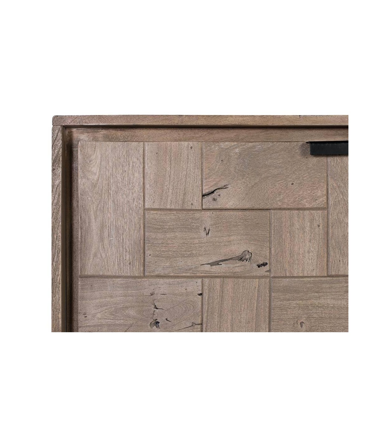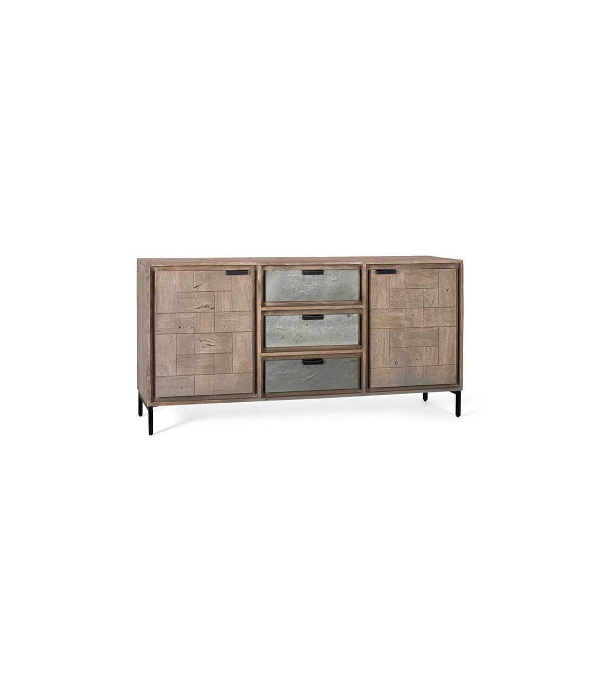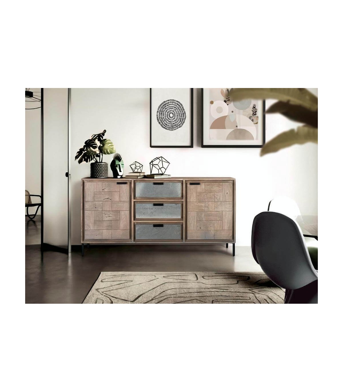 Aparador realizado en madera natural, con los cajones imitación piedra texturizada en color gris, patas y tiradores en metal. Presenta dos puertas y tres cajones, ofreciendo un amplio espacio de almacenamiento para diversos artículos. Los frontis de los cajones están adornados con un acabado de chapa de piedra, añadiendo un contraste visual y táctil que resalta su estilo rústico y moderno.
