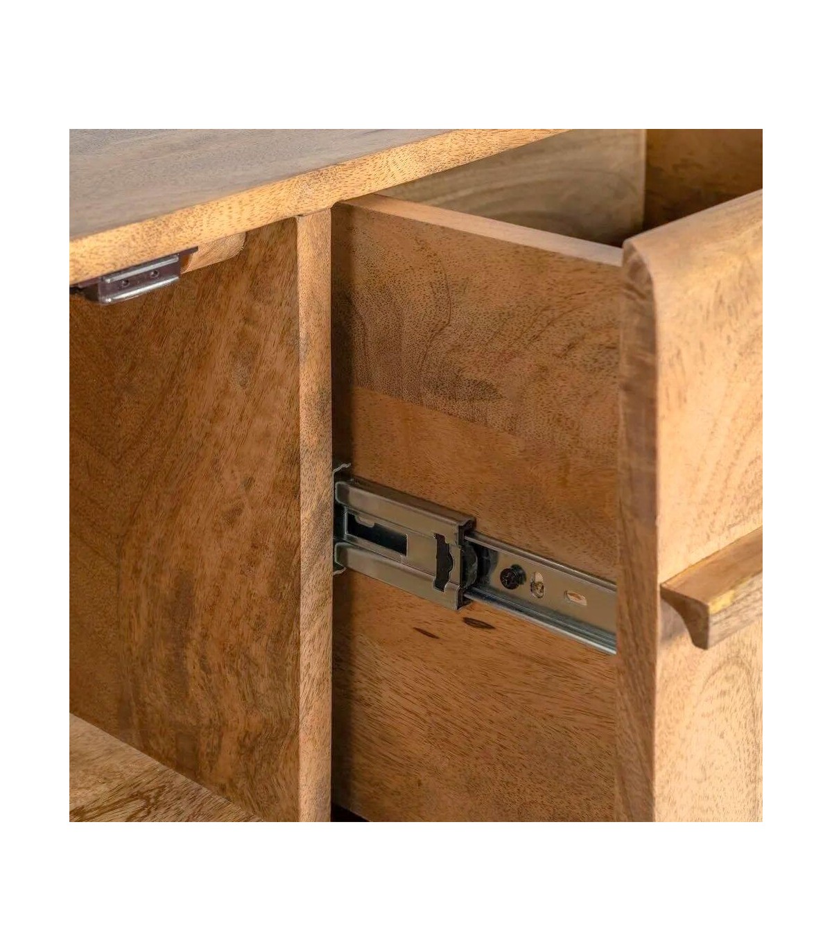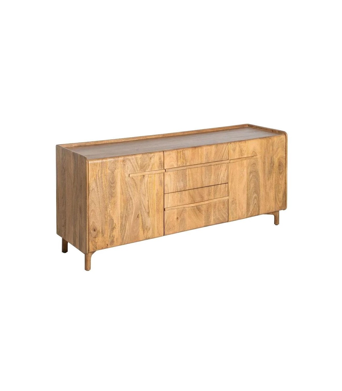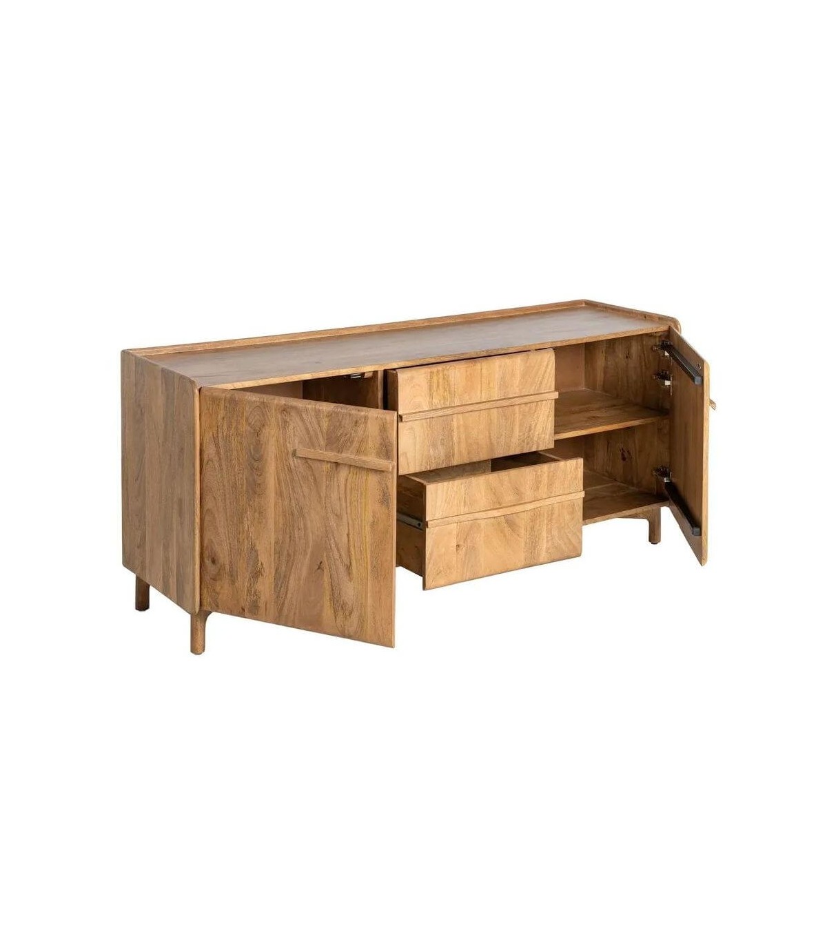 - La silueta sobria de este aparador añade calma y un matiz cálido, integrándose con facilidad en salones o comedores de espíritu relajado. Su estructura de mango macizo exhibe una veta viva y sedosa, resaltada por un acabado natural que potencia su esencia artesanal.