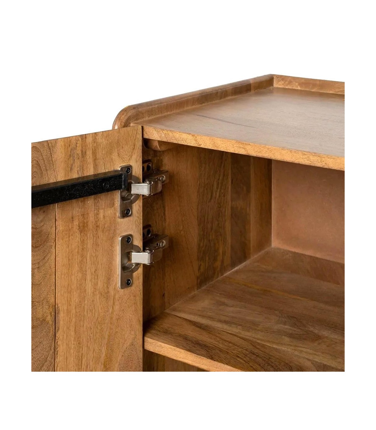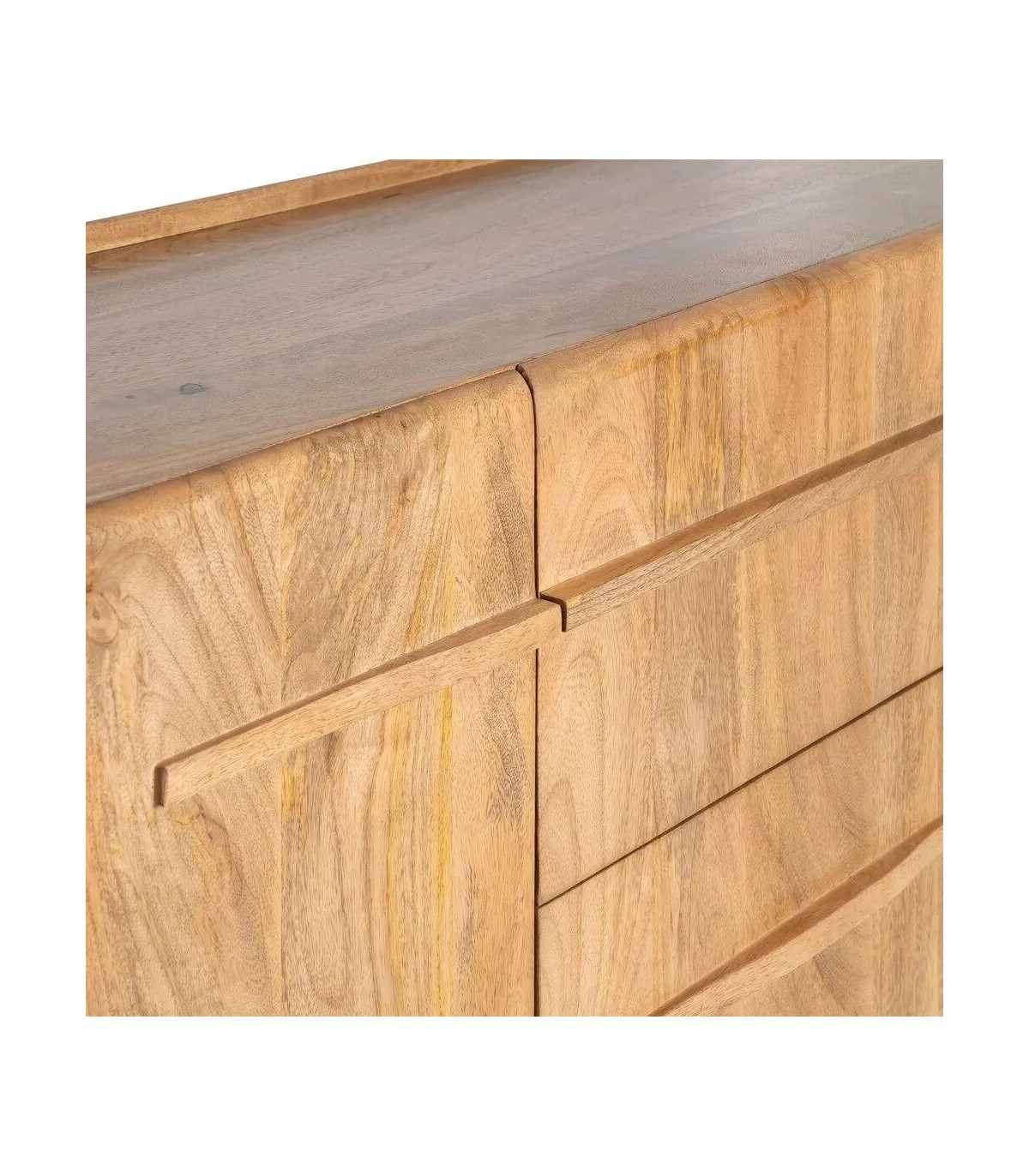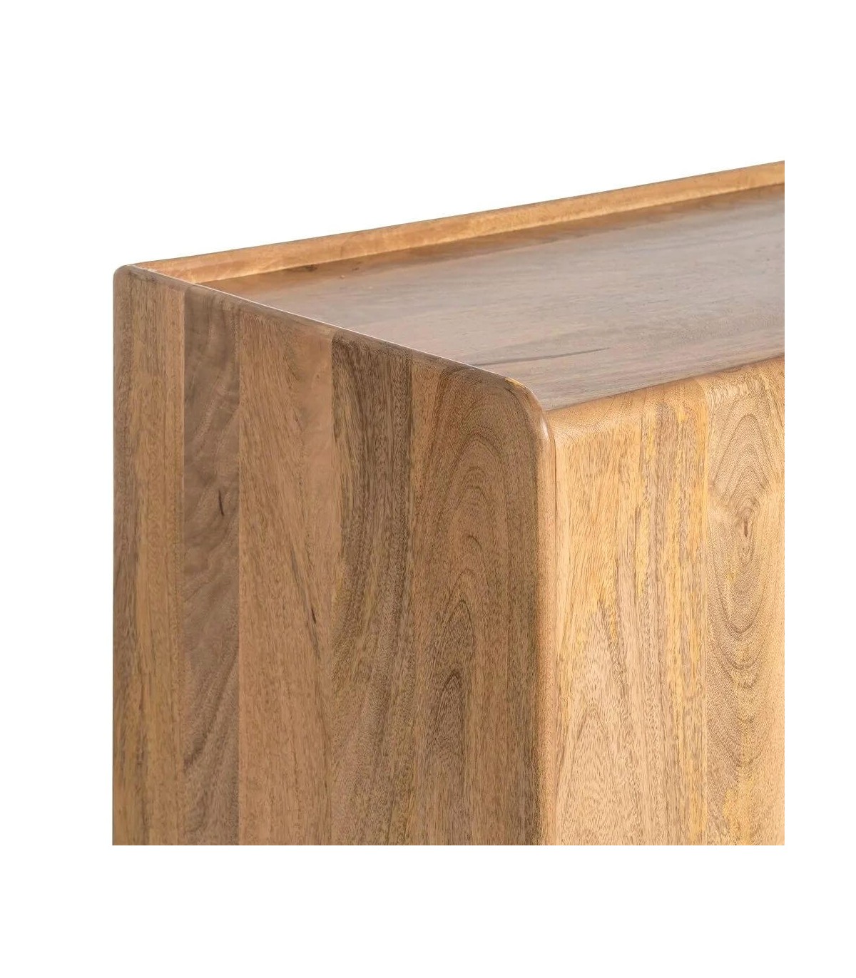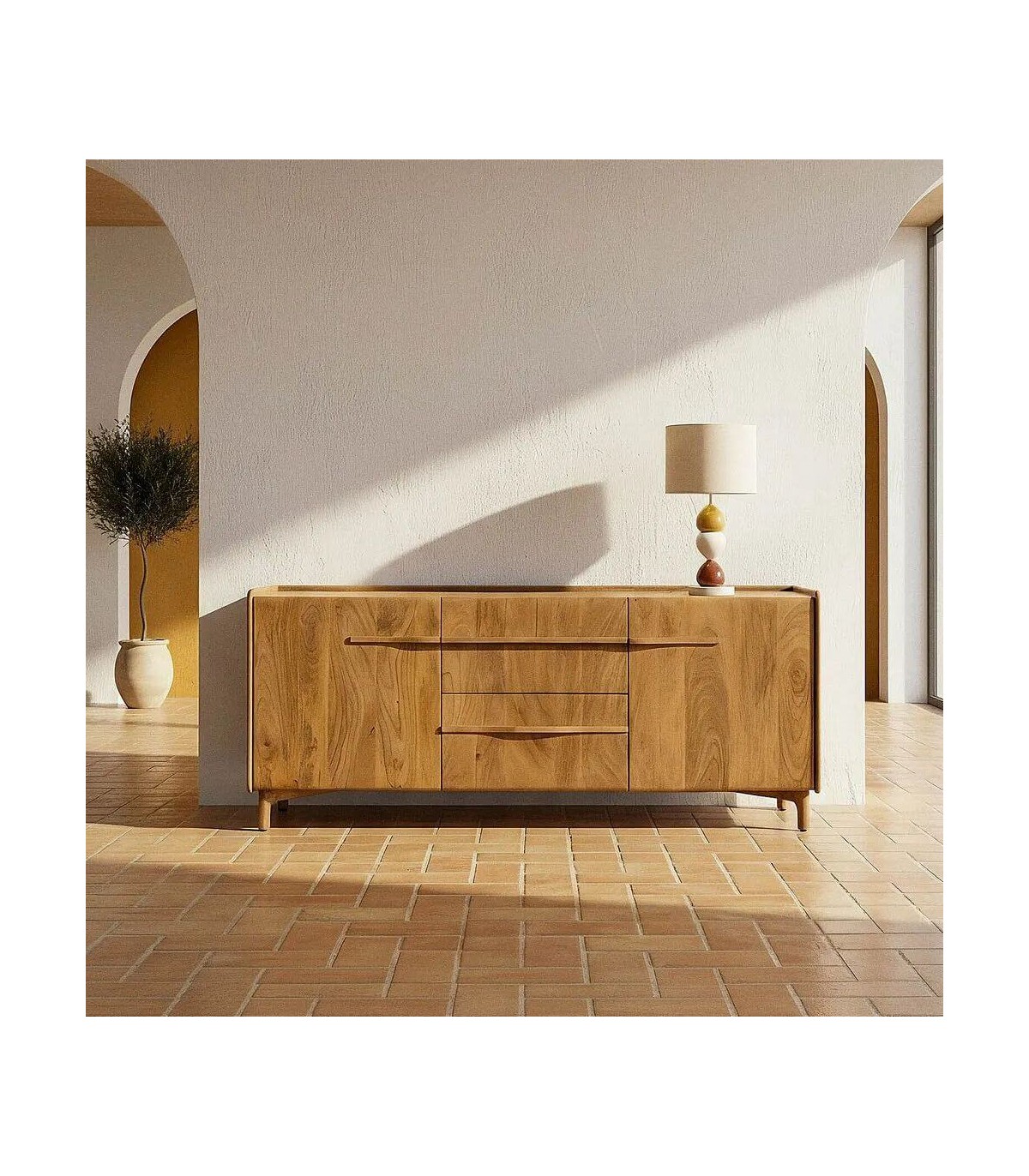 - La silueta sobria de este aparador añade calma y un matiz cálido, integrándose con facilidad en salones o comedores de espíritu relajado. Su estructura de mango macizo exhibe una veta viva y sedosa, resaltada por un acabado natural que potencia su esencia artesanal.