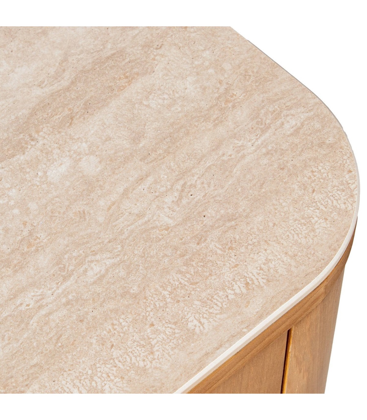 El sobre de imitación travertino introduce un matiz elegante que contrasta con la madera natural. Los detalles dorados resaltan su esencia contemporánea y sutilmente sofisticada. Perfecto para salones o comedores que buscan un estilo actual sin renunciar a la calidez.