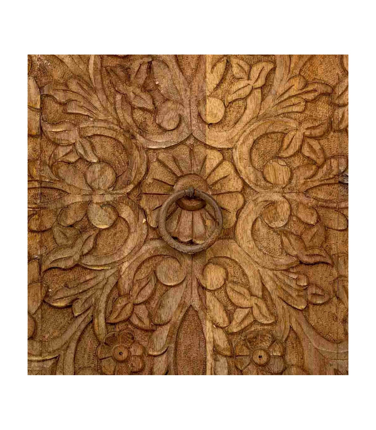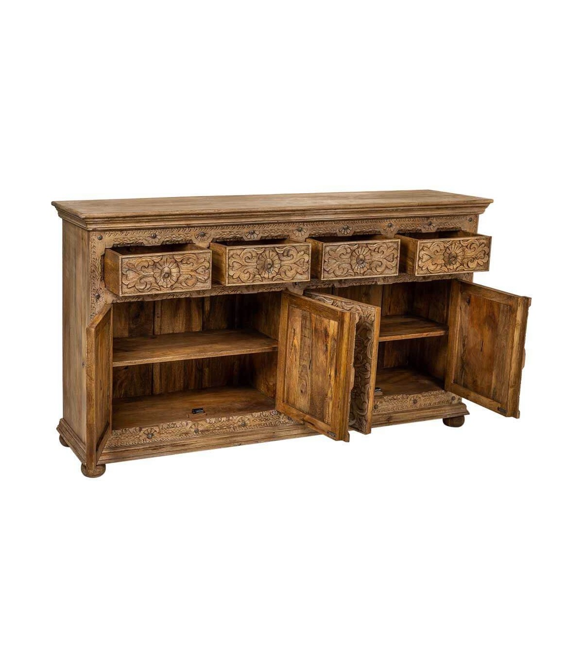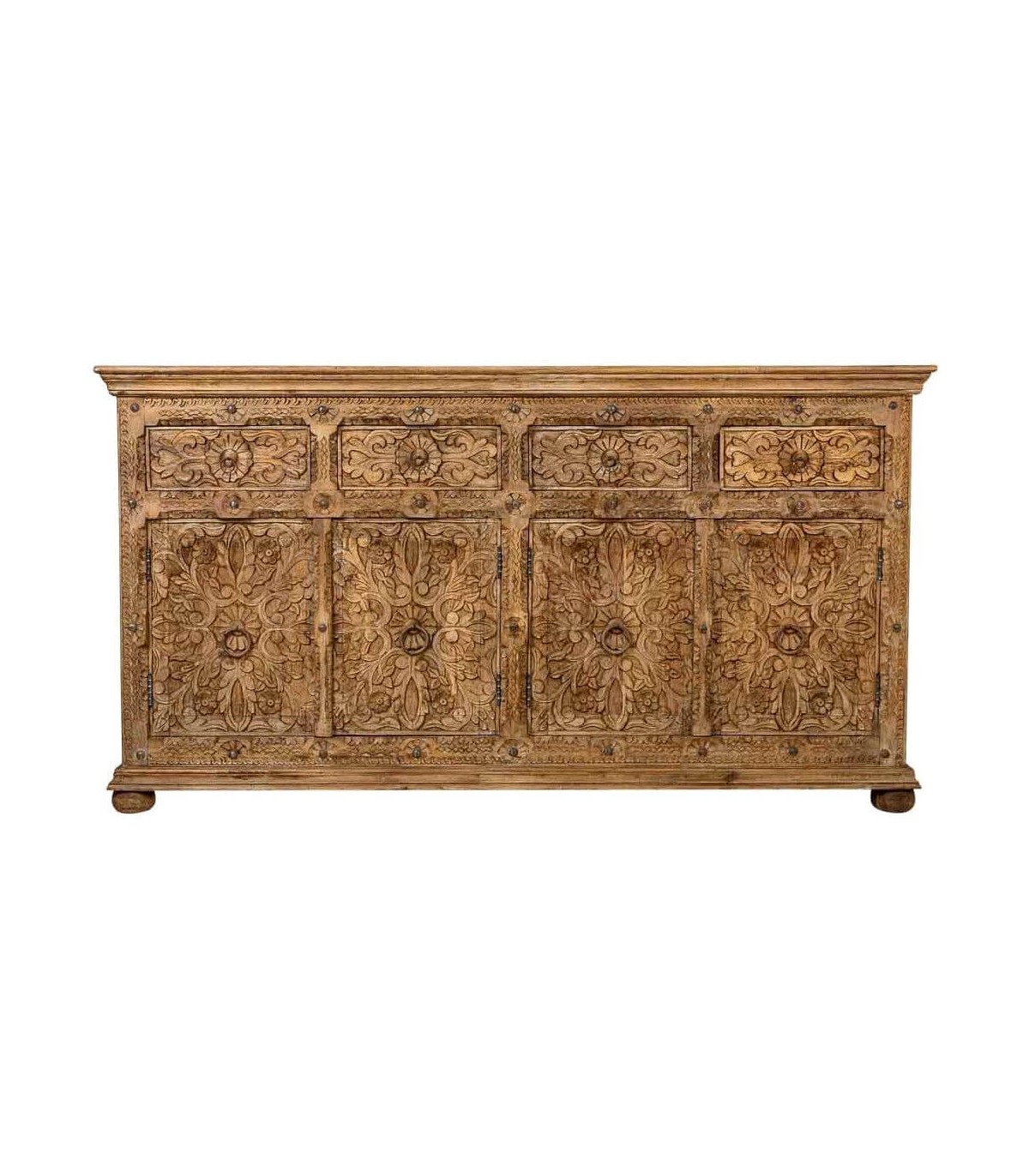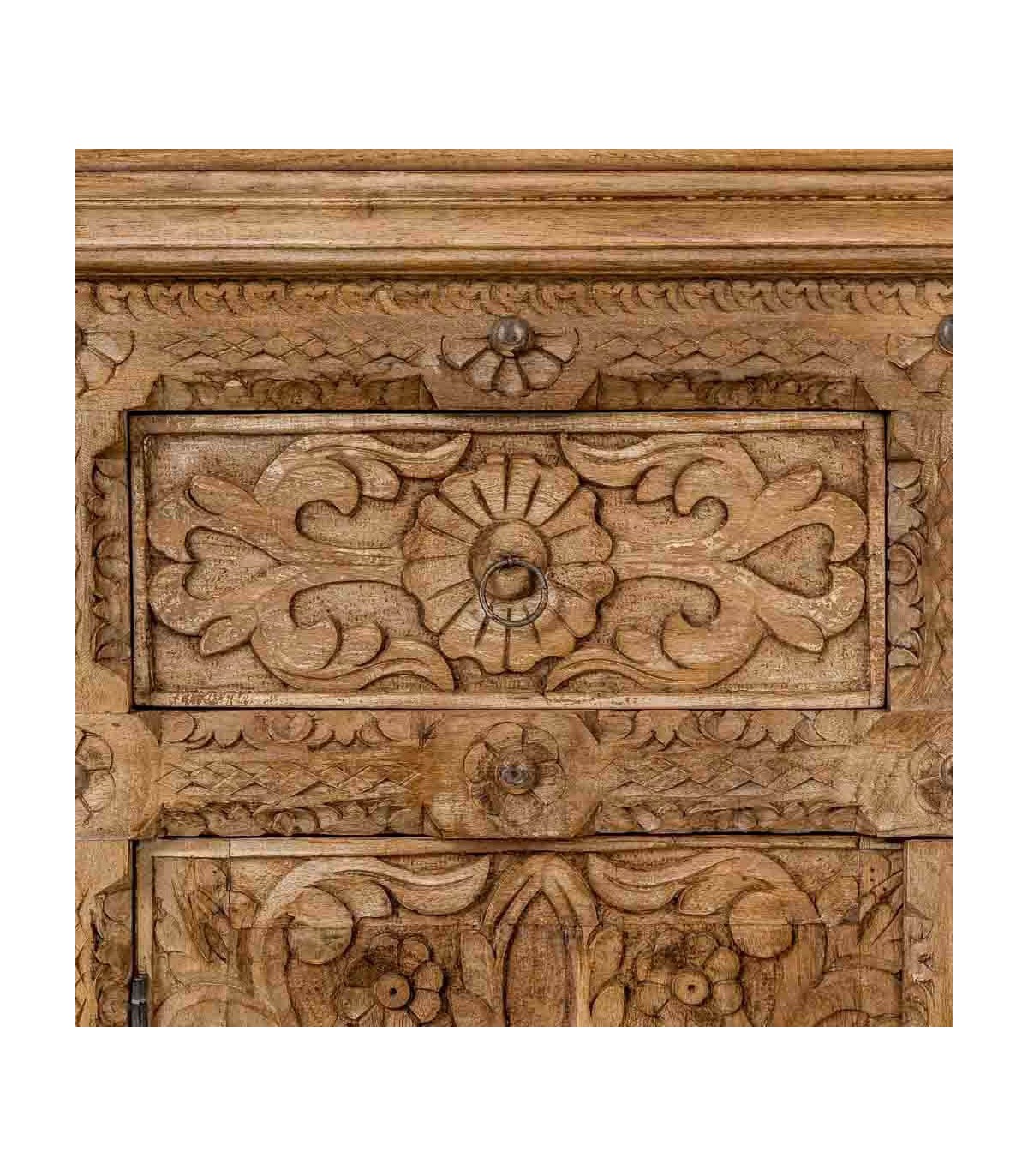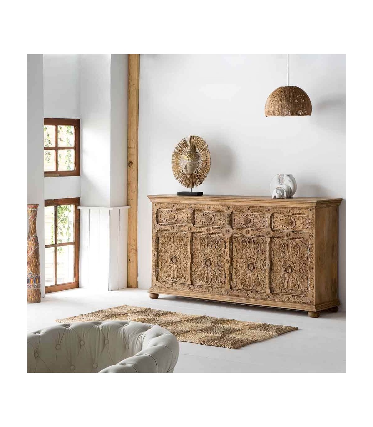 El acabado natural aporta textura, calidez y un atractivo toque envejecido que potencia su esencia étnica. Dispone de cuatro cajones y cuatro puertas con amplio espacio de almacenaje, rematados con discretos tiradores metálicos en tono natural. Una opción funcional y decorativa para quienes buscan muebles con historia y carácter escultural.
