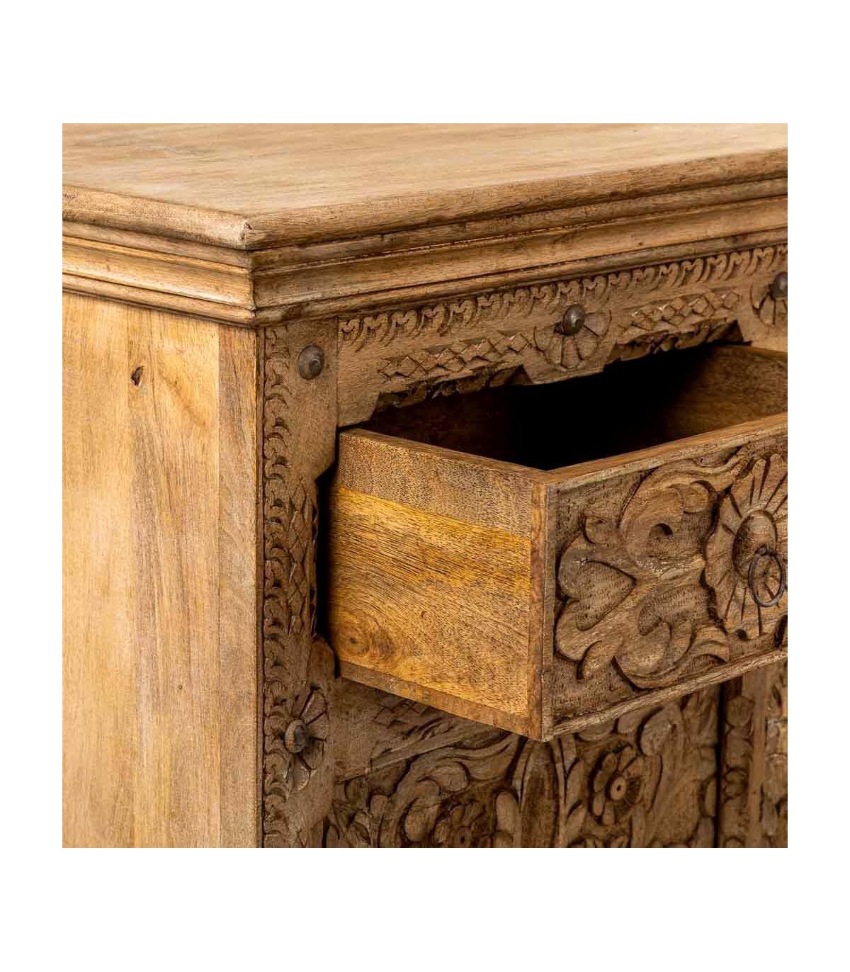 Pieza impactante con una presencia rotunda y un exquisito aire artesanal. Este aparador de gran tamaño está fabricado en madera maciza de mango y decorado con intrincadas tallas florales y geométricas realizadas completamente a mano.