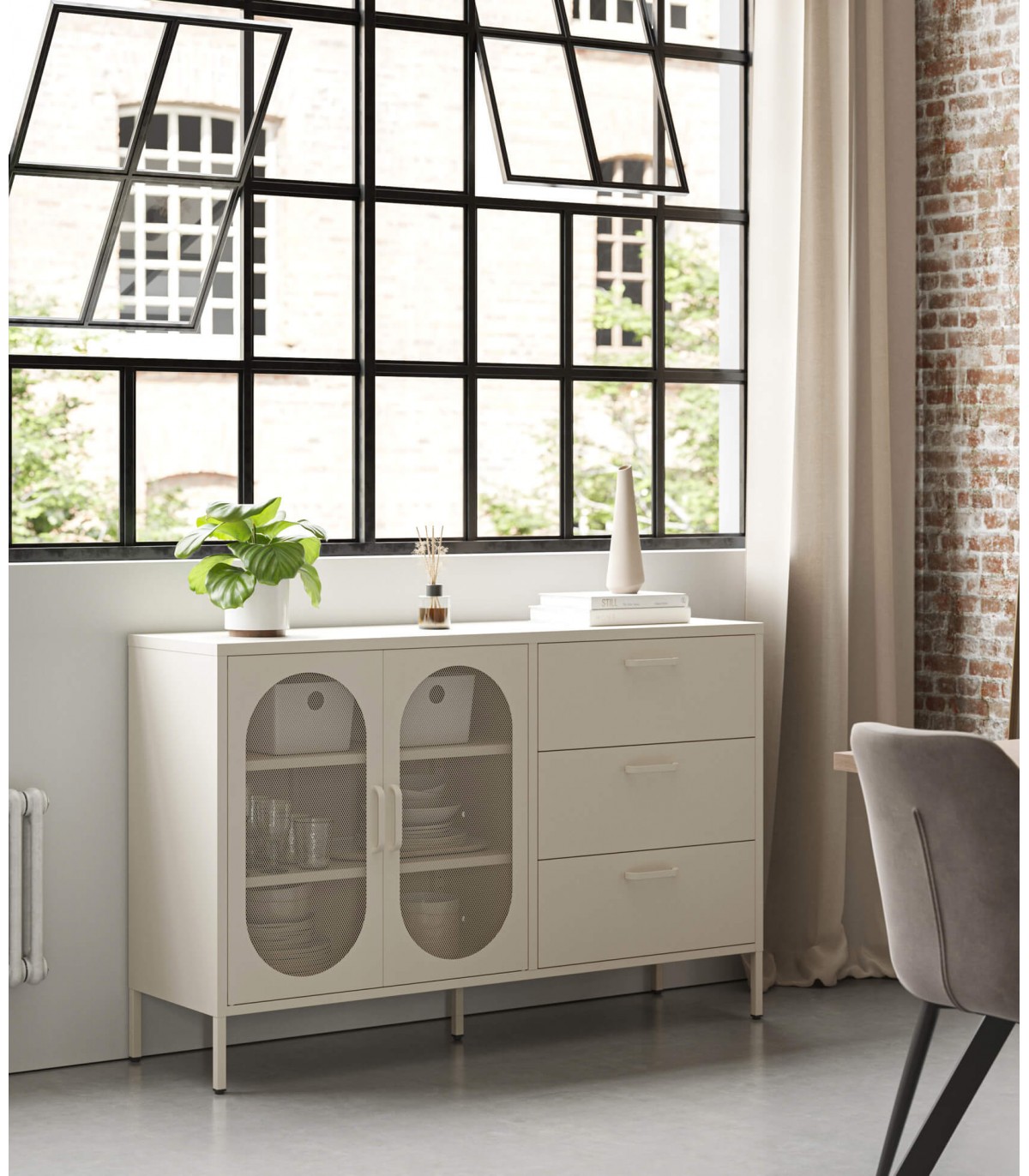 Dispone de dos puertas con panel perforado y tres amplios cajones, ofreciendo un espacio de almacenamiento óptimo para vajilla, textiles o documentos. Su acabado en líneas depuradas y su estética industrial con aire retro lo convierten en la pieza perfecta para comedores, salones o entradas con personalidad.