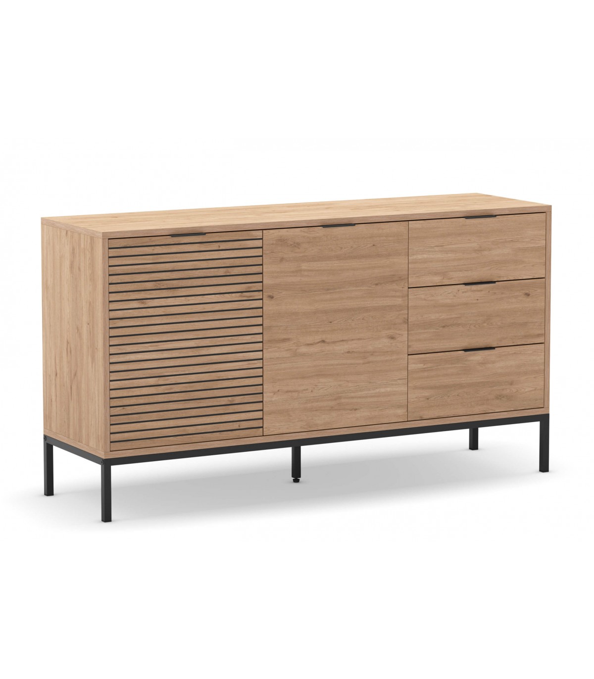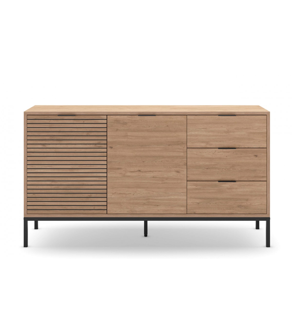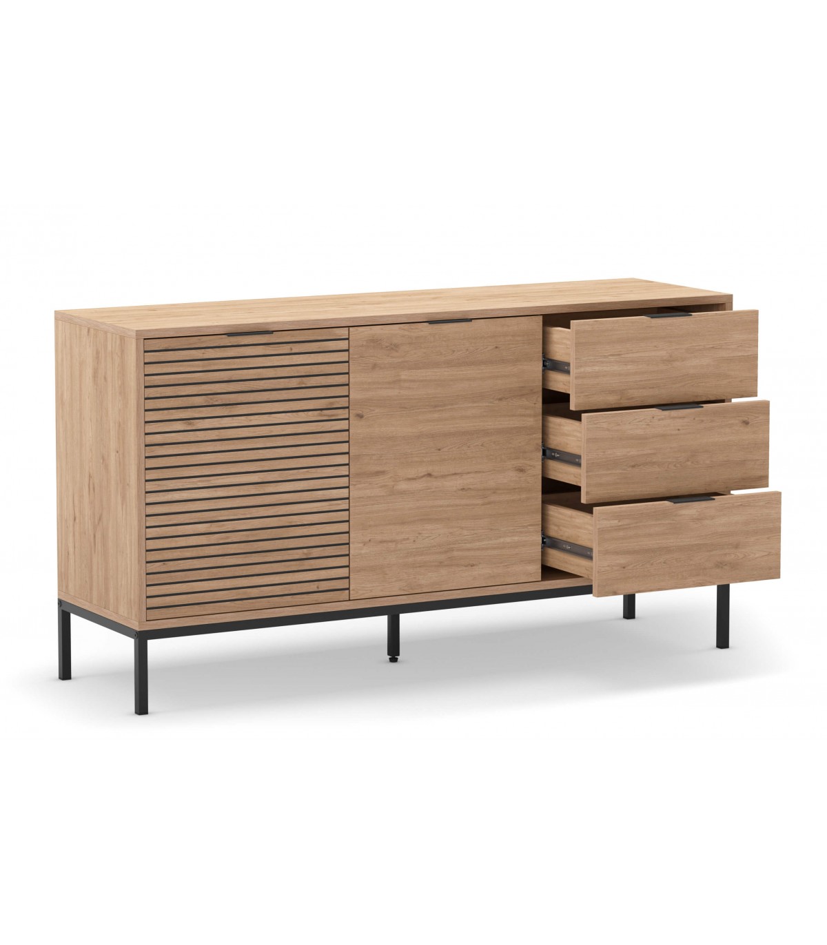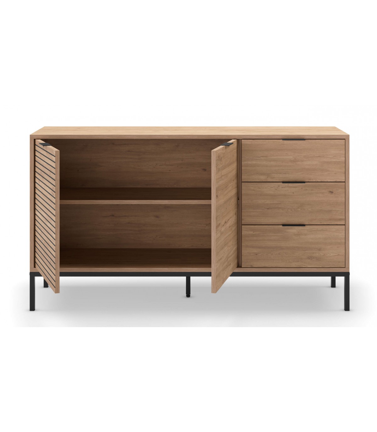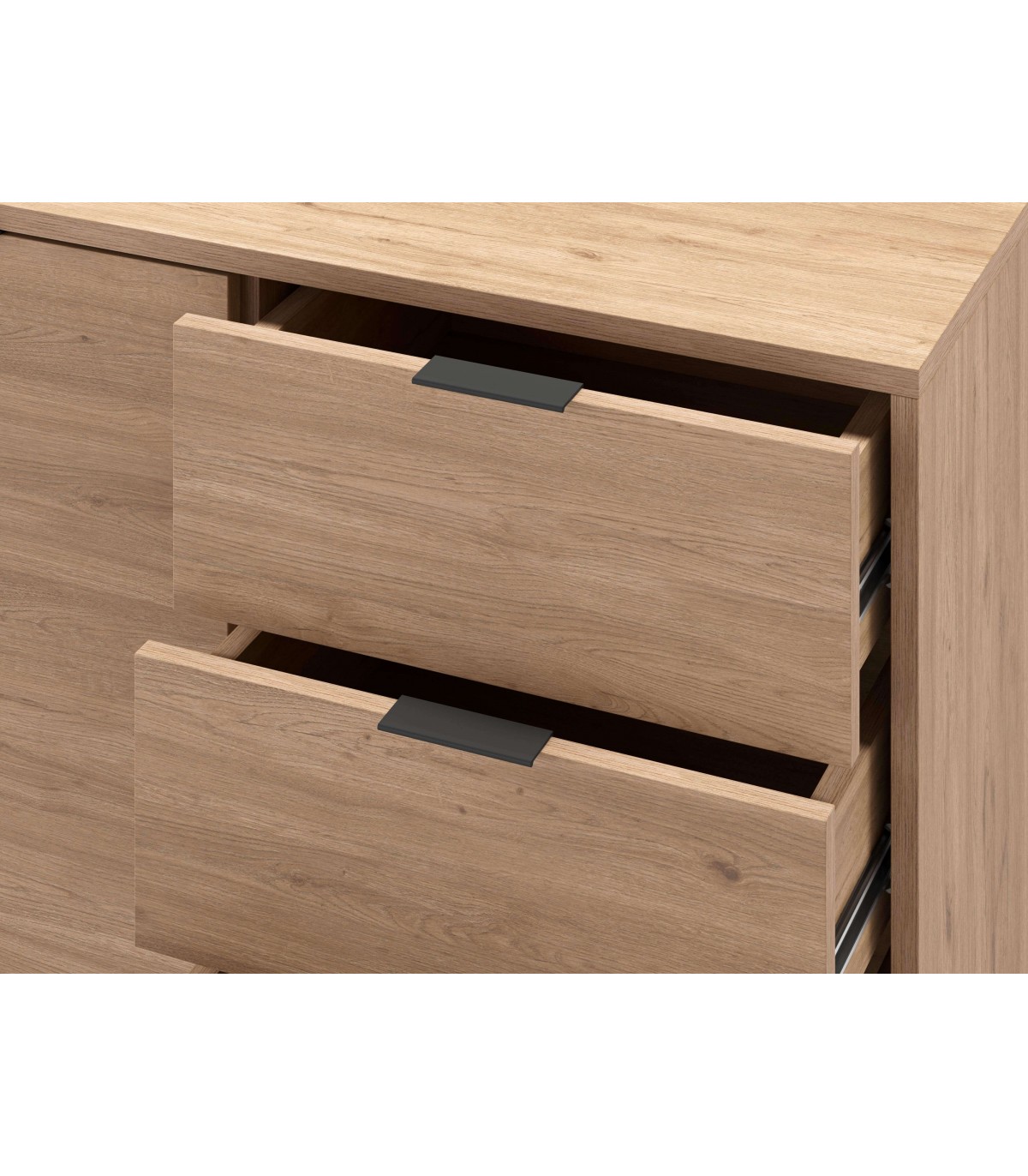 Cuenta con dos puertas con balda interior y tres cajones con apertura superior integrada, combinando almacenaje oculto y diseño minimalista. Perfecto para salones, comedores o recibidores modernos que buscan orden con estilo.