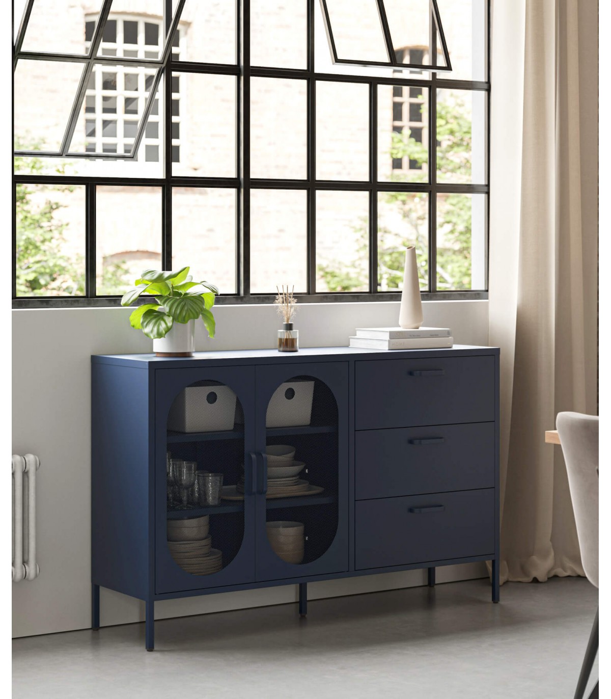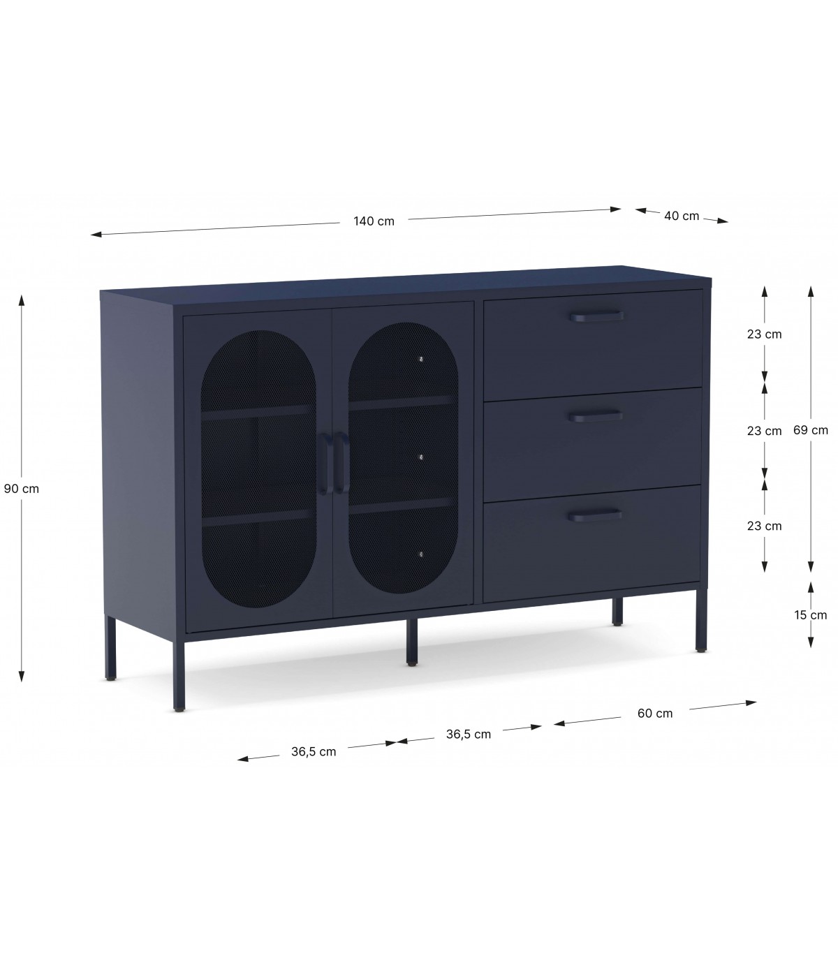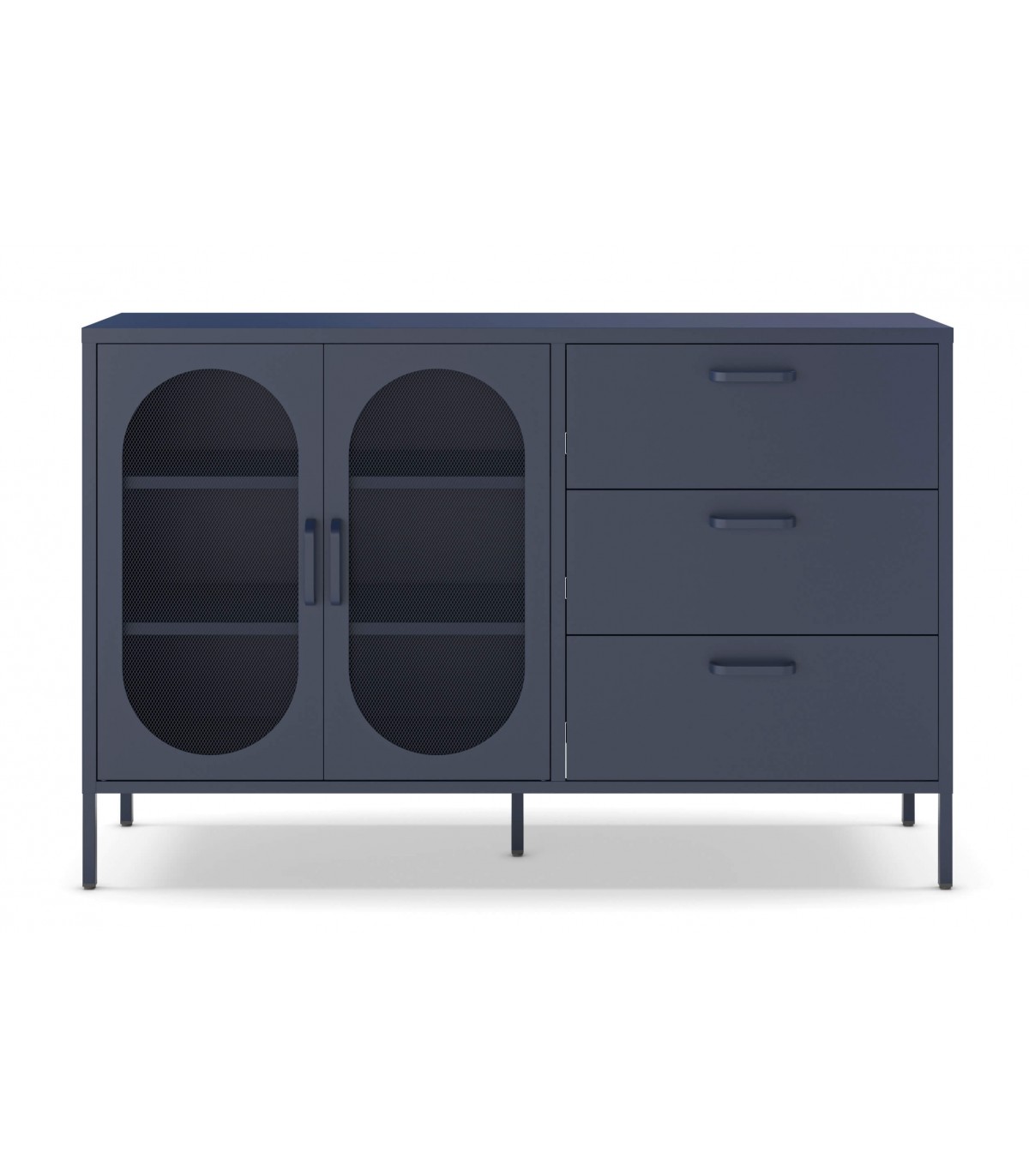 Dale un toque retro y sofisticado a tu hogar con este aparador de estilo vintage. Realizado en metal lacado en color azul oscuro, su diseño elegante y atemporal se complementa con los frentes de puertas en tela de malla metálica con plafones ovalados, aportando un aire industrial chic. Este aparador pequeño ofrece una buena capacidad de almacenamiento en un formato compacto y funcional tipo kit.