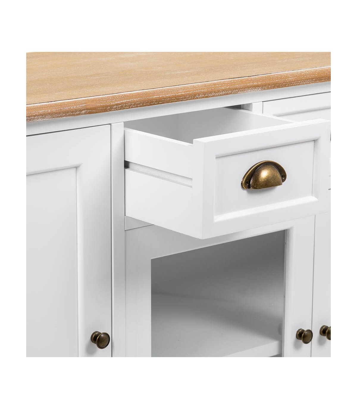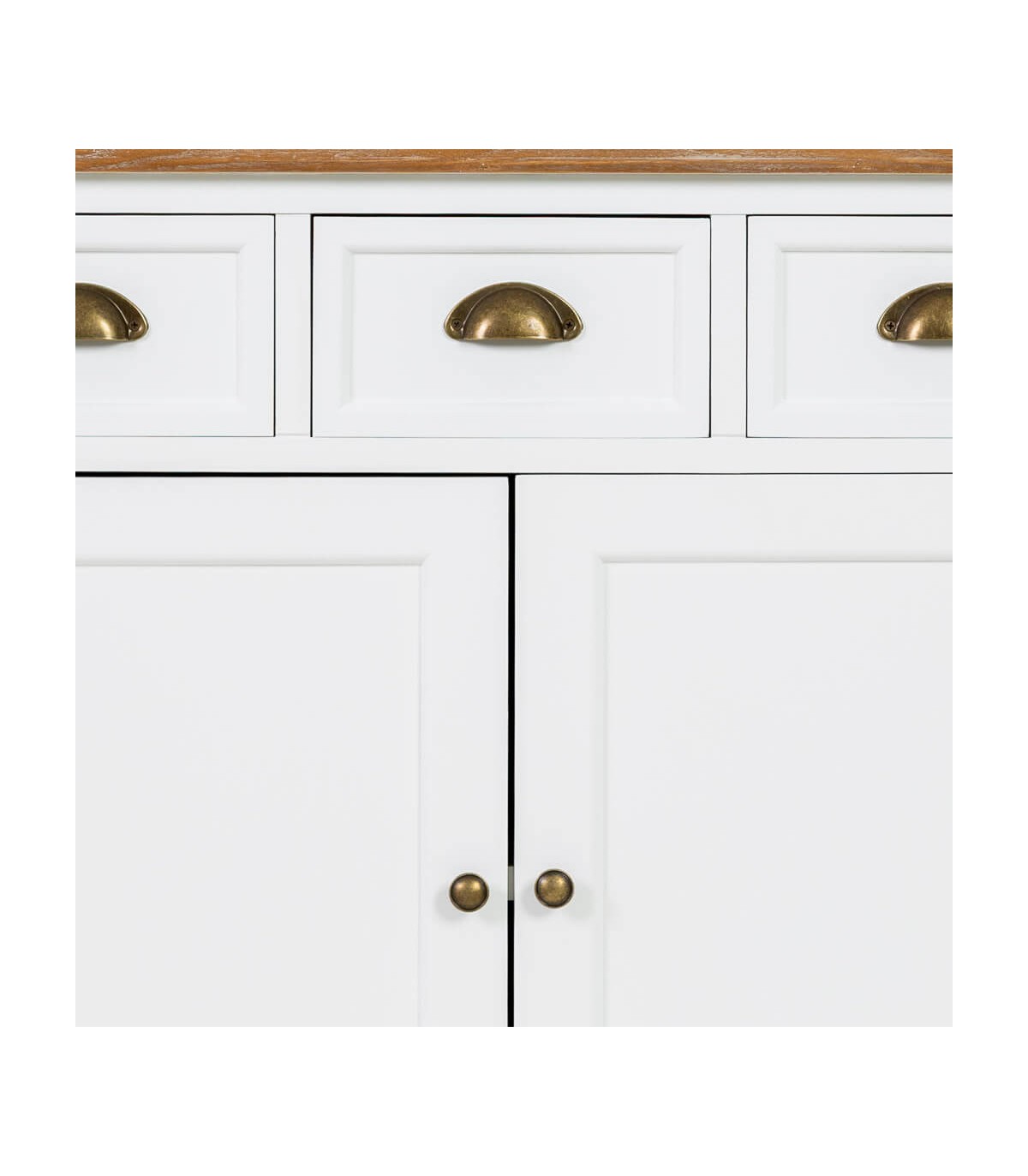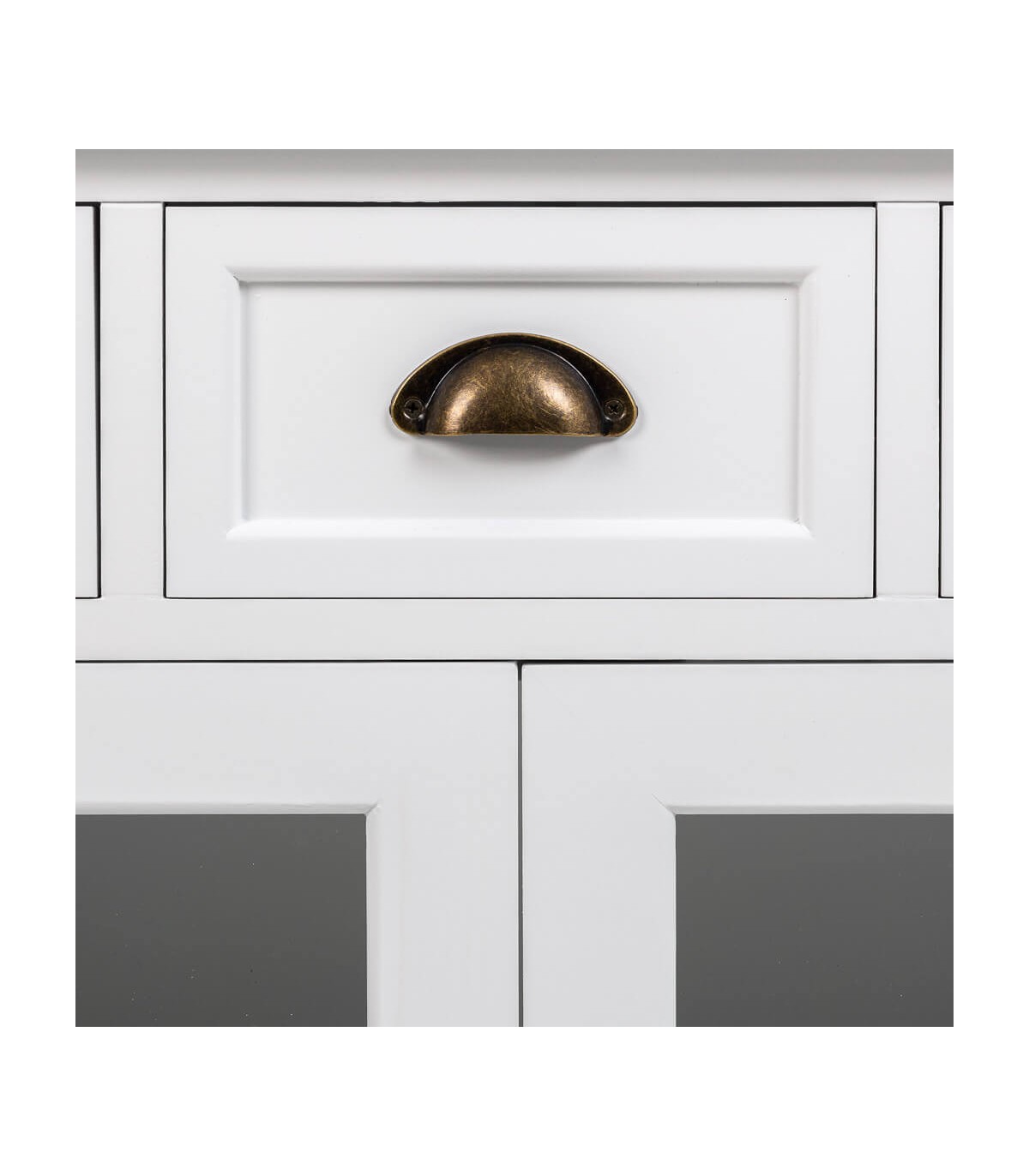 Acabado, tapa madera natural patinada en blanco, cuerpo lacado en blanco, tiradores bronce.