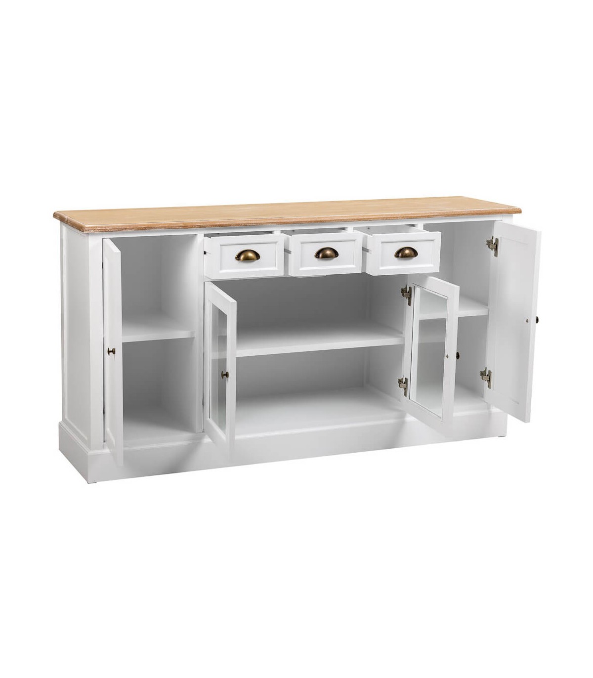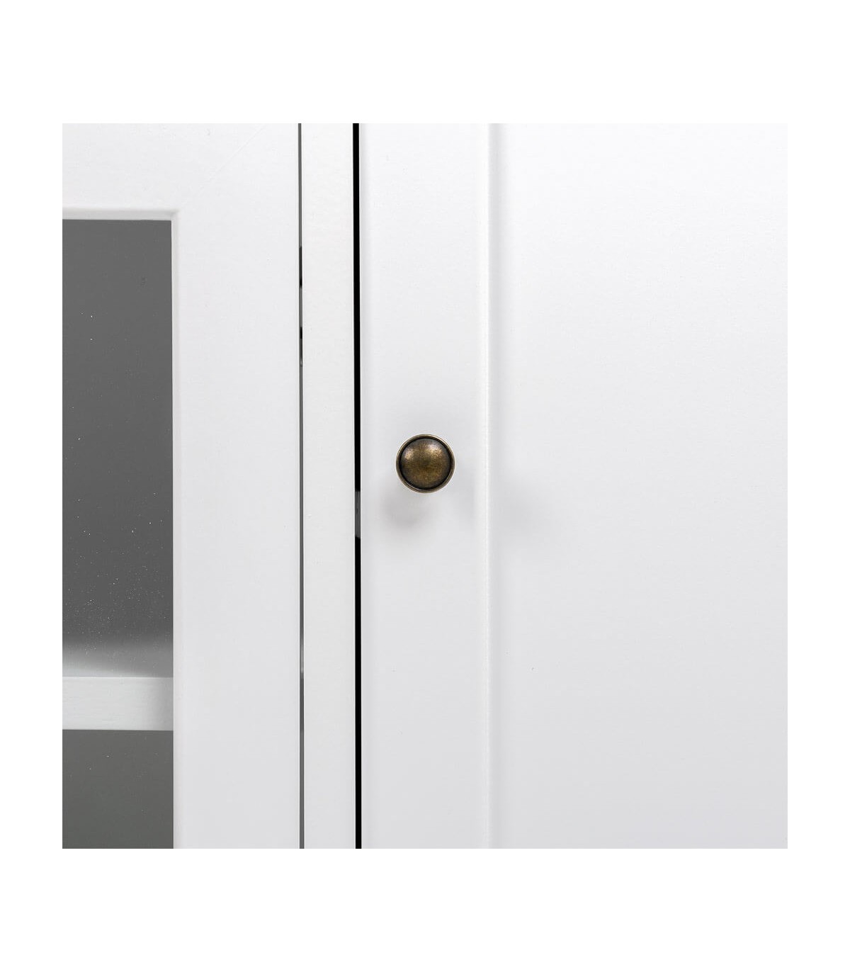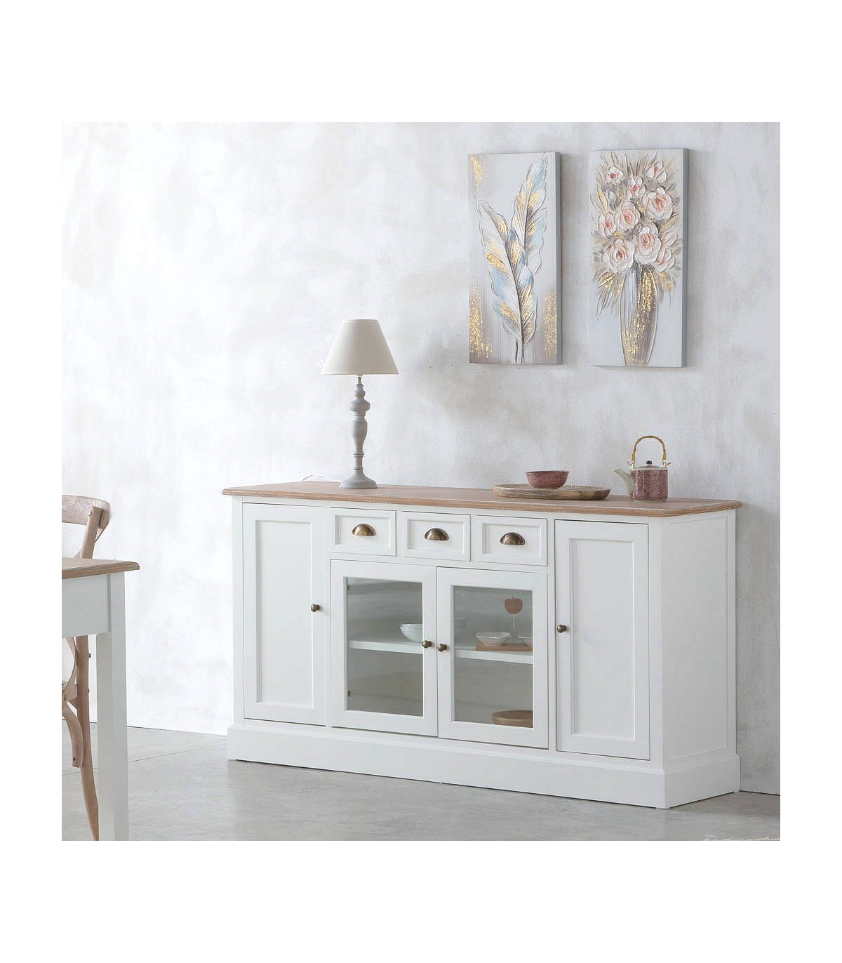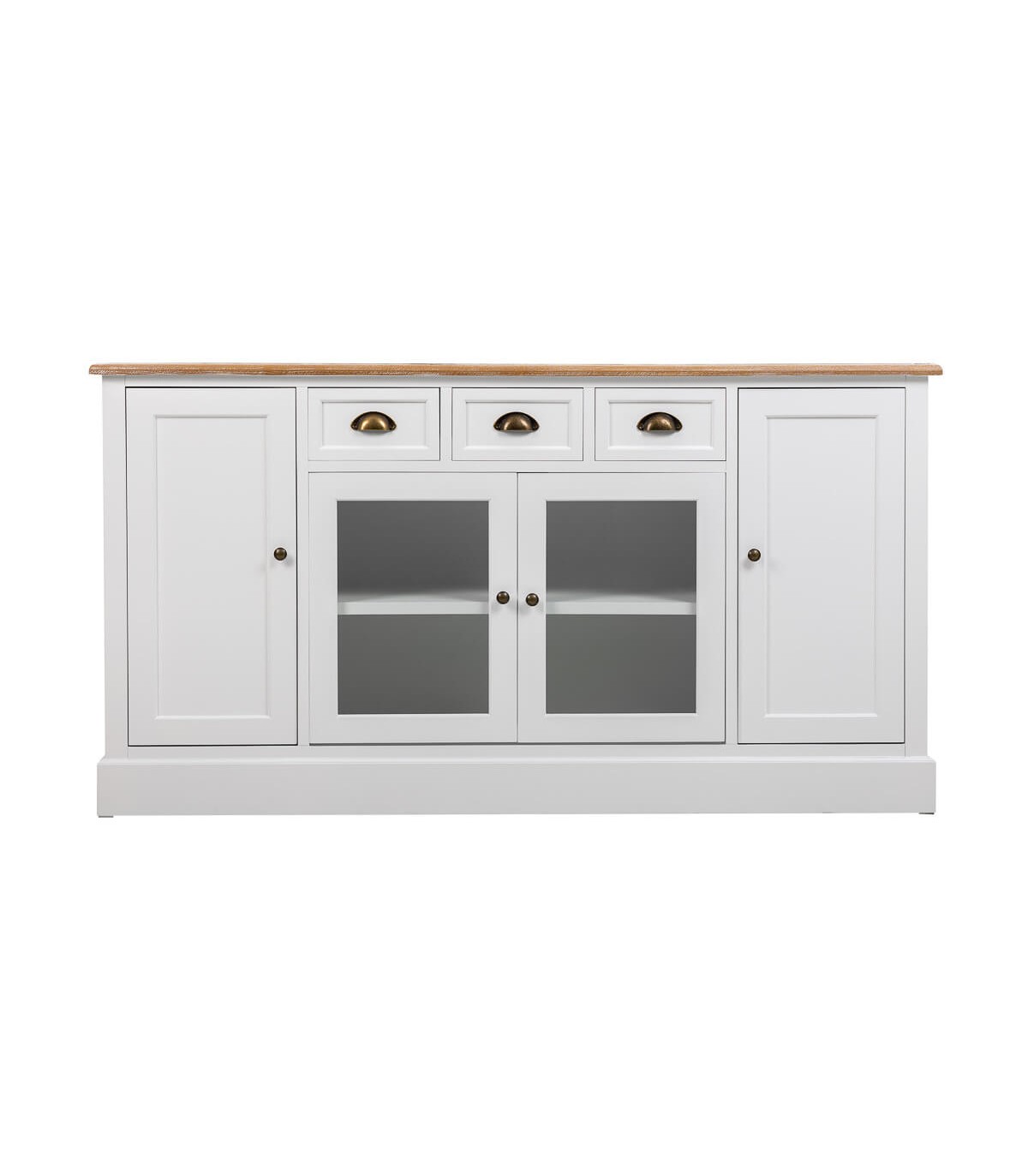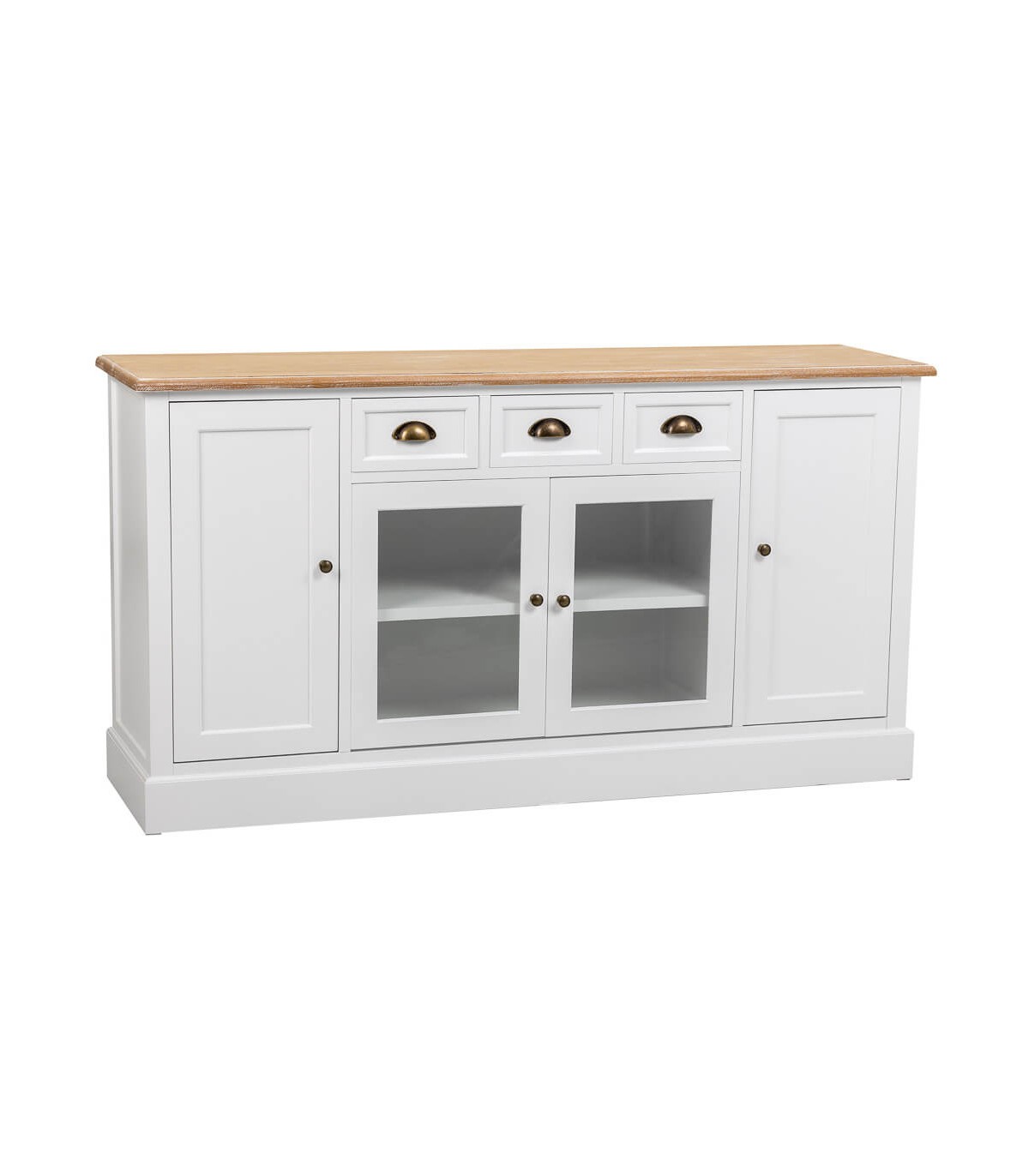 Aparador con vitrina de nuestra colección Mirlo, una colección que se caracteriza por su luminosidad, realizada en madera lacada en blanco con la tapa en madera natural patinada en blanco, de líneas rectas con el contraste del tirador tipo concha en metal acabado bronce, una colección de muebles auxiliares con los que podrás darle un toque rústico mediterráneo a cualquier estancia de tu hogar.