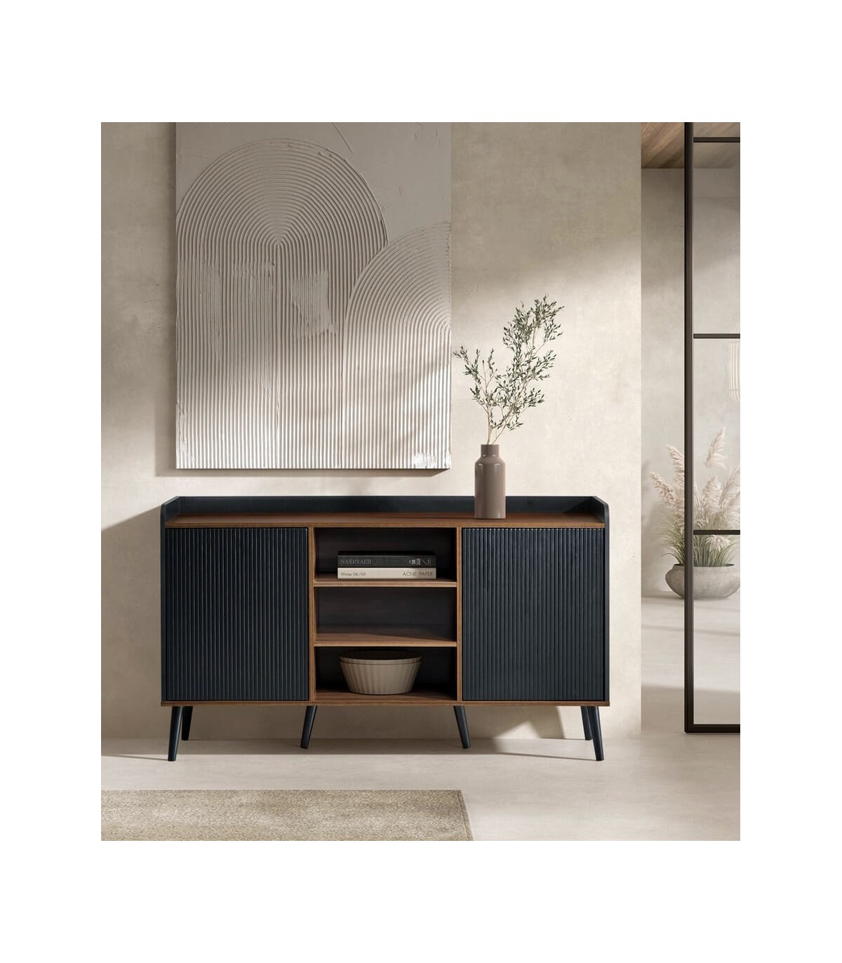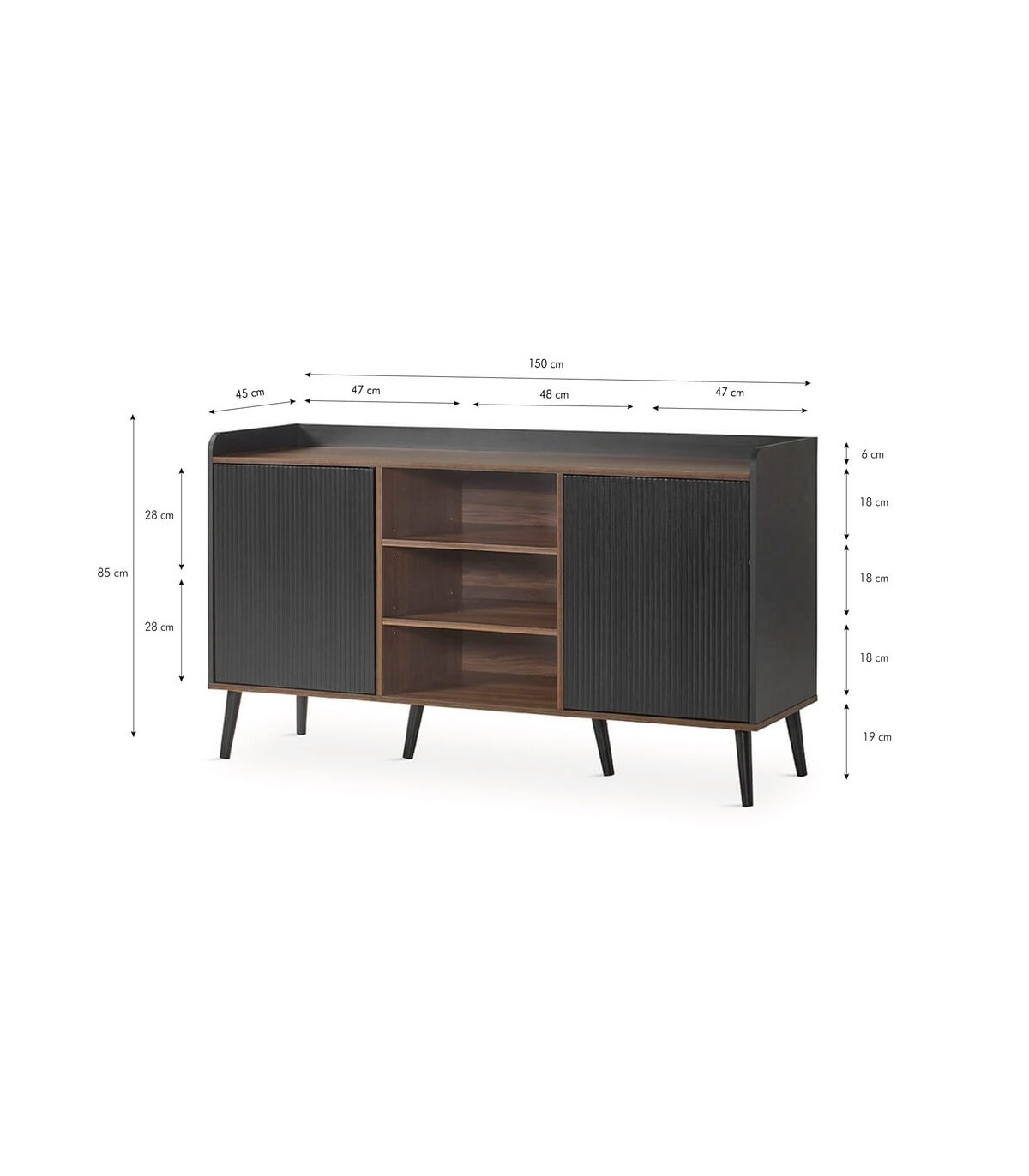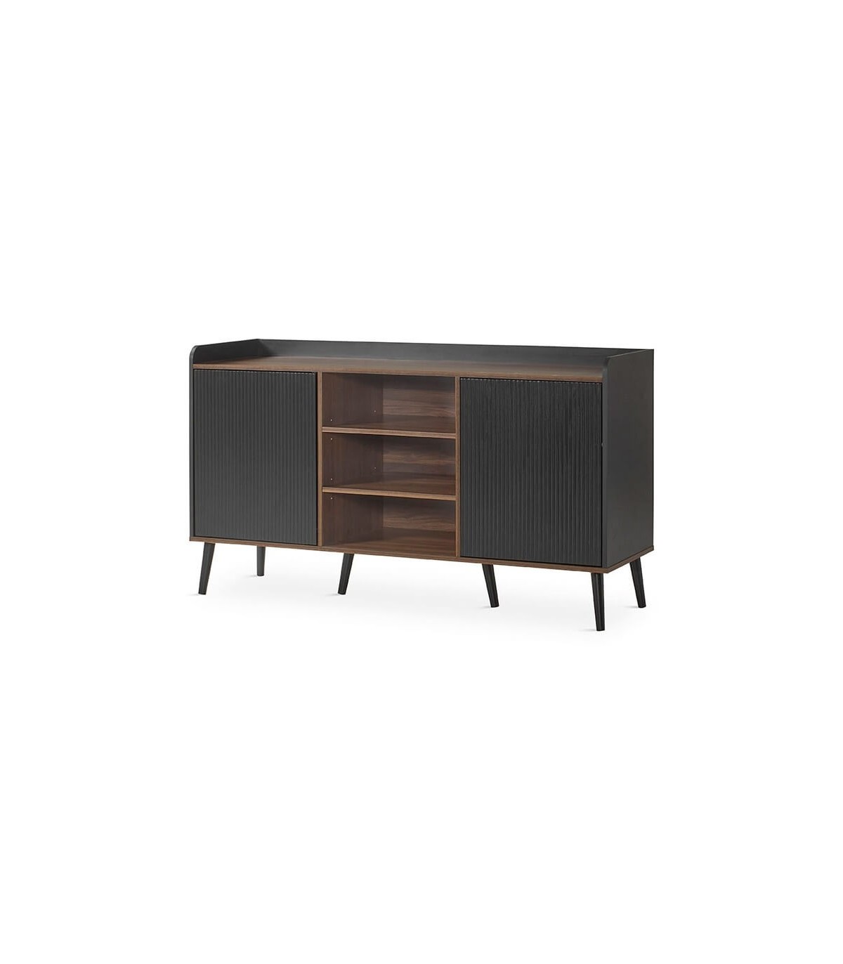 Aparador realizado en madera mdf imitación nogal y negro, patas en madera color negro, con 2 puertas y una zona central de baldas, un aparador muy práctico y original.