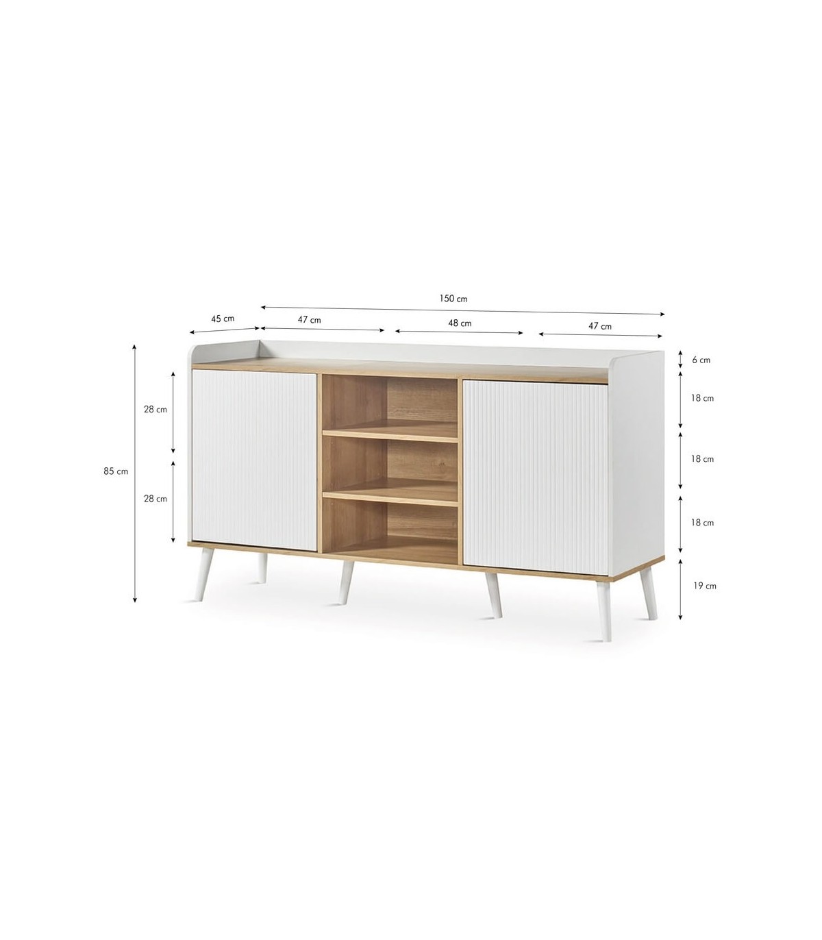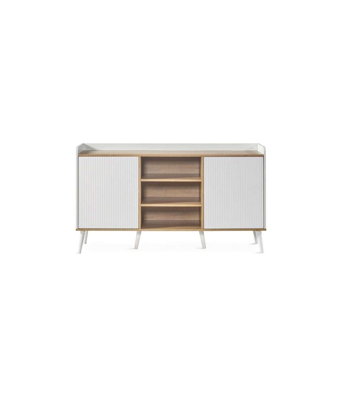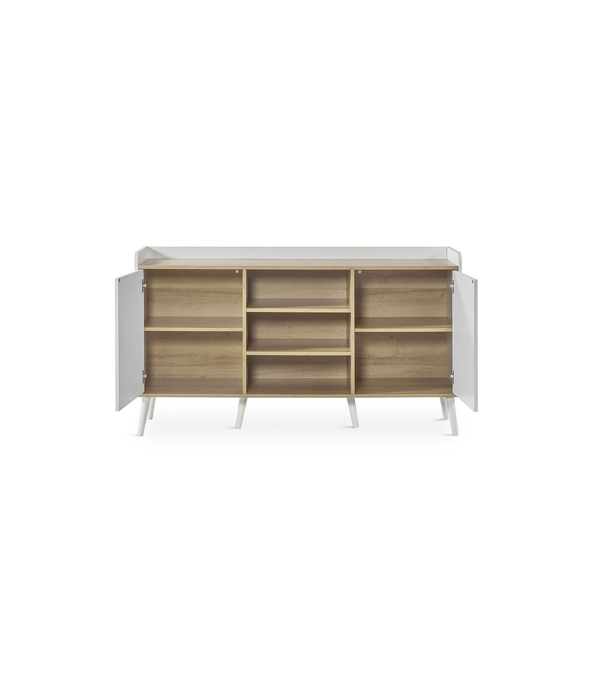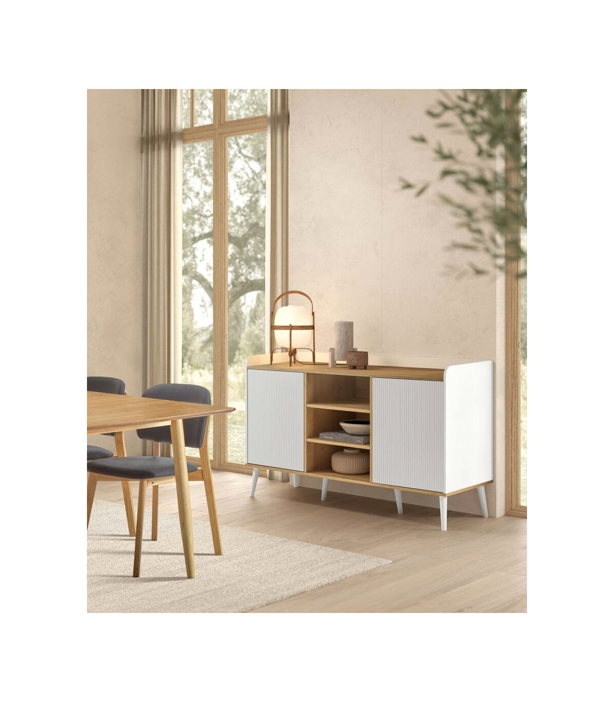 Aparador realizado en madera mdf imitación roble natural y blanco, patas en madera natural, con 2 puertas y una zona central de baldas, un aparador muy práctico y actual.