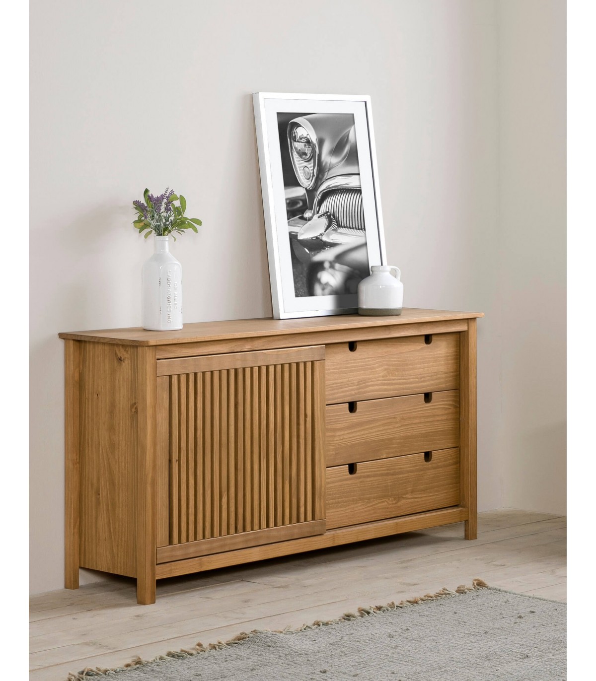 Aparador de estilo nuevo rústico realizado en madera maciza de pino acabado natural con 1 puerta corredera y 3 interiores, de buena presencia y capacidad, la madera maciza natural le da un aspecto muy fresco y actual.