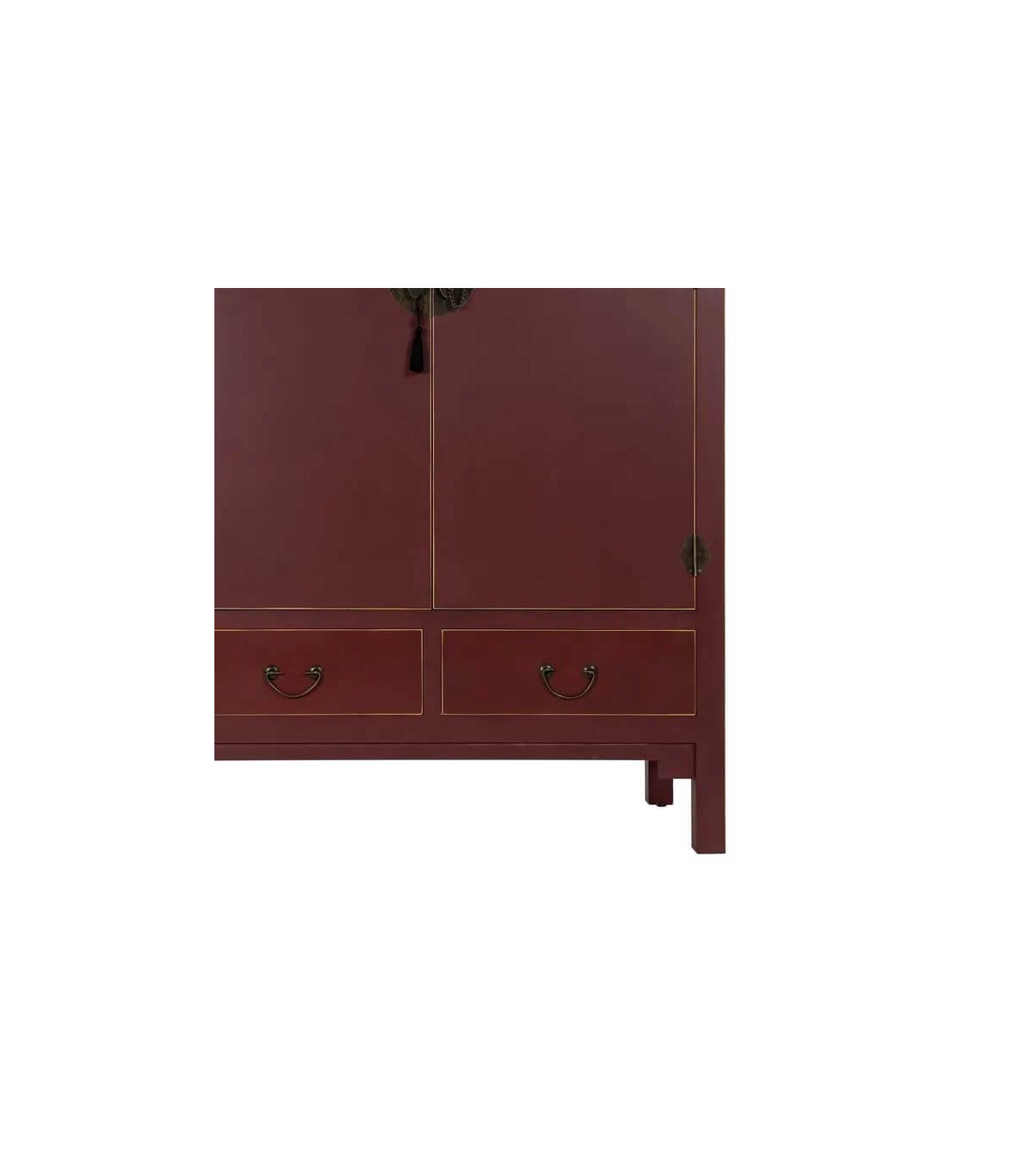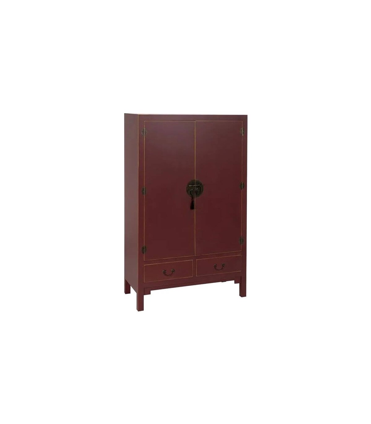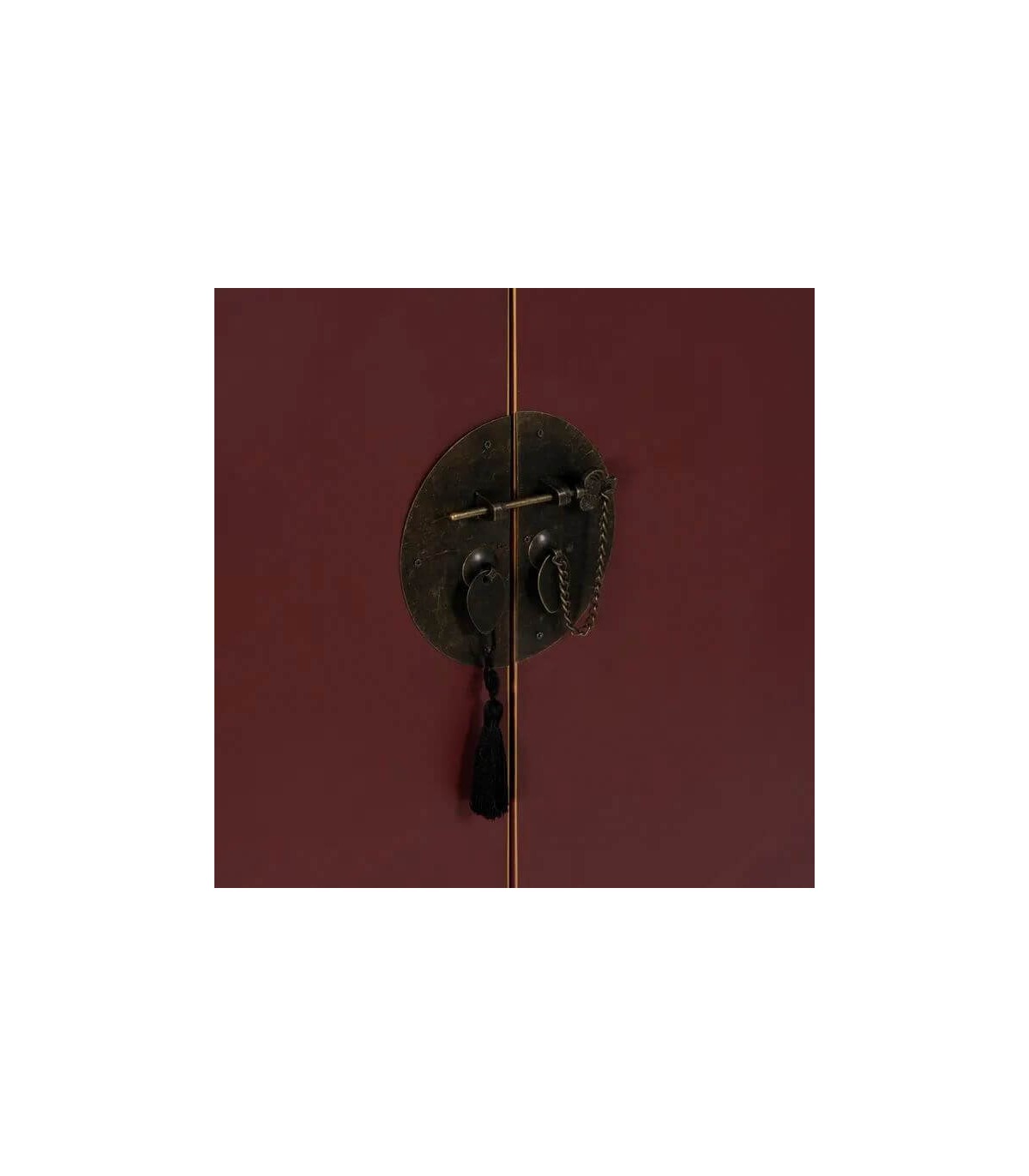 Armario alacena de estilo oriental, acabado en color granate con los cantos perfilados en oro, con dos puertas y dos baldas interiores y un cajón, sus característicos tiradores que acentúan el estilo, un mueble de gran capacidad muy decorativo.