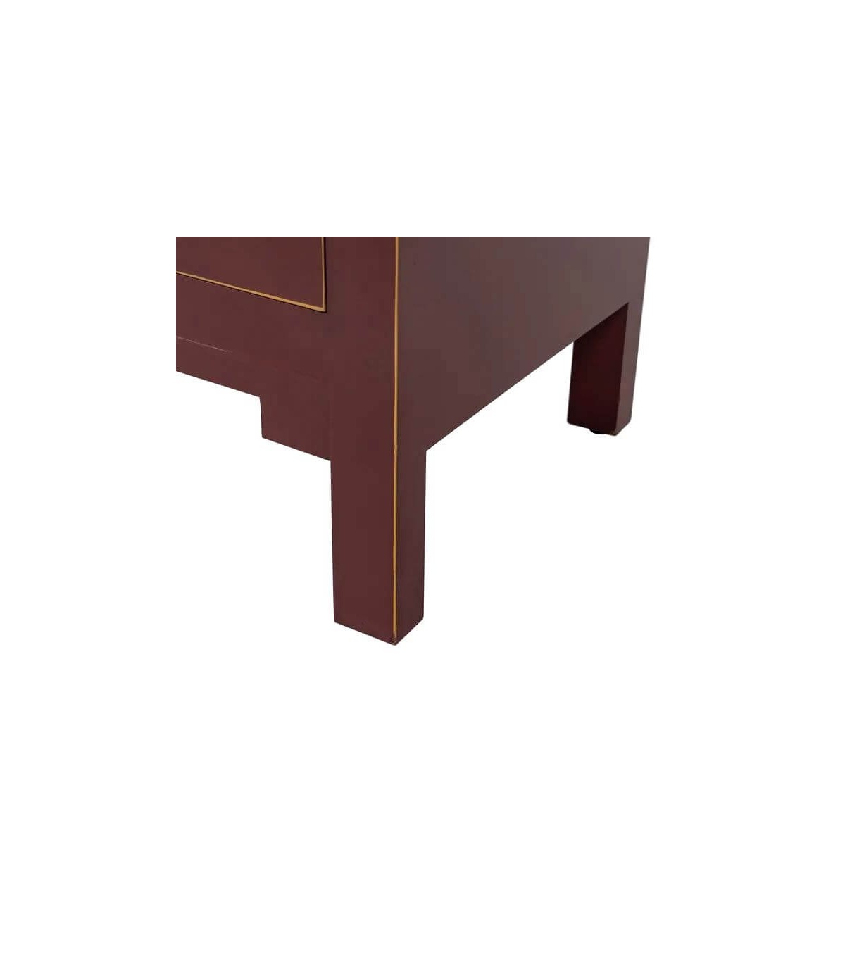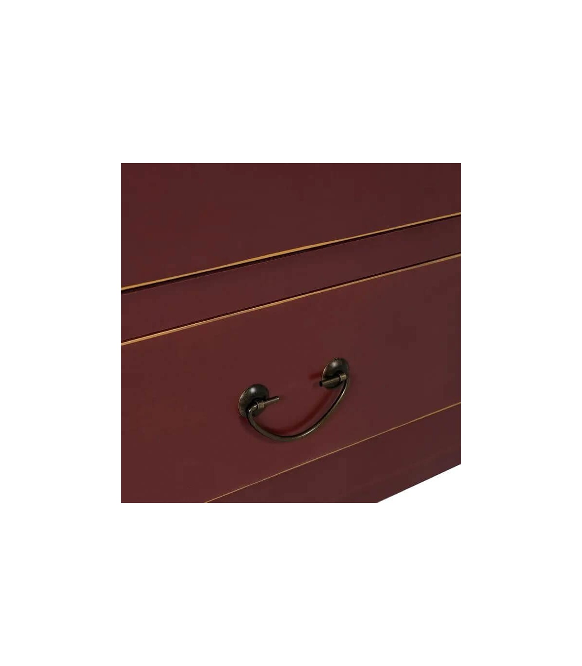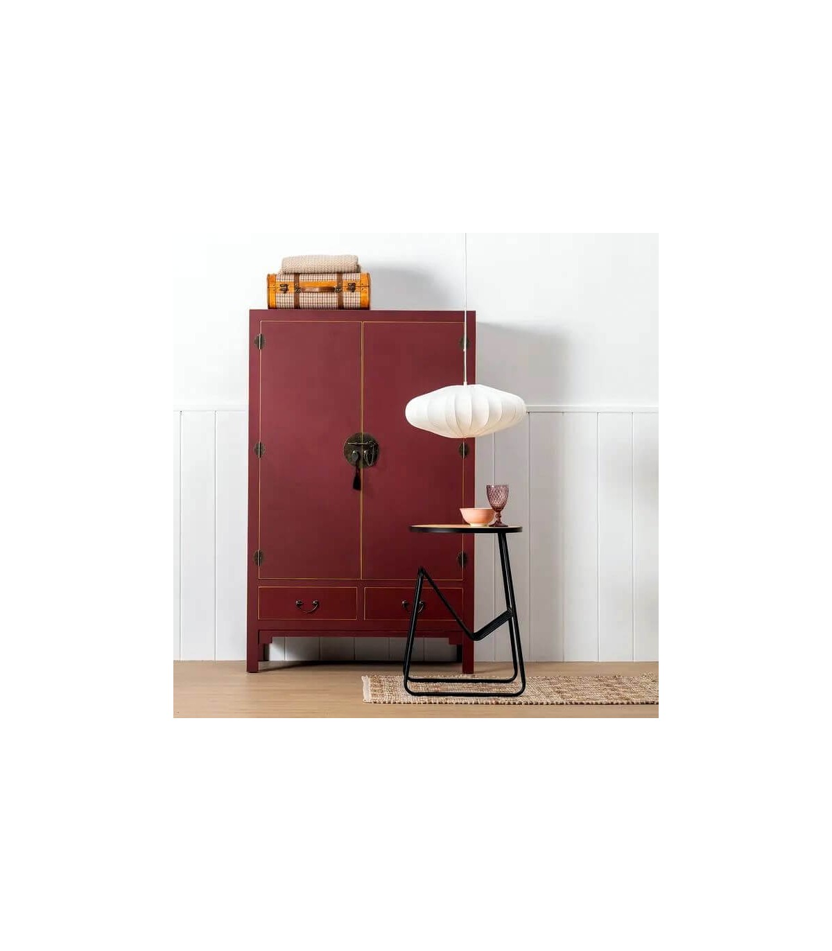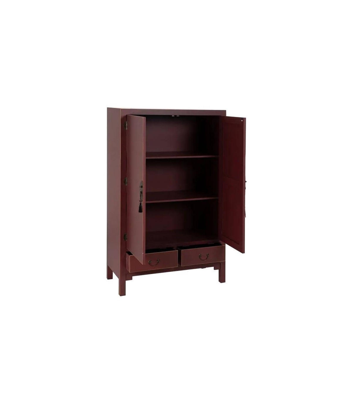 Armario alacena de estilo oriental, acabado en color granate con los cantos perfilados en oro, con dos puertas y dos baldas interiores y un cajón, sus característicos tiradores que acentúan el estilo, un mueble de gran capacidad muy decorativo.