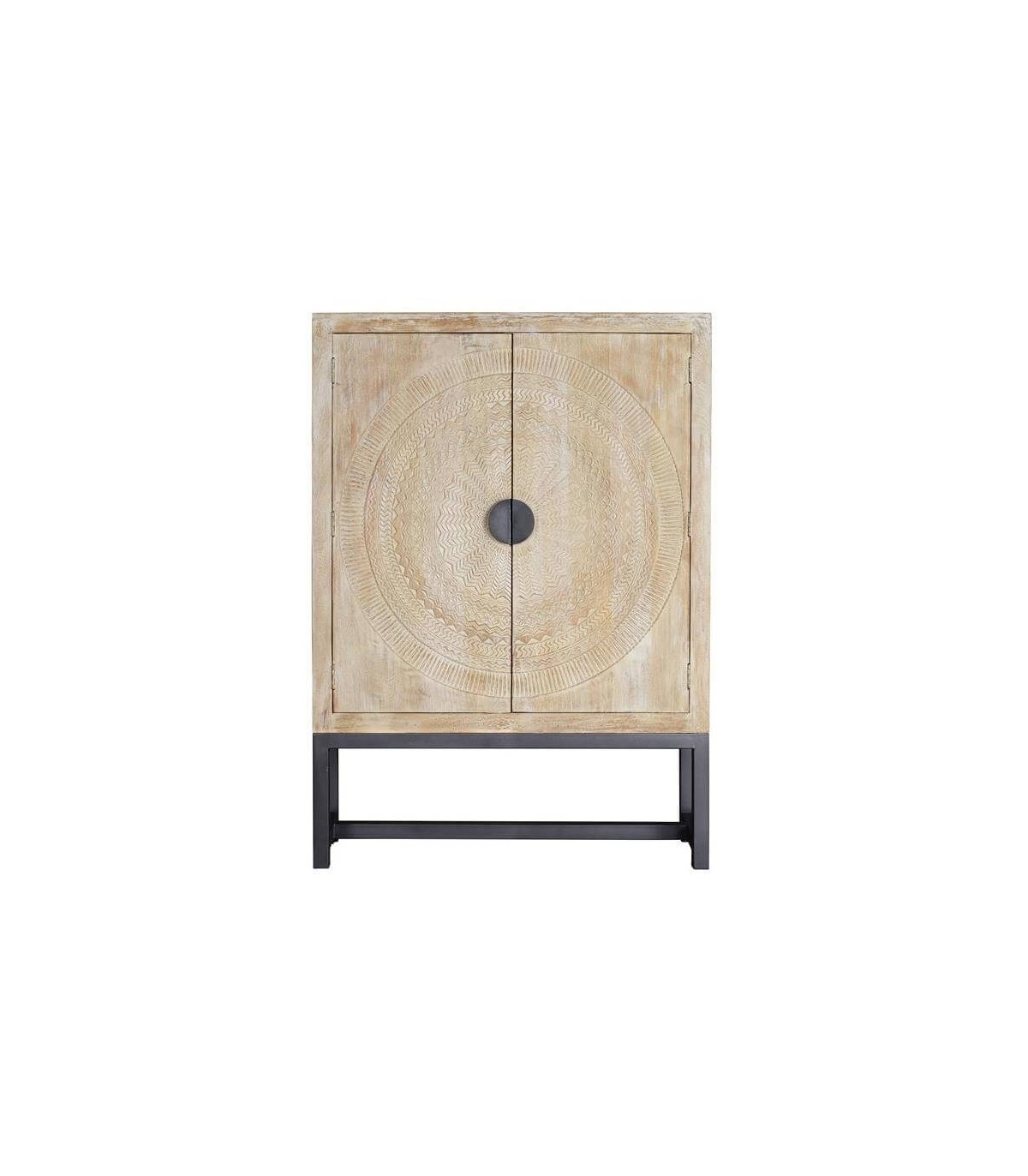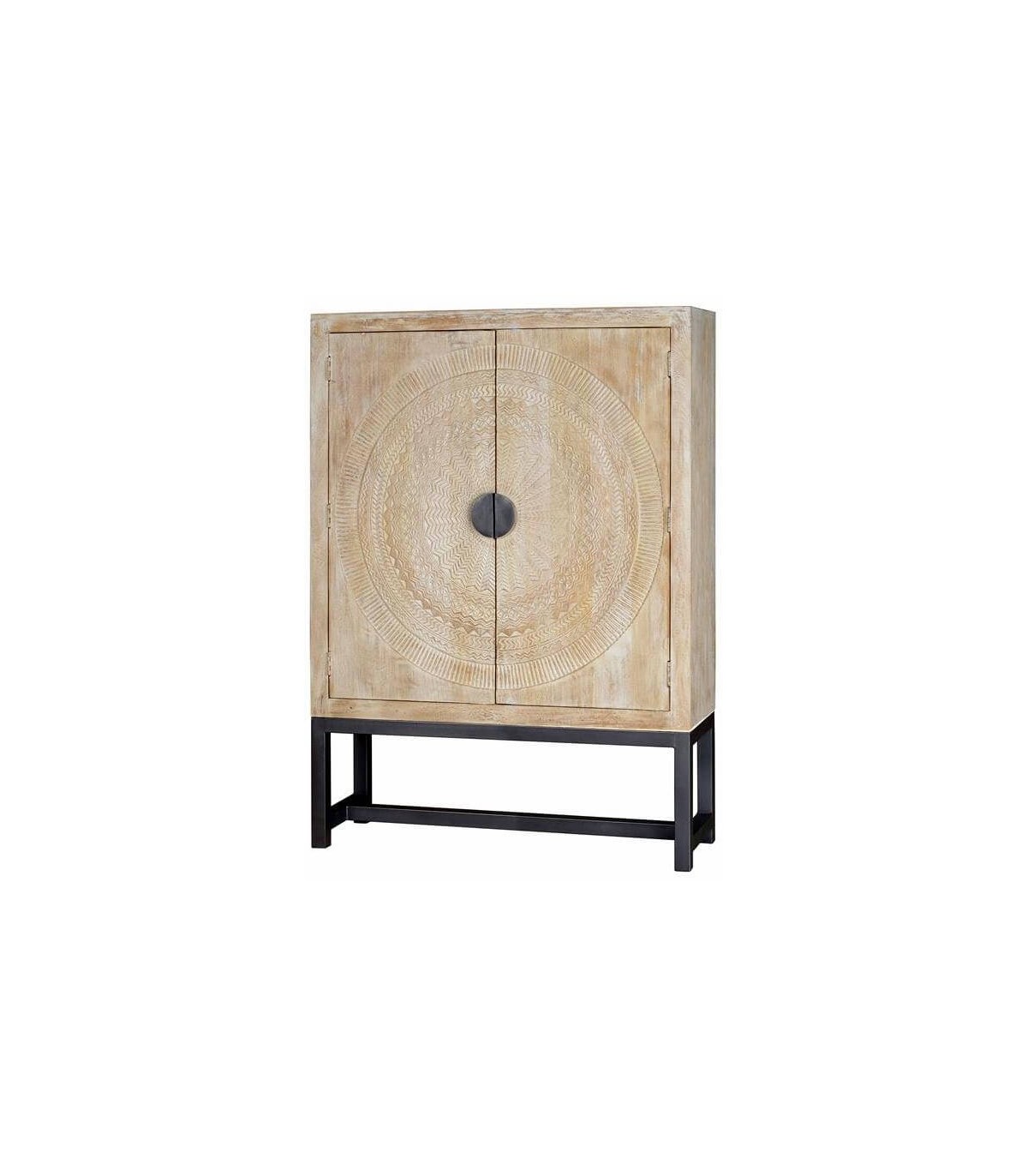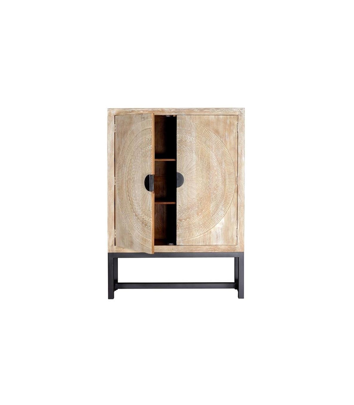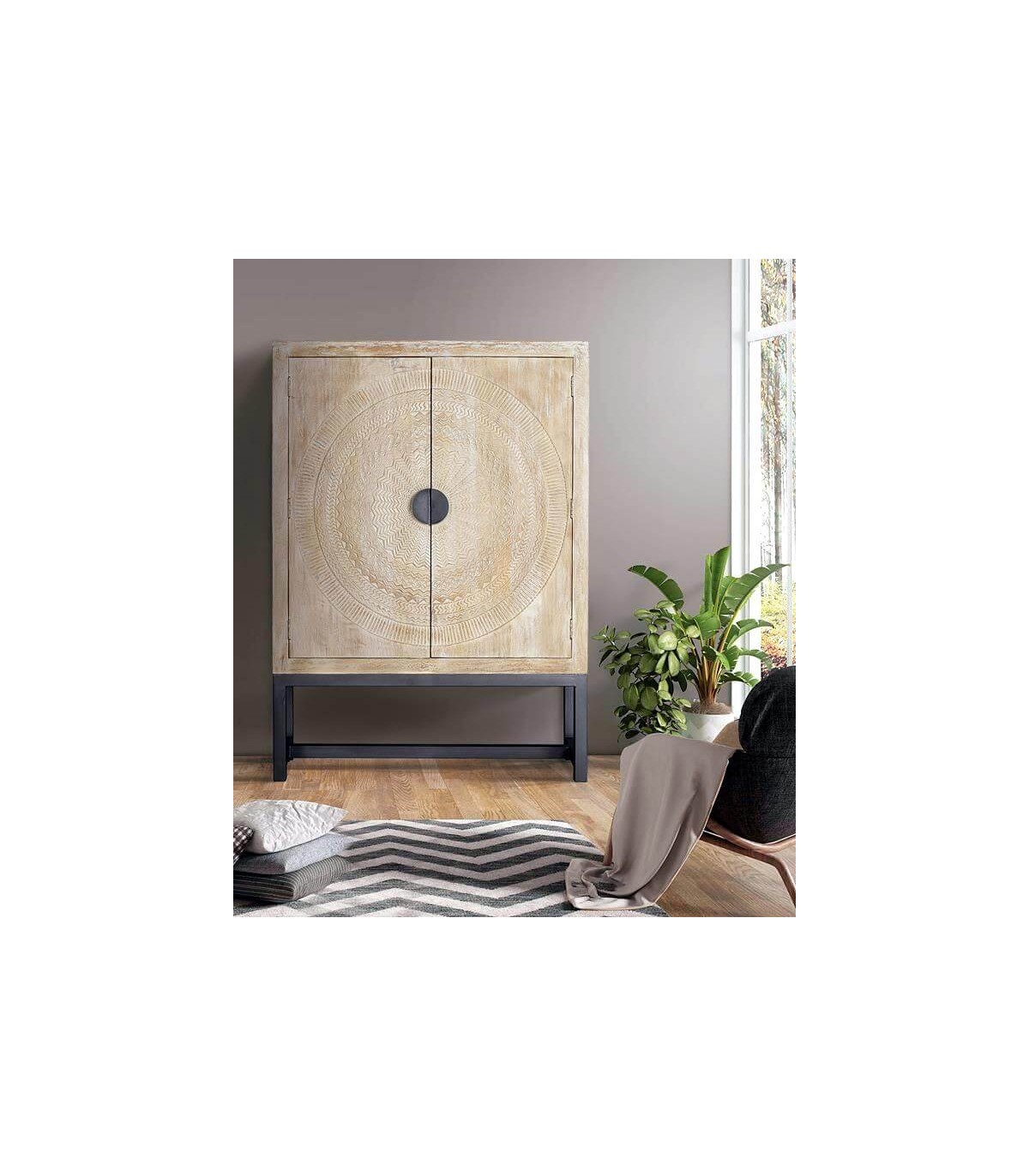 Armario alacena , un mueble realizado en la india, en madera maciza de mango tallado a mano, el contraste entre la madera en estado natural y el metal acabado negro consigue una mezcla perfecta entre el estilo étnico y el industrial.