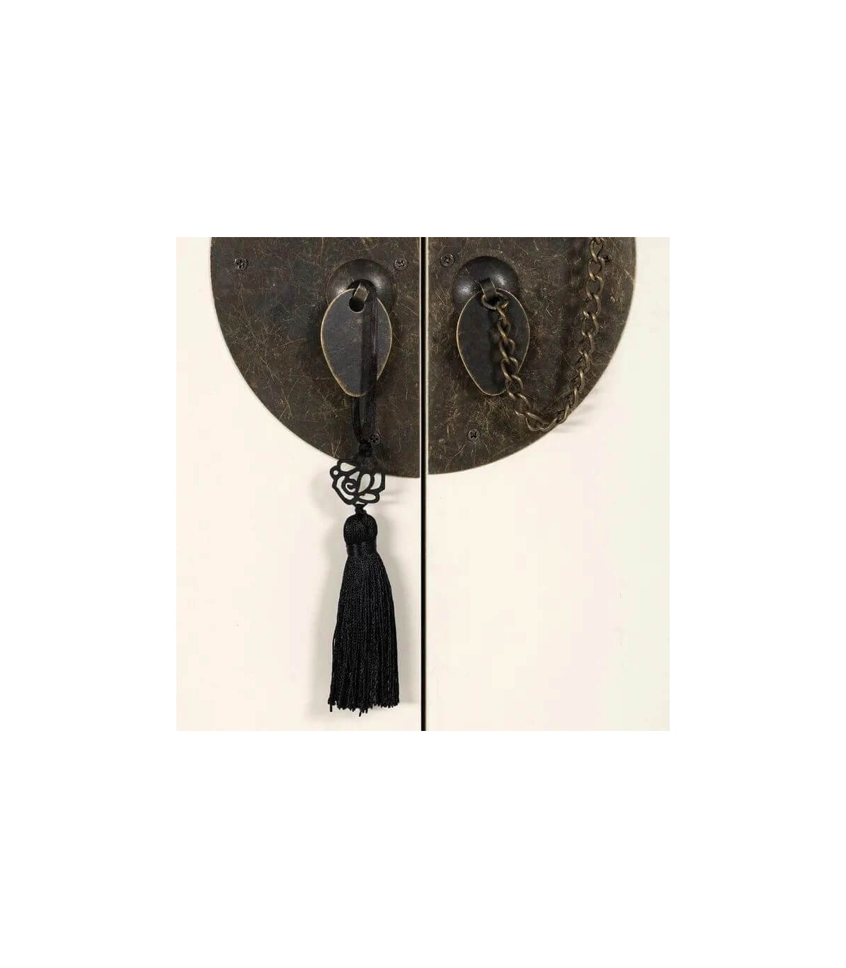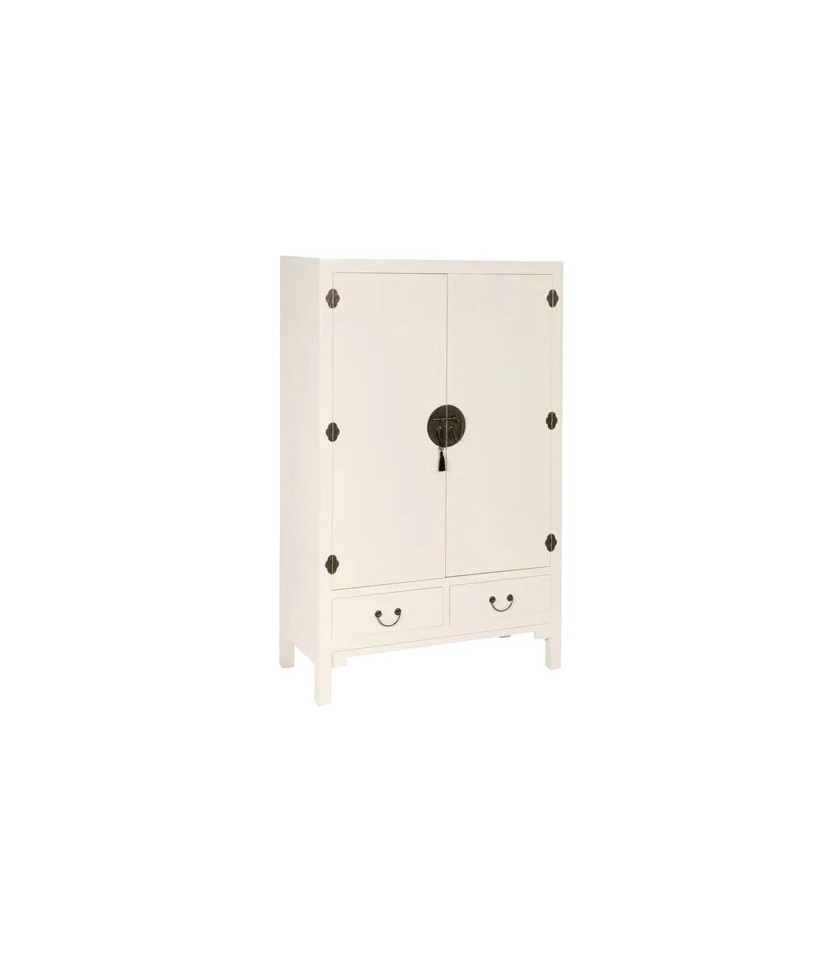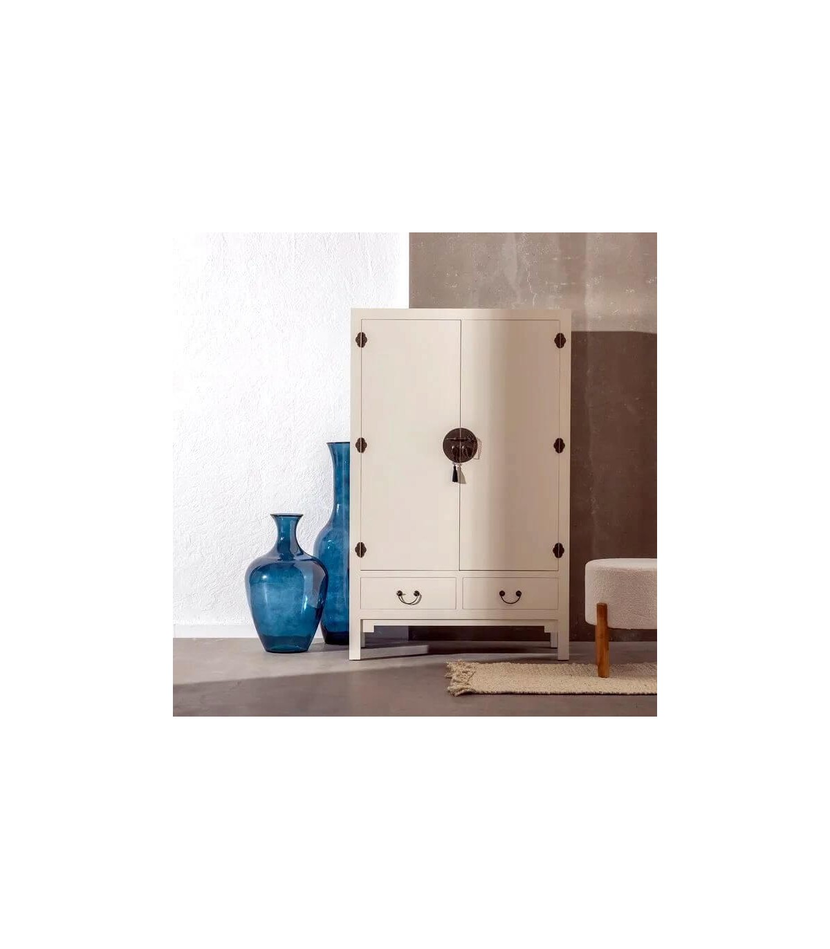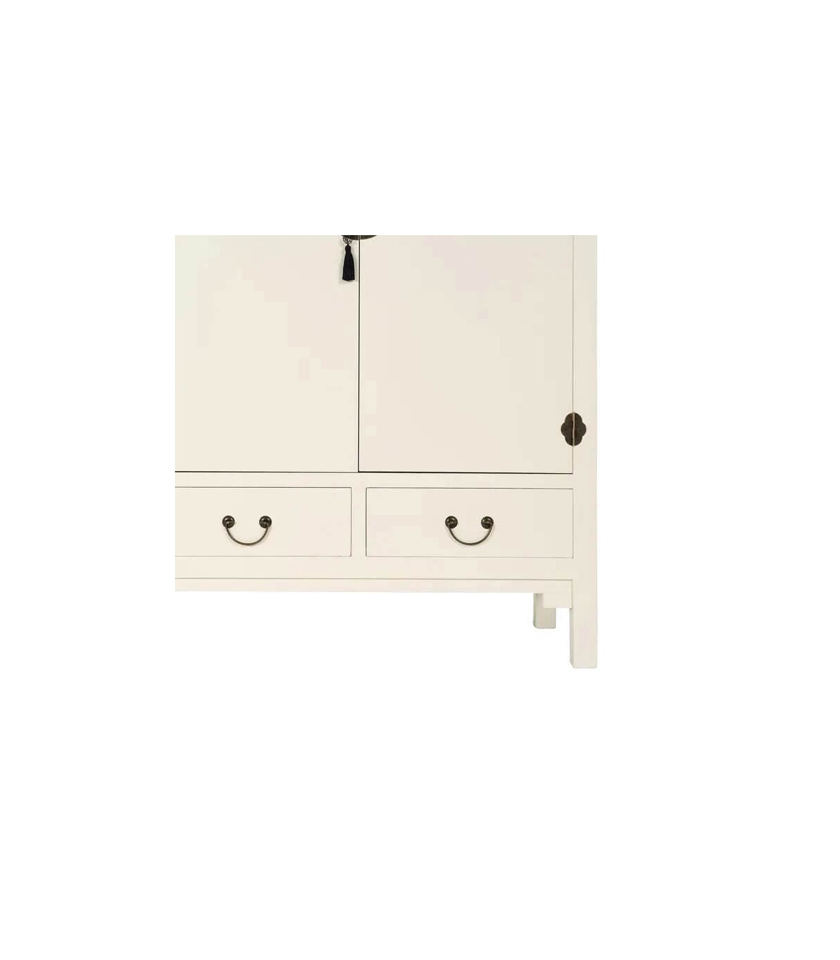 Armario alacena de estilo oriental, con 2 puertas y 2 cajones acabado blanco roto con el herraje característico en bronce y una filigrana negra como detalle la hará la pieza diferencial de capacidad dentro de tu decoración. Perfecta para ropa blanca.