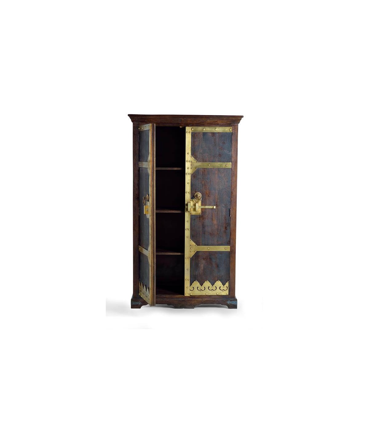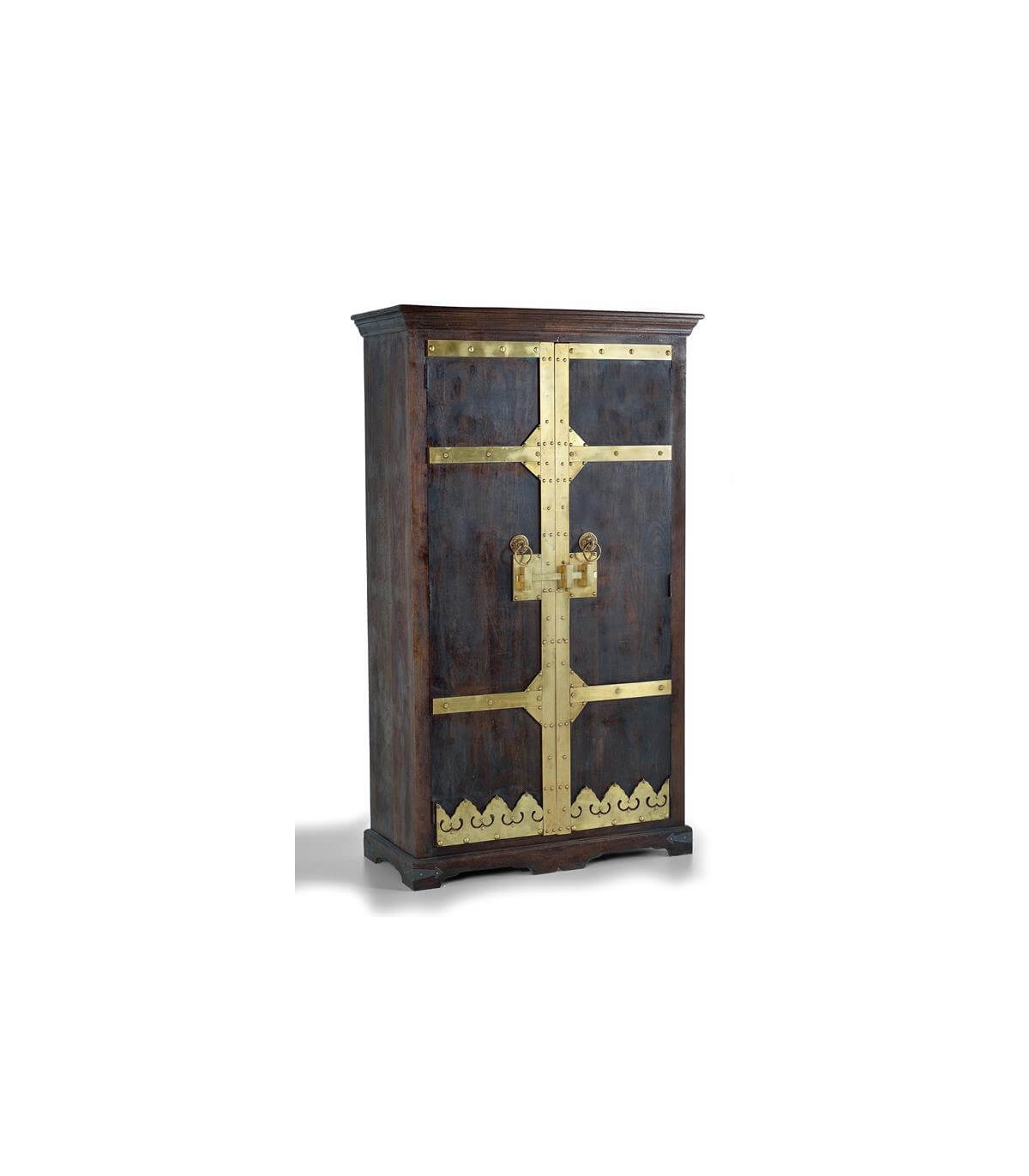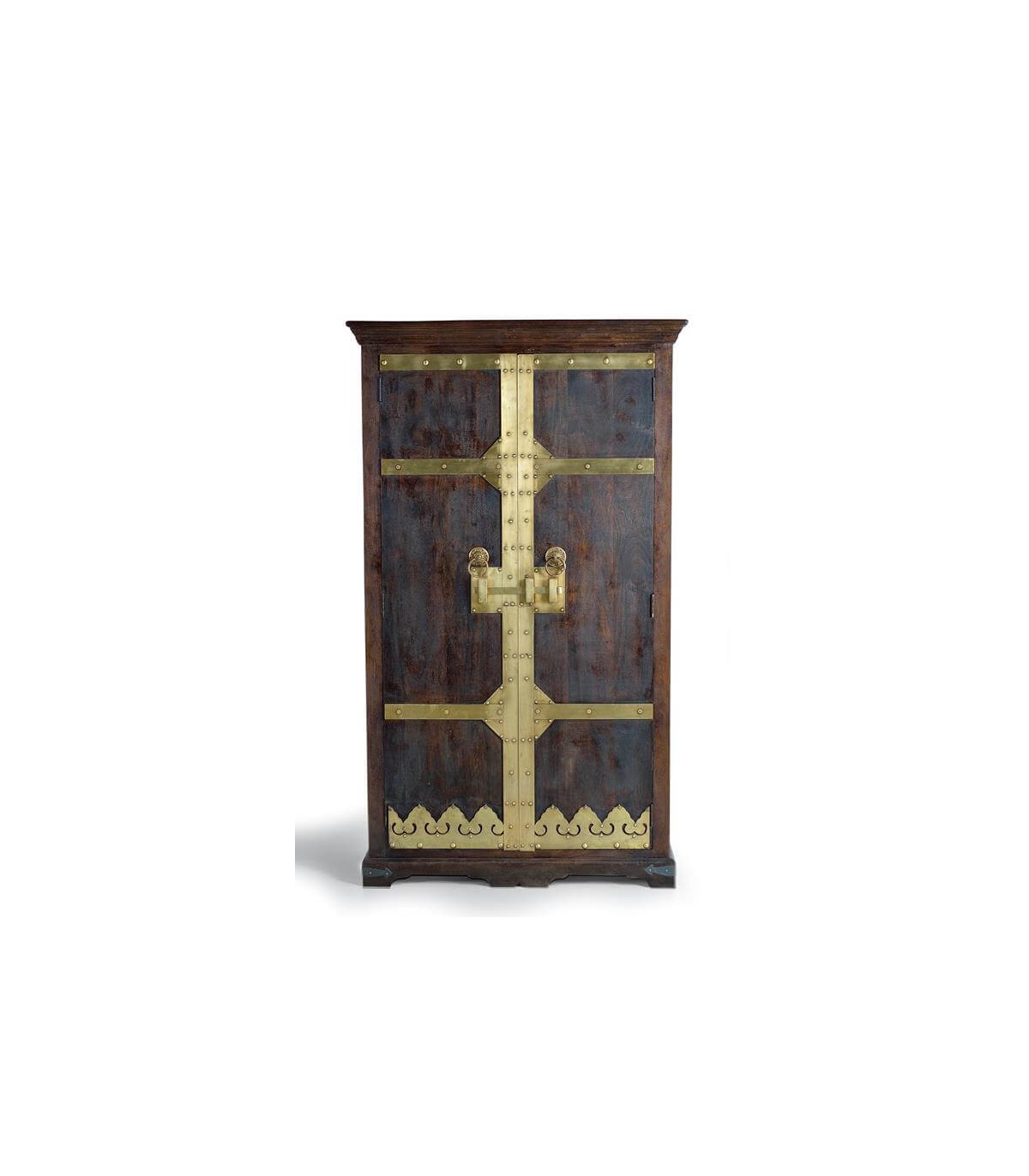Armario alacena con 2 puertas de estilo étnico, realizado en madera de mango teñida en color nogal con aplicaciones en bronce, un mueble de gran capacidad de calidad realizado a mano, adaptable a cualquier tipo de decoración.