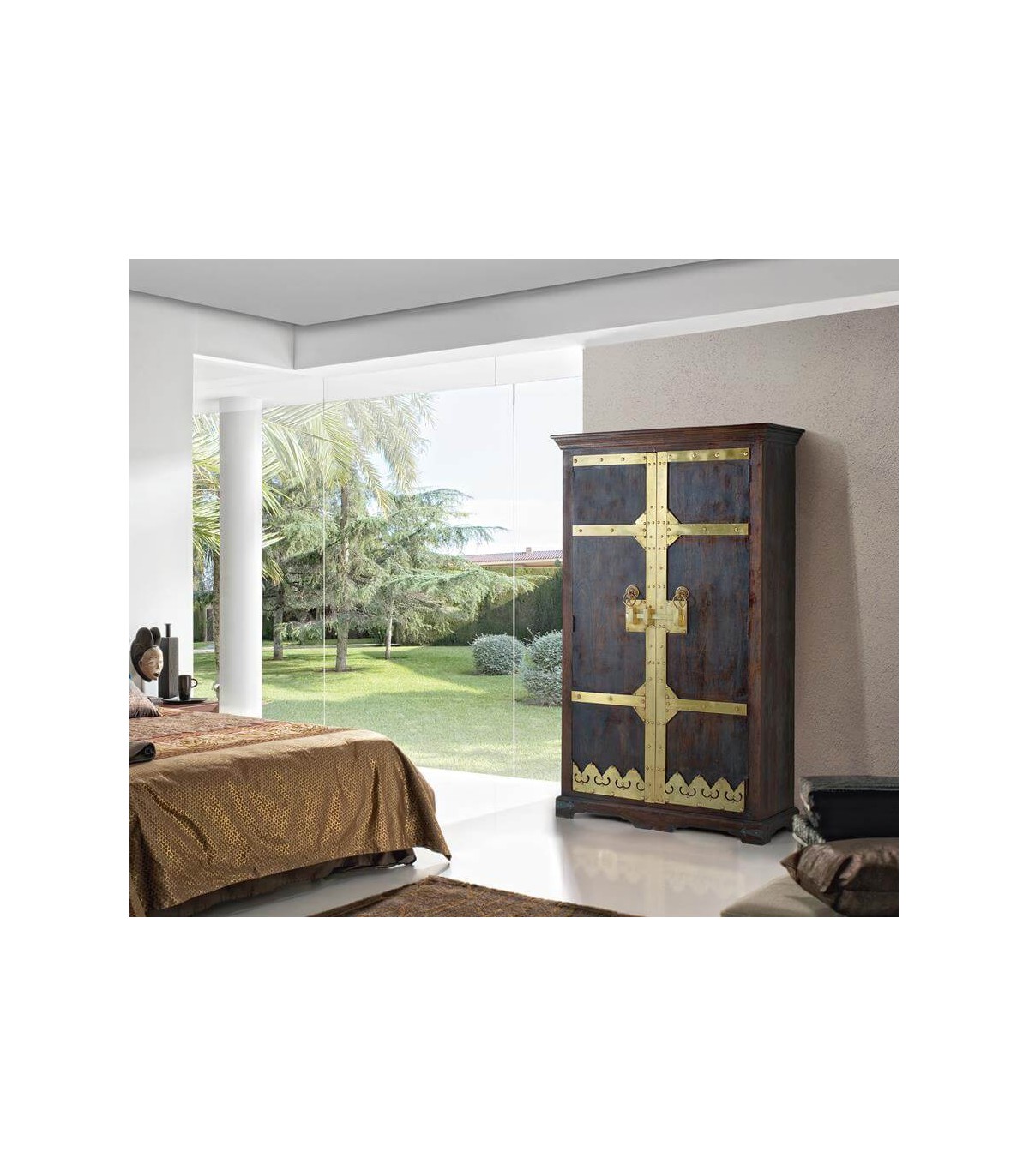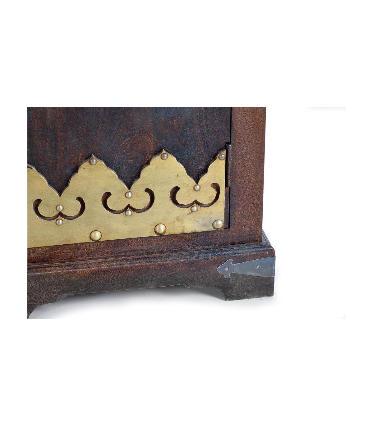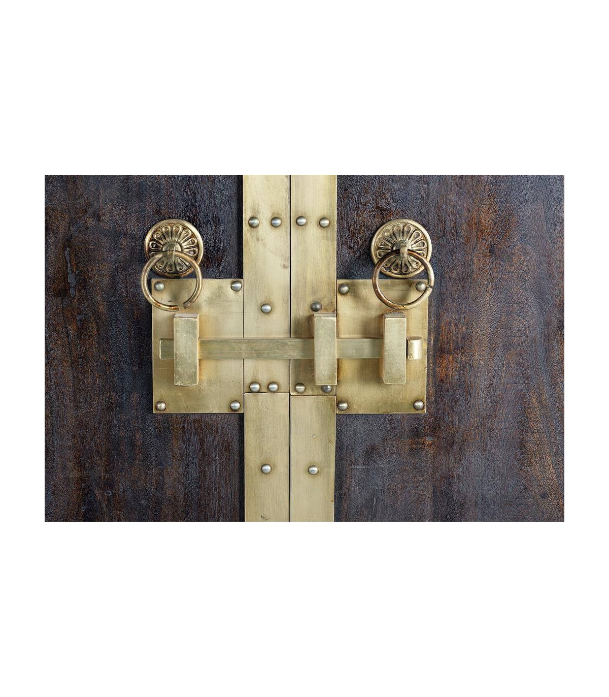 Armario alacena con 2 puertas de estilo étnico, realizado en madera de mango teñida en color nogal con aplicaciones en bronce, un mueble de gran capacidad de calidad realizado a mano, adaptable a cualquier tipo de decoración.
