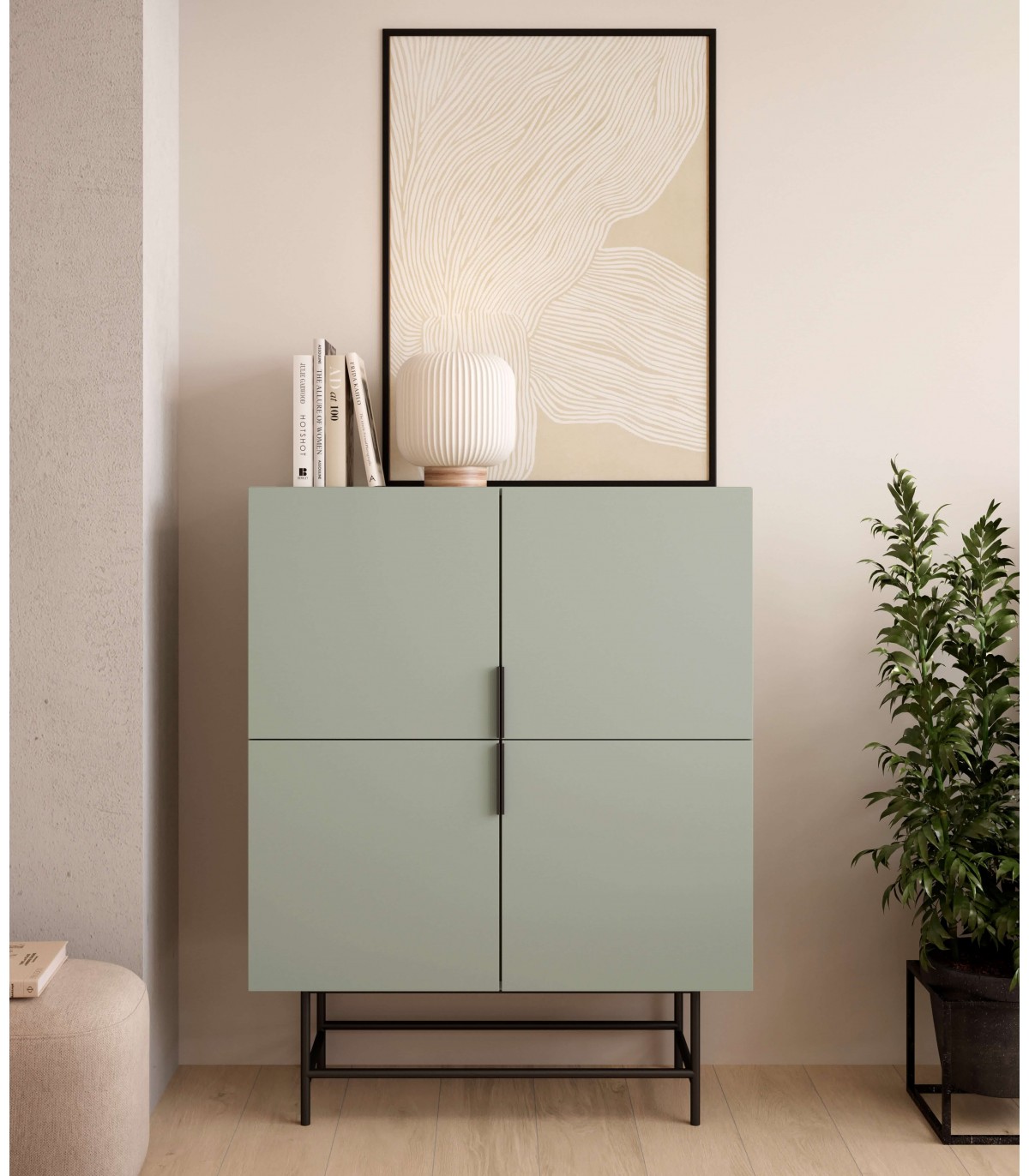 Este armario alacena bajo de estilo moderno es perfecto para quienes buscan una combinación de diseño y funcionalidad. Fabricado en melamina color verde, con patas y tiradores en metal negro, aporta un aire contemporáneo y elegante a cualquier estancia.