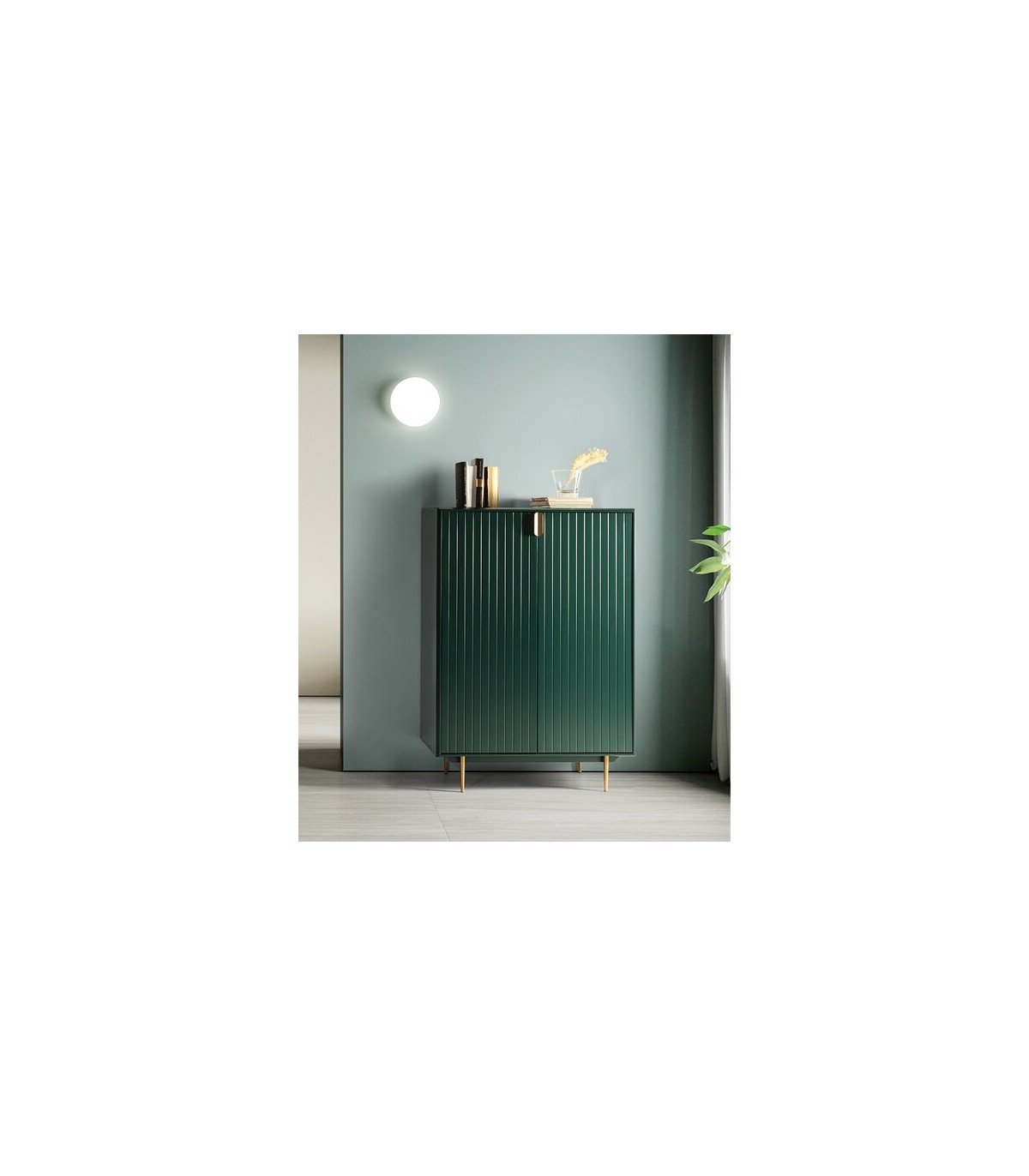 Bonito armario realizado en madera lacada en verde satinado, patas en metal dorado, con 2 puertas de estilo moderno, un armario perfecto para darle un toque de color a tu decoración.