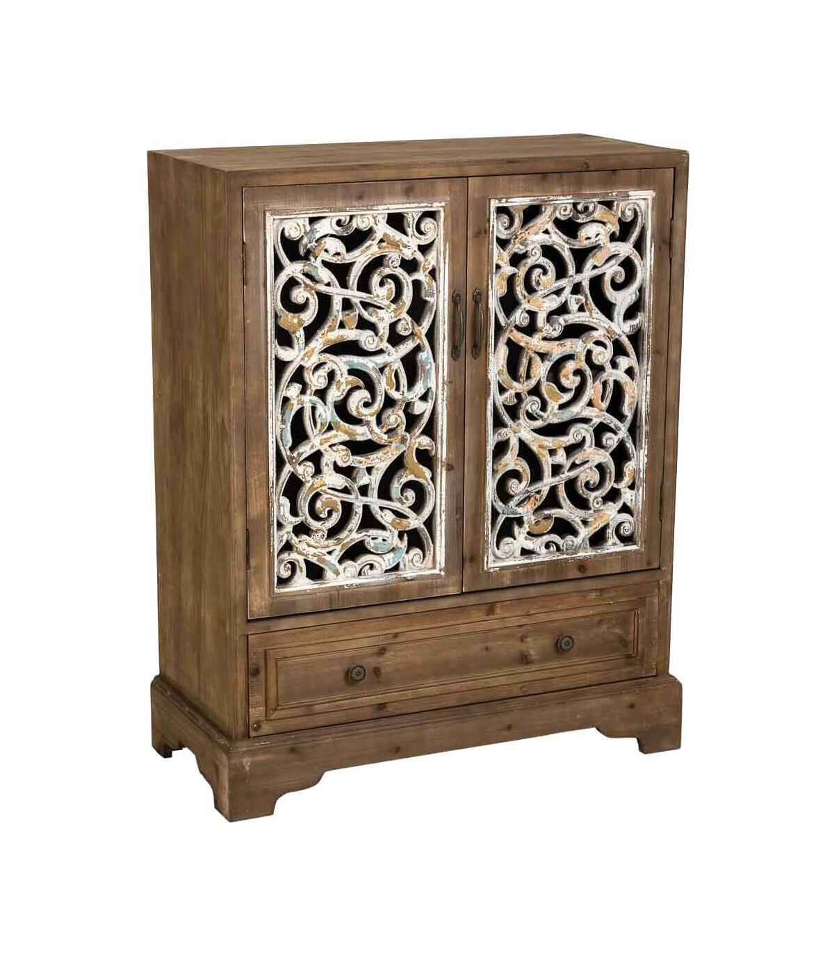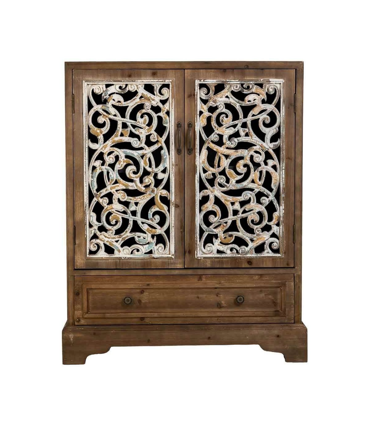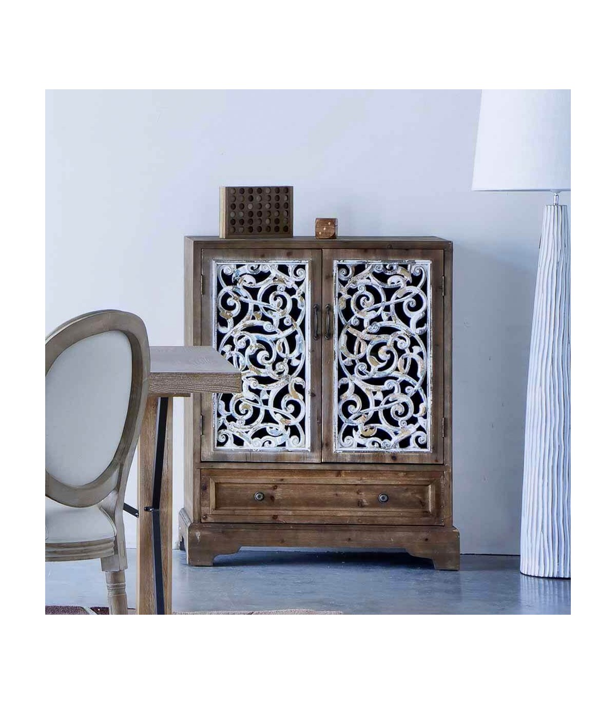 Armario de estilo clásico, realizado en madera de abeto teñida en color nogal vintage con las puertas talladas a mano acabado blanco decapado, tiradores bronce, ideal como mueble bar, un mueble con mucha personalidad.