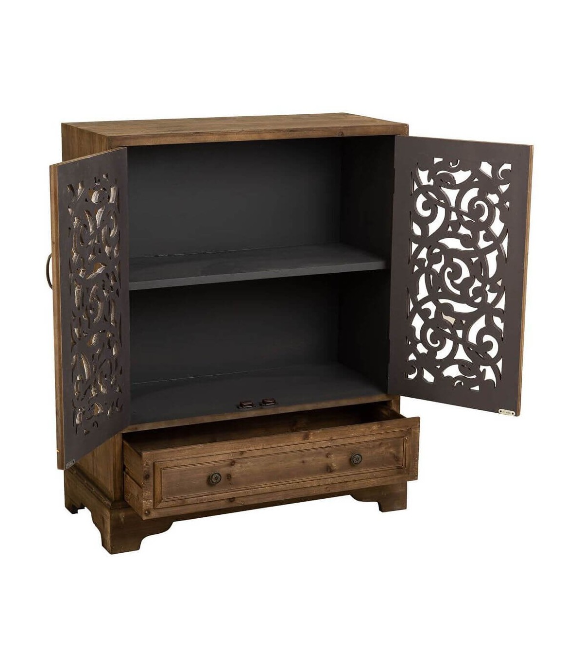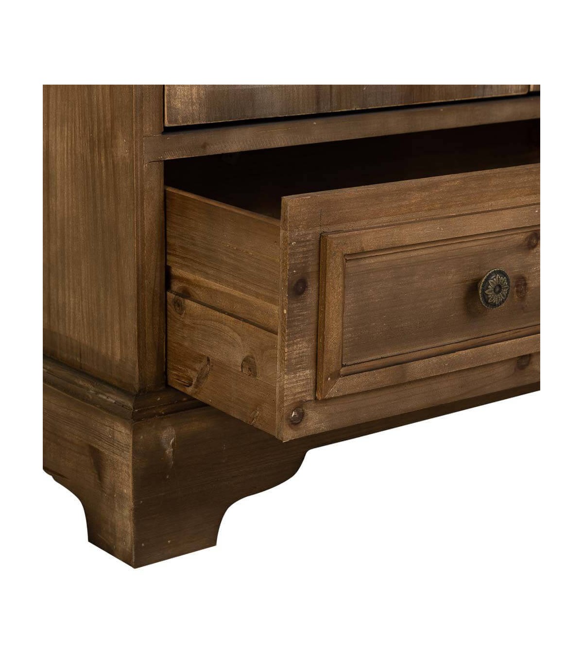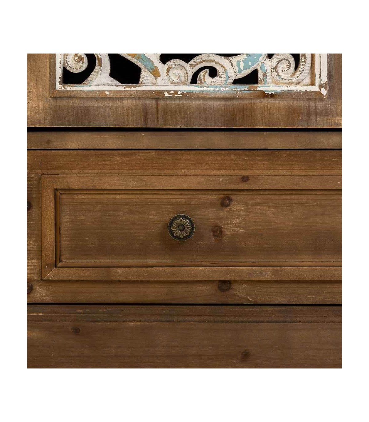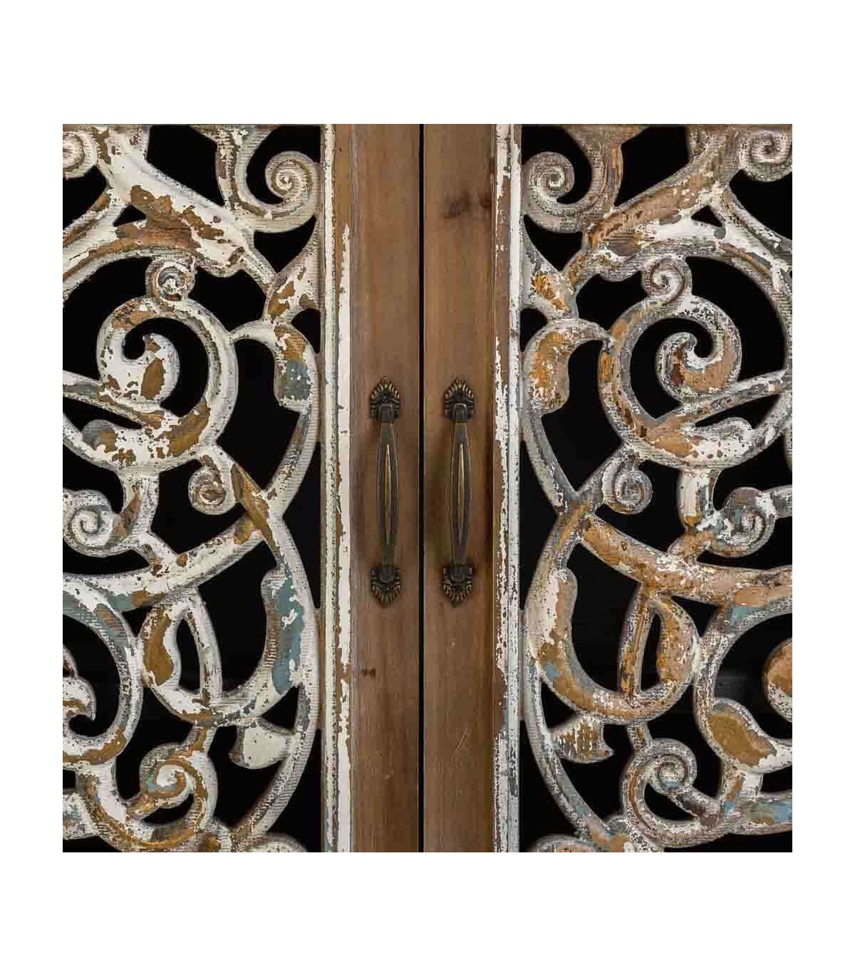 Acabado, madera color nogal vintage, puertas talladas a mano acabado blanco decapado, tiradores bronce. Fabricación artesanal. entendemos las variaciones de tonalidad, tamaño y forma o ciertas imperfecciones (grietas, nudos, marcas) como un valor añadido que la convierten en pieza única.