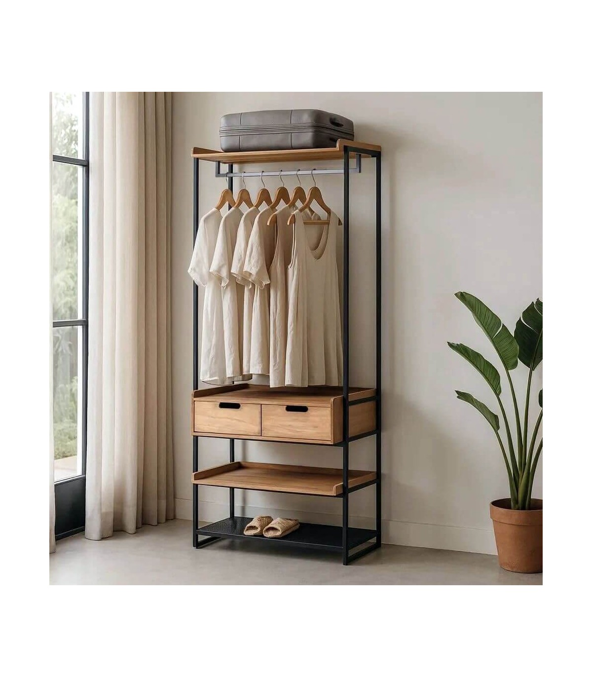 Incluye una barra superior para colgar prendas, dos cajones frontales para accesorios y estantes abiertos para complementar el almacenaje. Una pieza versátil y ligera visualmente que se integra con facilidad en dormitorios, vestidores o espacios modernos con carácter funcional y decorativo.