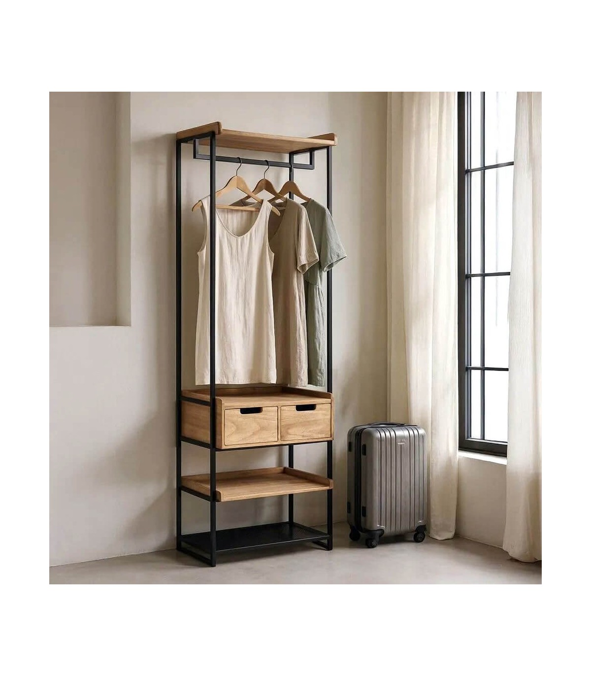 Incluye dos amplios cajones inferiores y una práctica barra para colgar ropa, facilitando el orden diario sin renunciar al estilo. Su diseño recto y depurado lo hace ideal para dormitorios actuales o espacios tipo loft. Una pieza útil y decorativa que aporta calidez, orden y carácter al ambiente.