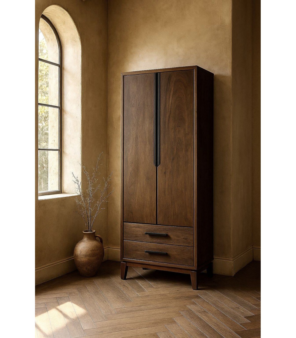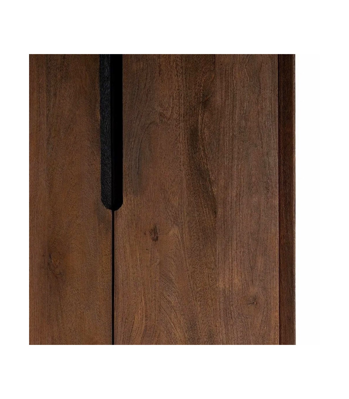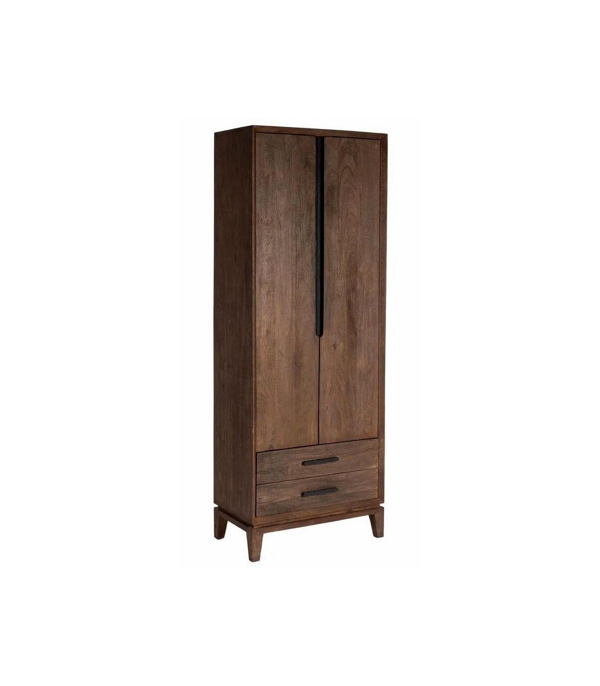 Este armario alacena estrecho de diseño sobrio y estructura vertical ofrece funcionalidad y estilo en espacios reducidos. Fabricado en madera maciza de mango, presenta dos puertas superiores para almacenaje cerrado y dos cajones inferiores que aportan practicidad adicional.